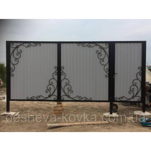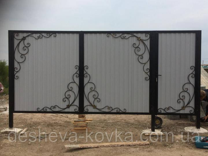 Кованые ворота из калиткой Код: А-0122 Мы изготовим ворота индивидуально по вашим размерам за 4 рабочих дня. Наши ворота производятся на современном оборудовании специалистами нашей компании, что гарантирует скорость и качество. Уличные ворота из профнастила отлично подходят для обустройства въезда во двор частного дома. Классические конструкции не зря пользуются спросом на протяжении нескольких веков: они хорошо выполняют свои функции, оставаясь простыми и удобными в использовании. Изделие может иметь любую форму и дизайн: из-за его технических особенностей ограничений в возможностях декорирования практически нет. БЕСПЛАТНАЯ доставка по всей Украине! (Доставка курьером до Вашего дома, в любой город/село Украины.) По желанию заказчика калитка может быть справой или с левой стороны. Стандартные размеры: Ворота: 3.4м х 1.7м по столбикам. Калитка: 0.9м х 1.7м по столбикам. Также мы можем изготовить ворота индивидуально по размерам заказчика. Цвет профнастила по выбору! Наша компания является одним из самых больших производств на рынке Украины. Звоните и мы Вас проконсультируем +380965364101.