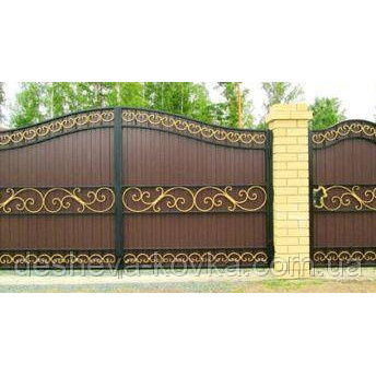 Подробные характеристики Кованые ворота из наружной калиткой из профнастила.