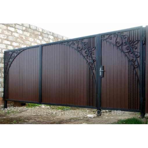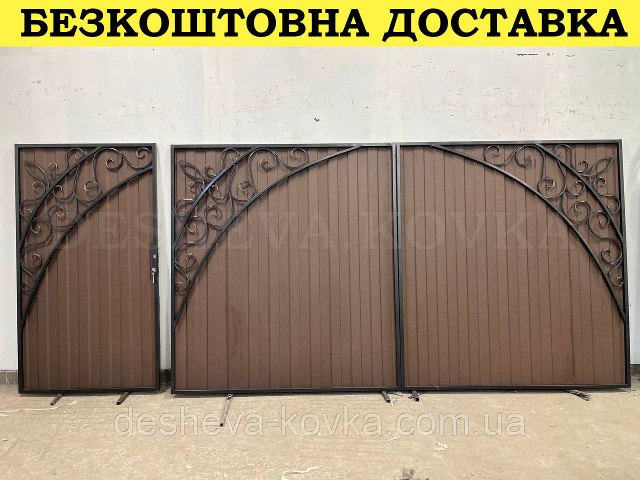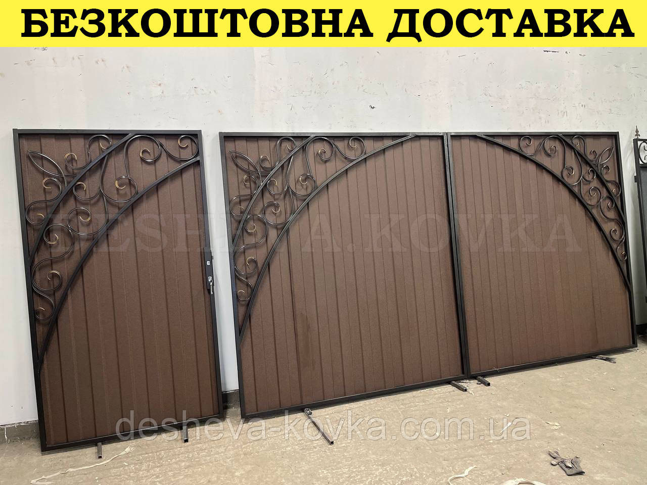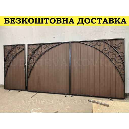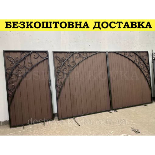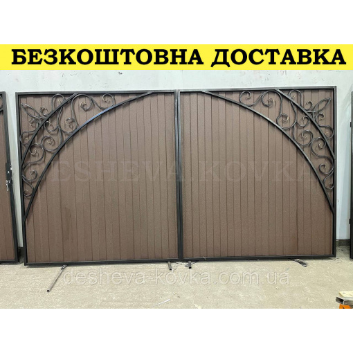 Кованые ворота из профнастила Код: А-0174 Мы изготовим ворота индивидуально по вашим размерам за 4 рабочих дня. Наши ворота производятся на современном оборудовании специалистами нашей компании, что гарантирует скорость и качество. Уличные ворота из профнастила отлично подходят для обустройства въезда во двор частного дома. Классические конструкции не зря пользуются спросом на протяжении нескольких веков: они хорошо выполняют свои функции, оставаясь простыми и удобными в использовании. Изделие может иметь любую форму и дизайн: из-за его технических особенностей ограничений в возможностях декорирования практически нет. БЕСПЛАТНАЯ доставка по всей Украине! (Доставка курьером до Вашего дома, в любой город/село Украины.) По желанию заказчика калитка может быть справой или с левой стороны. Стандартные размеры: Ворота: 3.4м х 1.7м по столбикам. Калитка: 0.9м х 1.7м по столбикам. Также мы можем изготовить ворота индивидуально по размерам заказчика. Цвет профнастила по выбору! Наша компания является одним из самых больших производств на рынке Украины Звоните и мы Вас проконсультируем +380965364101.