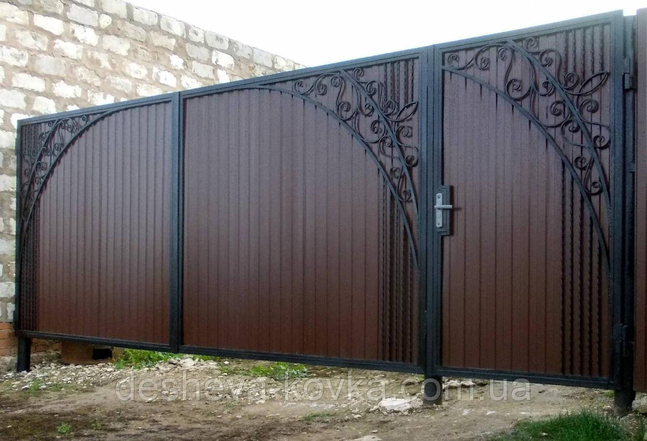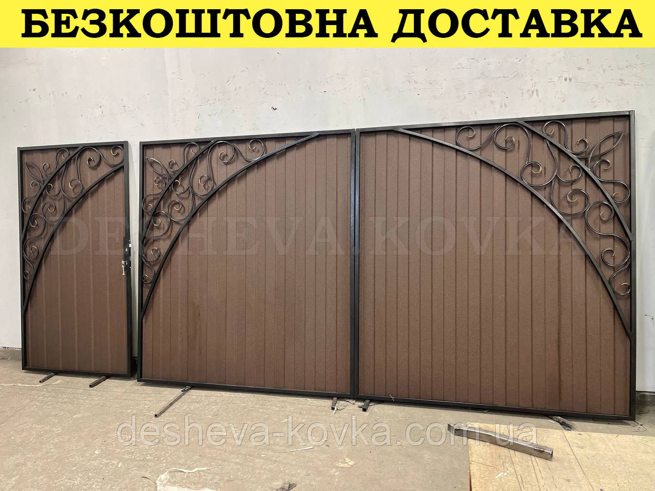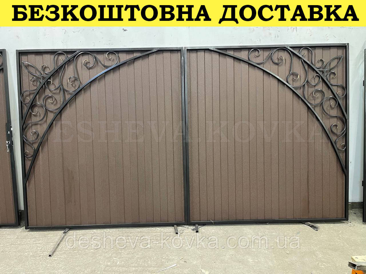 Кованые ворота из профнастила Код: А-0174 Мы изготовим ворота индивидуально по вашим размерам за 4 рабочих дня. Наши ворота производятся на современном оборудовании специалистами нашей компании, что гарантирует скорость и качество. Уличные ворота из профнастила отлично подходят для обустройства въезда во двор частного дома. Классические конструкции не зря пользуются спросом на протяжении нескольких веков: они хорошо выполняют свои функции, оставаясь простыми и удобными в использовании. Изделие может иметь любую форму и дизайн: из-за его технических особенностей ограничений в возможностях декорирования практически нет. БЕСПЛАТНАЯ доставка по всей Украине! (Доставка курьером до Вашего дома, в любой город/село Украины.) По желанию заказчика калитка может быть справой или с левой стороны. Стандартные размеры: Ворота: 3.4м х 1.7м по столбикам. Калитка: 0.9м х 1.7м по столбикам. Также мы можем изготовить ворота индивидуально по размерам заказчика. Цвет профнастила по выбору! Наша компания является одним из самых больших производств на рынке Украины Звоните и мы Вас проконсультируем +380965364101.
