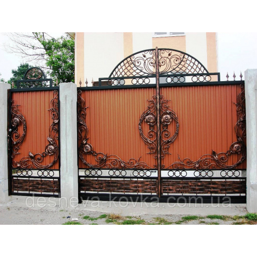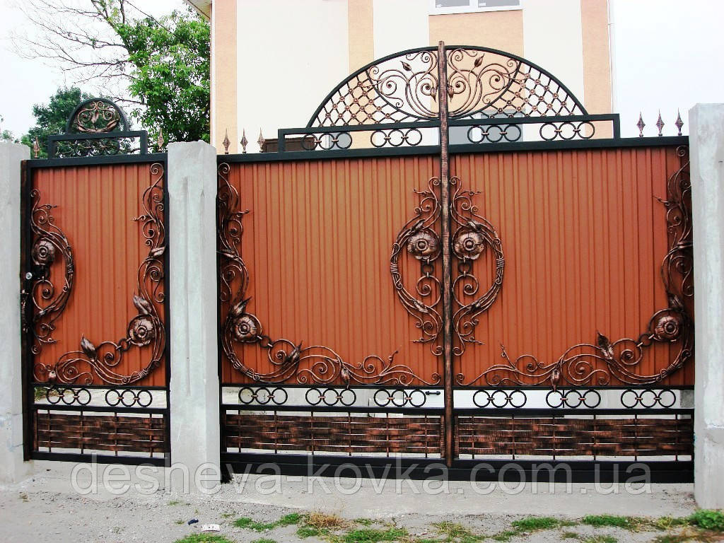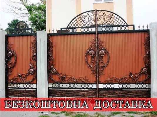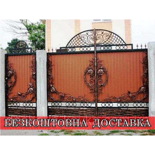 Кованые ворота из профнастила Код: А-01156 Мы изготовим ворота индивидуально по вашим размерам за 4 рабочих дня. Наши ворота производятся на современном оборудовании специалистами нашей компании, что гарантирует скорость и качество. Уличные ворота из профнастила отлично подходят для обустройства въезда во двор частного дома. Классические конструкции не зря пользуются спросом на протяжении нескольких веков: они хорошо выполняют свои функции, оставаясь простыми и удобными в использовании. Изделие может иметь любую форму и дизайн: из-за его технических особенностей ограничений в возможностях декорирования практически нет. БЕСПЛАТНАЯ доставка по всей Украине! (Доставка курьером до Вашего дома, в любой город/село Украины.) По желанию заказчика калитка может быть справой или с левой стороны. Стандартные размеры: Ворота: 3.4м х 1.7м по столбикам. Калитка: 0.9м х 1.7м по столбикам. Также мы можем изготовить ворота индивидуально по размерам заказчика. Цвет профнастила по выбору! Наша компания является одним из самых больших производств на рынке Украины. Звоните и мы Вас проконсультируем +380965364101.