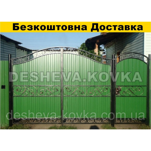 Подробные характеристики Кованые ворота из профнастила из калиткой для дома.