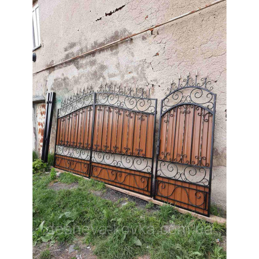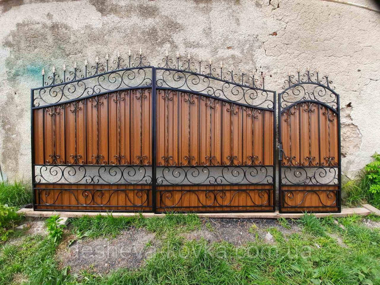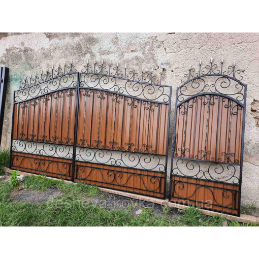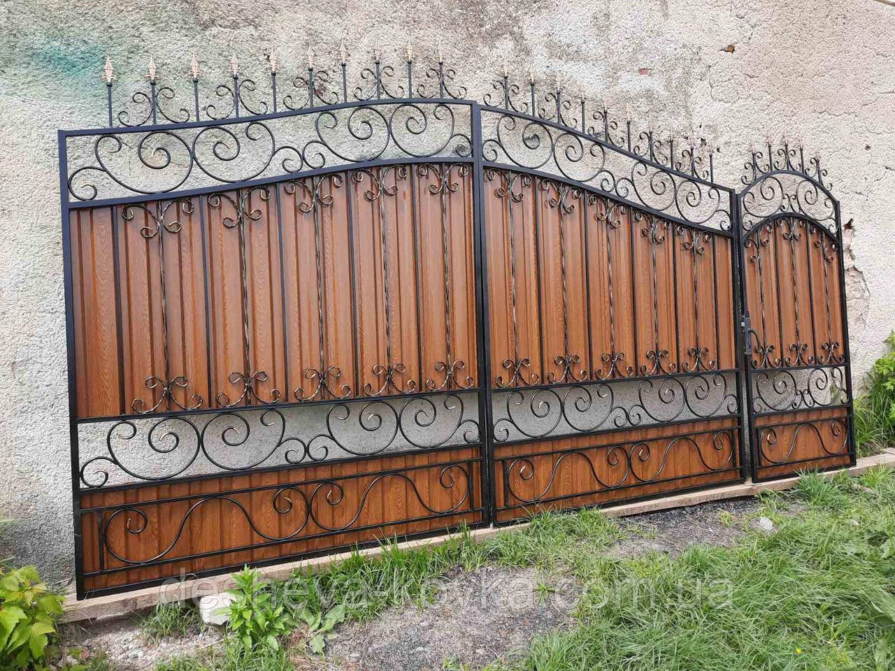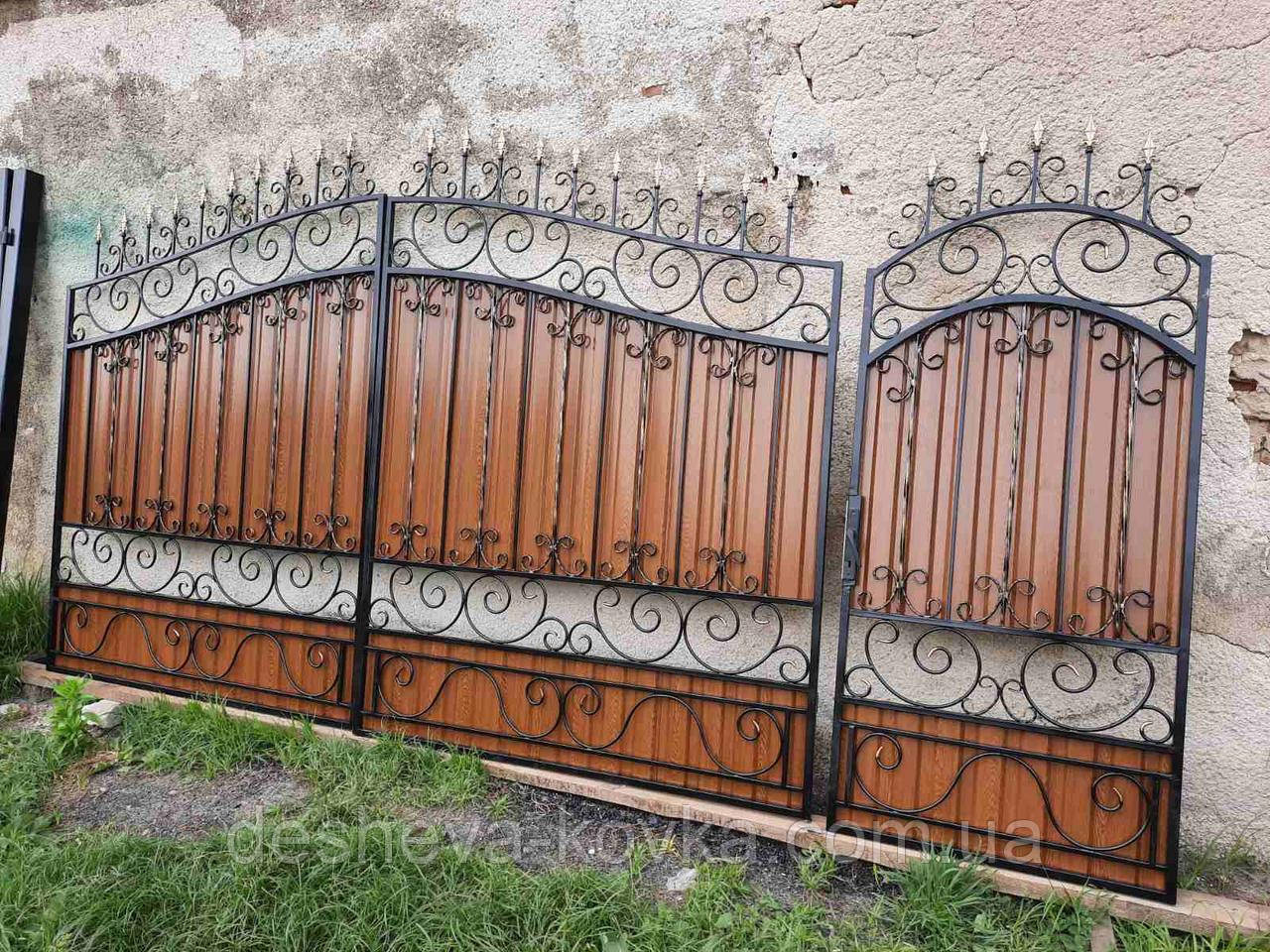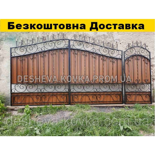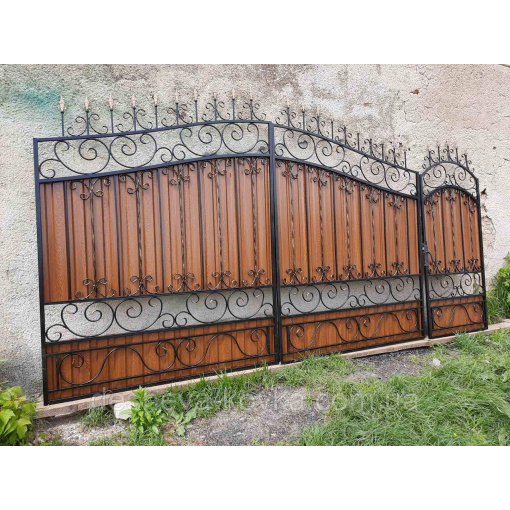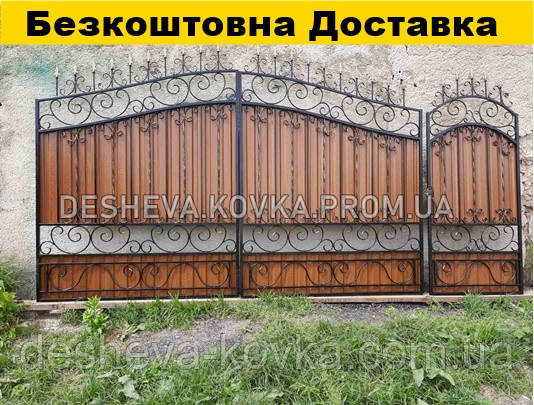 Кованые ворота из профнастилом Код: А-01110 Мы изготовим ворота индивидуально по вашим размерам за 4 рабочих дня. Наши ворота производятся на современном оборудовании специалистами нашей компании, что гарантирует скорость и качество. Уличные ворота из профнастила отлично подходят для обустройства въезда во двор частного дома. Классические конструкции не зря пользуются спросом на протяжении нескольких веков: они хорошо выполняют свои функции, оставаясь простыми и удобными в использовании. Изделие может иметь любую форму и дизайн: из-за его технических особенностей ограничений в возможностях декорирования практически нет. БЕСПЛАТНАЯ доставка по всей Украине! (Доставка курьером до Вашего дома, в любой город/село Украины.) По желанию заказчика калитка может быть справой или с левой стороны. Стандартные размеры: Ворота: 3.4м х 1.7м по столбикам. Калитка: 0.9м х 1.7м по столбикам. Также мы можем изготовить ворота индивидуально по размерам заказчика. Цвет профнастила по выбору! Наша компания является одним из самых больших производств на рынке Украины. Звоните и мы Вас проконсультируем +380939136178.