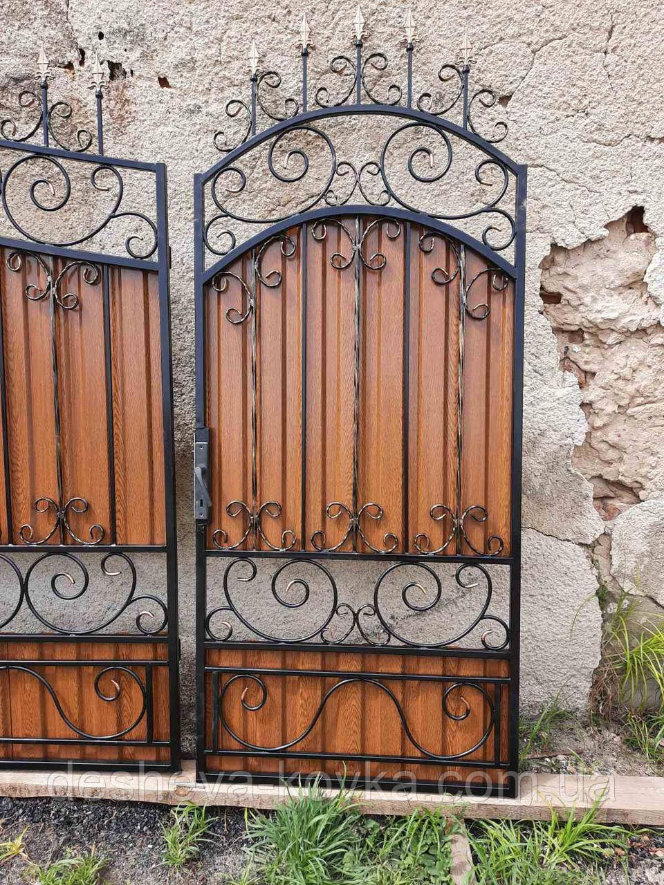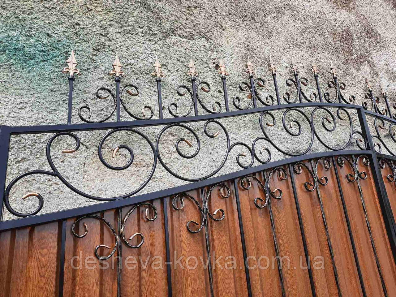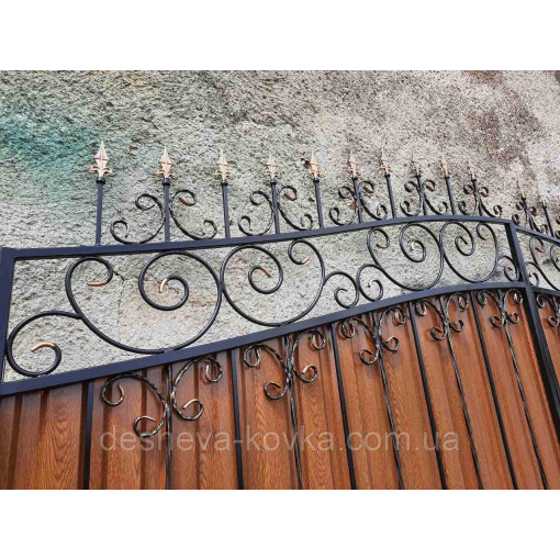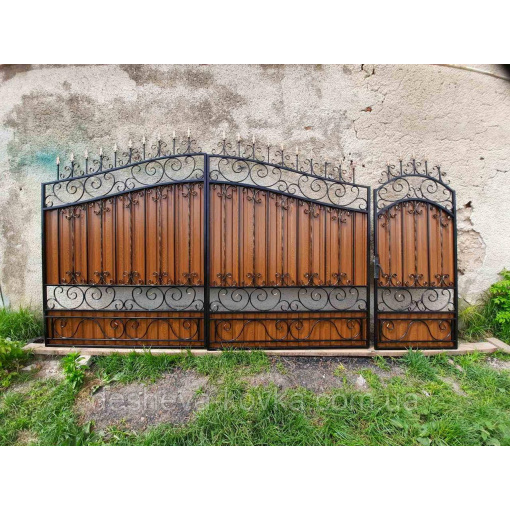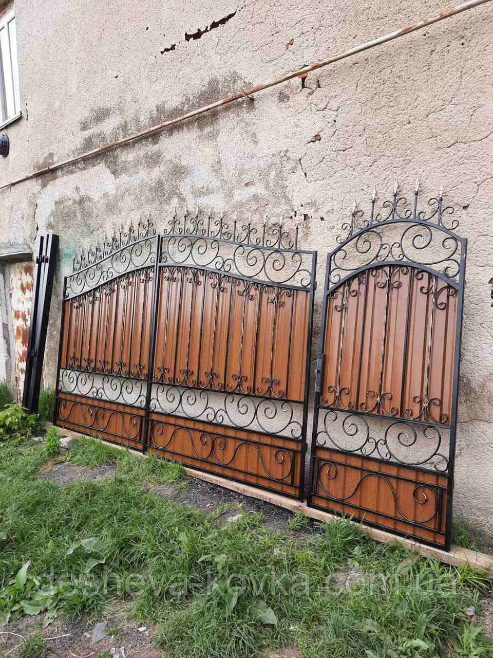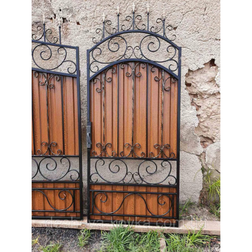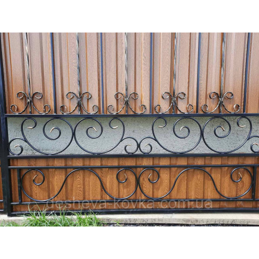 Кованые ворота из профнастилом Код: А-01110 Мы изготовим ворота индивидуально по вашим размерам за 4 рабочих дня. Наши ворота производятся на современном оборудовании специалистами нашей компании, что гарантирует скорость и качество. Уличные ворота из профнастила отлично подходят для обустройства въезда во двор частного дома. Классические конструкции не зря пользуются спросом на протяжении нескольких веков: они хорошо выполняют свои функции, оставаясь простыми и удобными в использовании. Изделие может иметь любую форму и дизайн: из-за его технических особенностей ограничений в возможностях декорирования практически нет. БЕСПЛАТНАЯ доставка по всей Украине! (Доставка курьером до Вашего дома, в любой город/село Украины.) По желанию заказчика калитка может быть справой или с левой стороны. Стандартные размеры: Ворота: 3.4м х 1.7м по столбикам. Калитка: 0.9м х 1.7м по столбикам. Также мы можем изготовить ворота индивидуально по размерам заказчика. Цвет профнастила по выбору! Наша компания является одним из самых больших производств на рынке Украины. Звоните и мы Вас проконсультируем +380939136178.