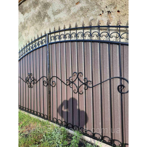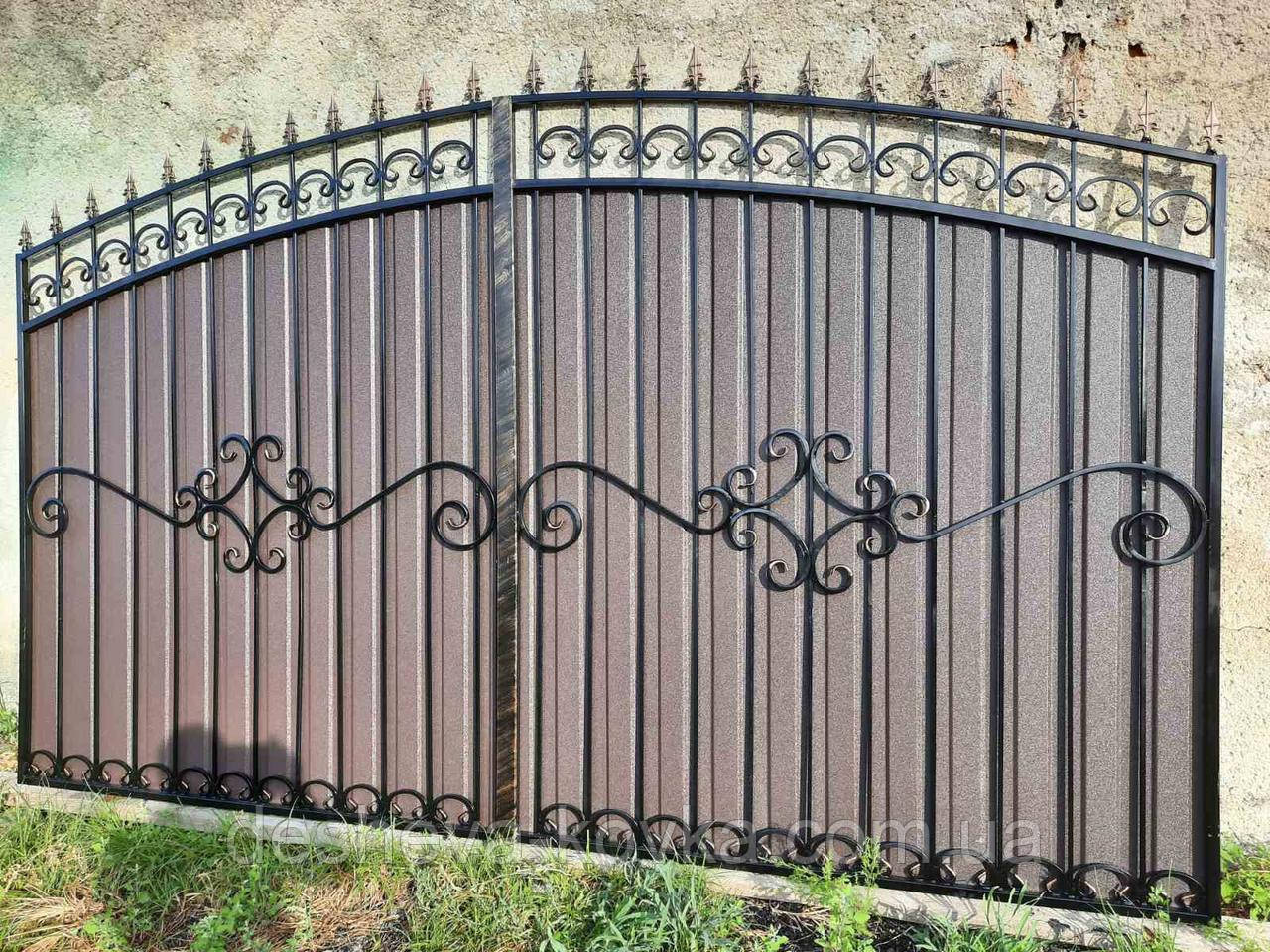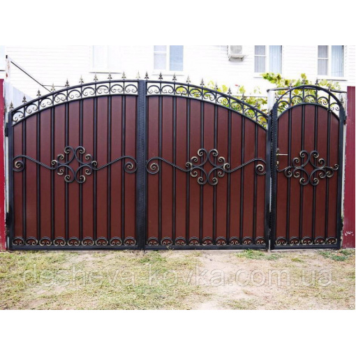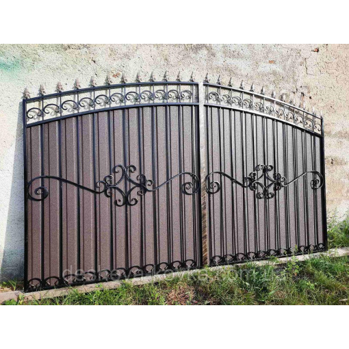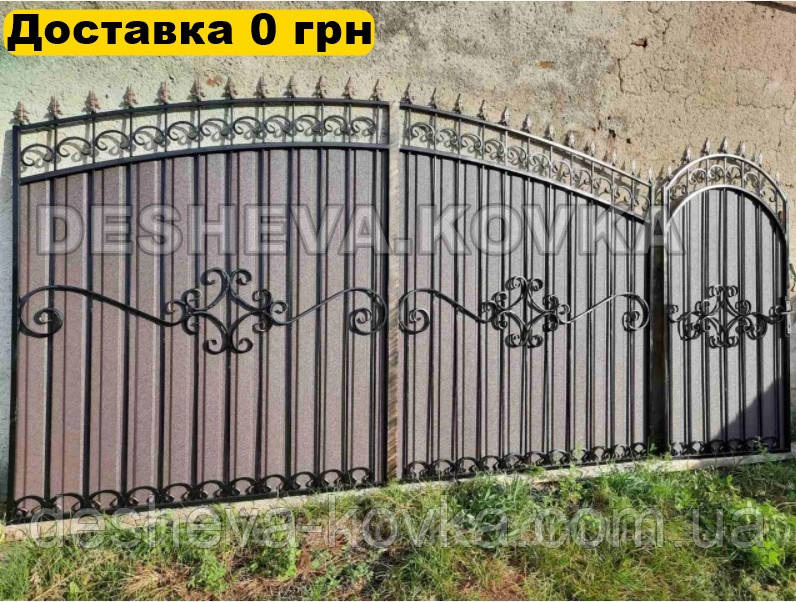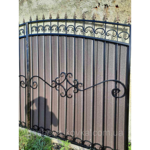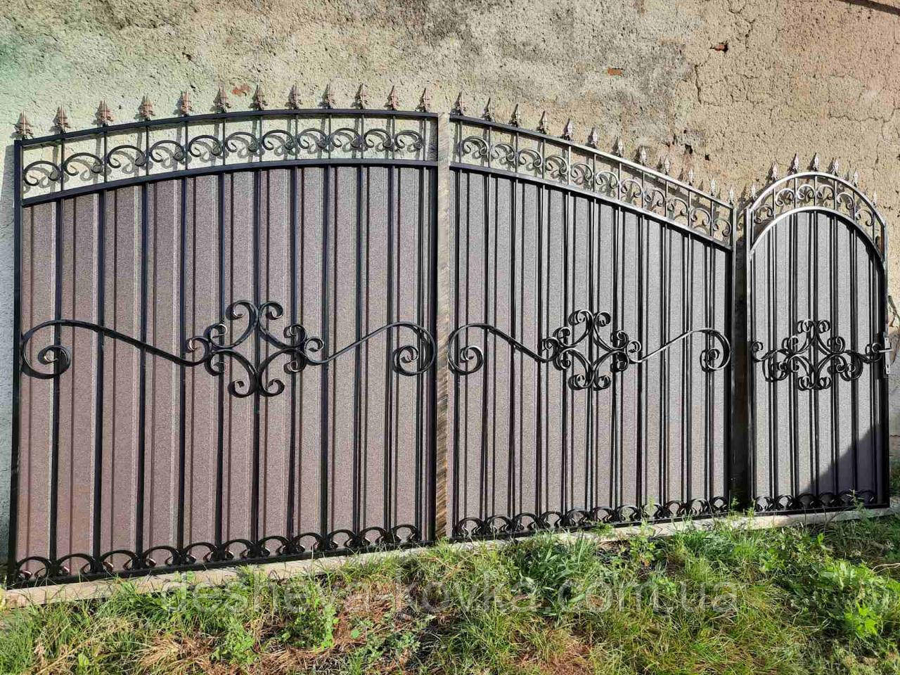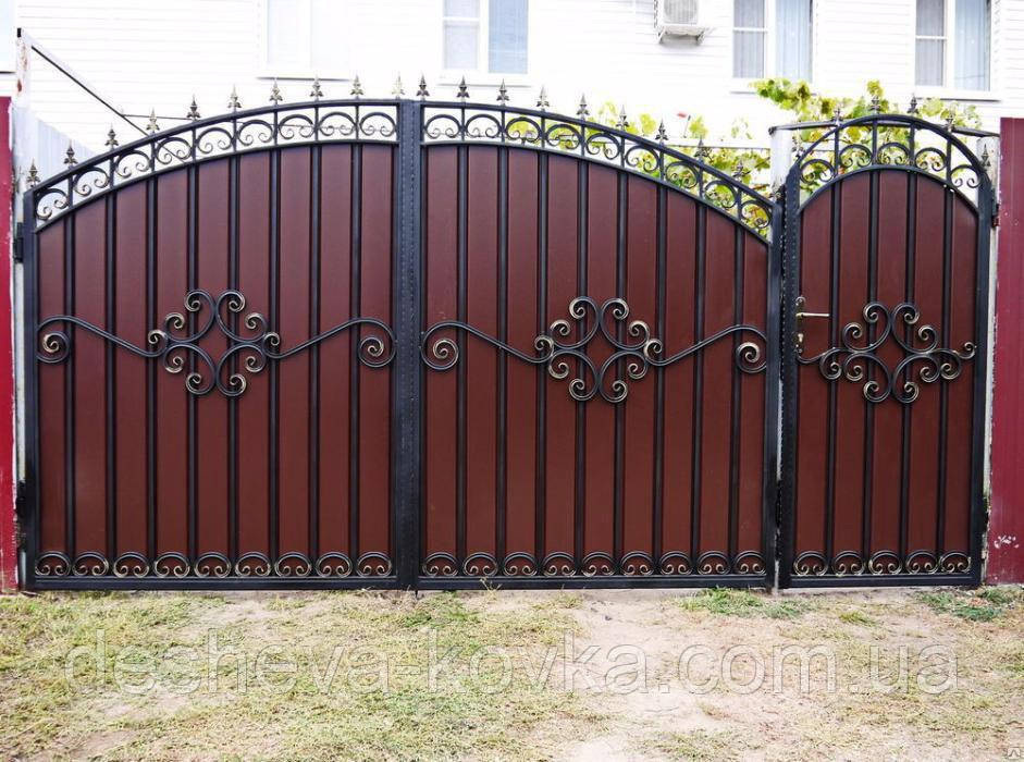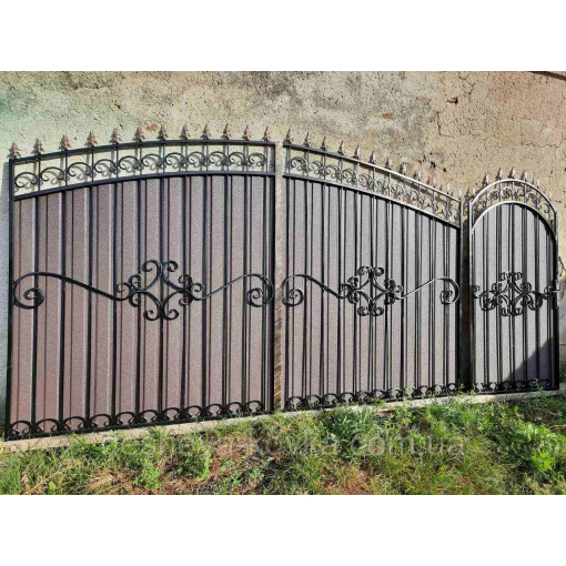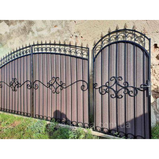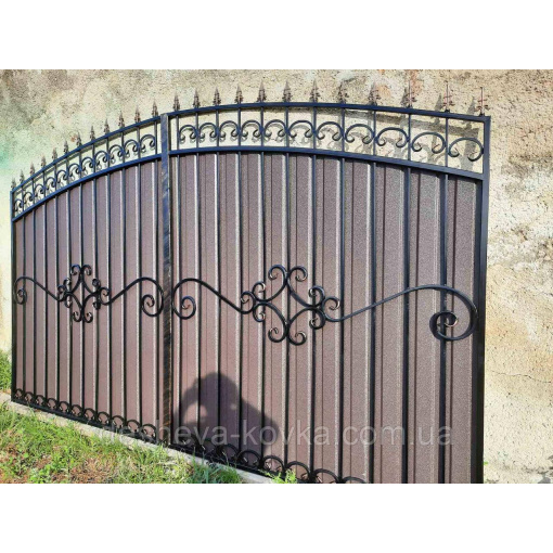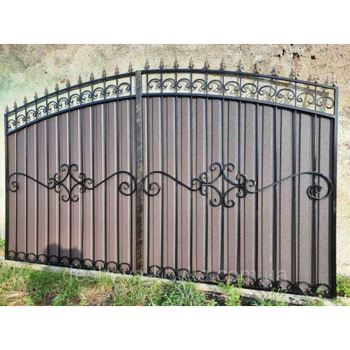 Кованые ворота из профнастилом и коваными элементами Код: А-0143 Мы изготовим ворота индивидуально по вашим размерам за 4 рабочих дня. Наши ворота производятся на современном оборудовании специалистами нашей компании, что гарантирует скорость и качество. Уличные ворота из профнастила отлично подходят для обустройства въезда во двор частного дома. Классические конструкции не зря пользуются спросом на протяжении нескольких веков: они хорошо выполняют свои функции, оставаясь простыми и удобными в использовании. Изделие может иметь любую форму и дизайн: из-за его технических особенностей ограничений в возможностях декорирования практически нет. БЕСПЛАТНАЯ доставка по всей Украине! (Доставка курьером до Вашего дома, в любой город/село Украины.) По желанию заказчика калитка может быть справой или с левой стороны. Стандартные размеры: Ворота: 3.4м х 1.7м по столбикам. Калитка: 0.9м х 1.7м по столбикам. Также мы можем изготовить ворота индивидуально по размерам заказчика. Цвет профнастила по выбору! Наша компания является одним из самых больших производств на рынке Украины. Звоните и мы Вас проконсультируем +380965364101.