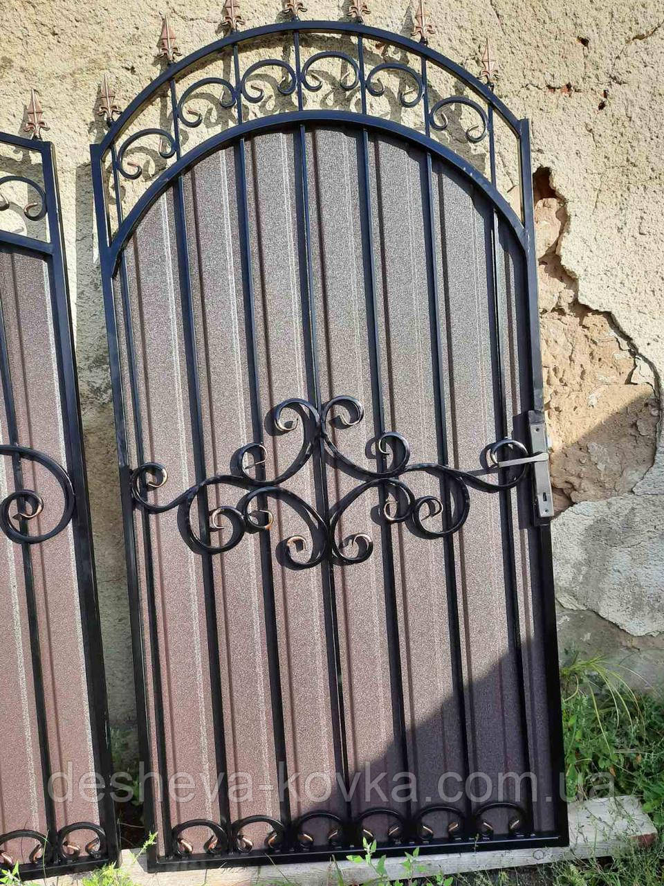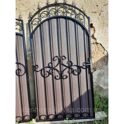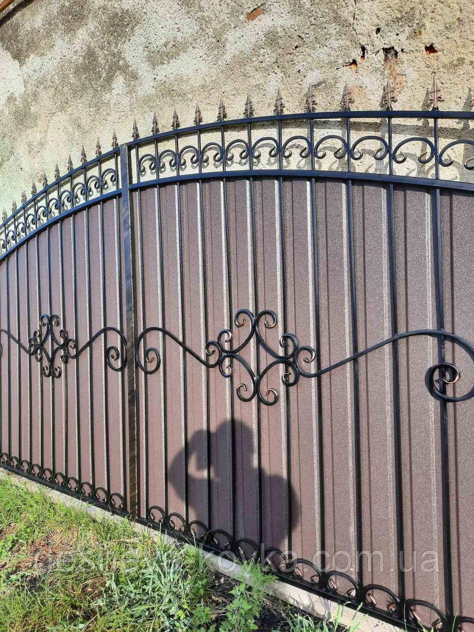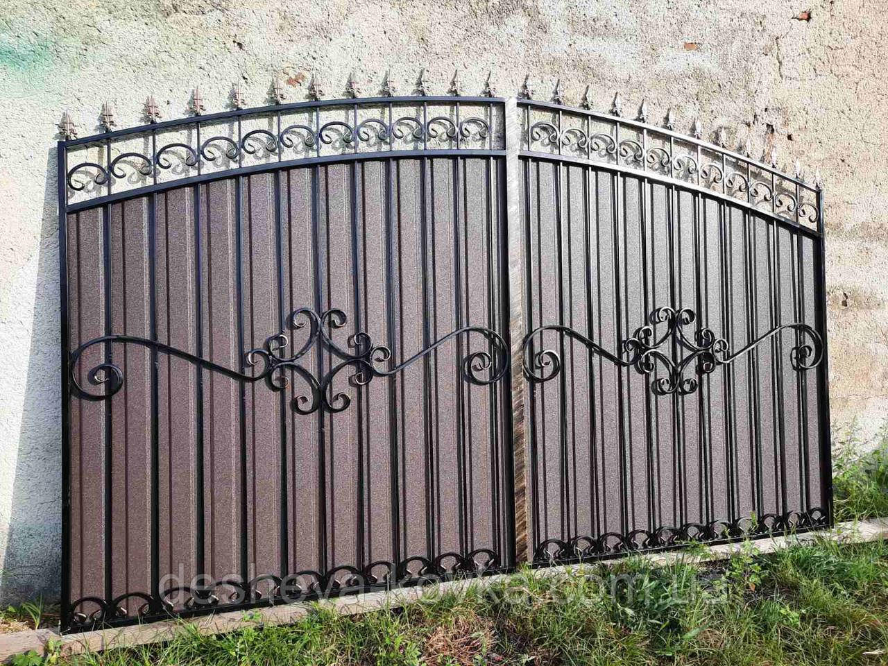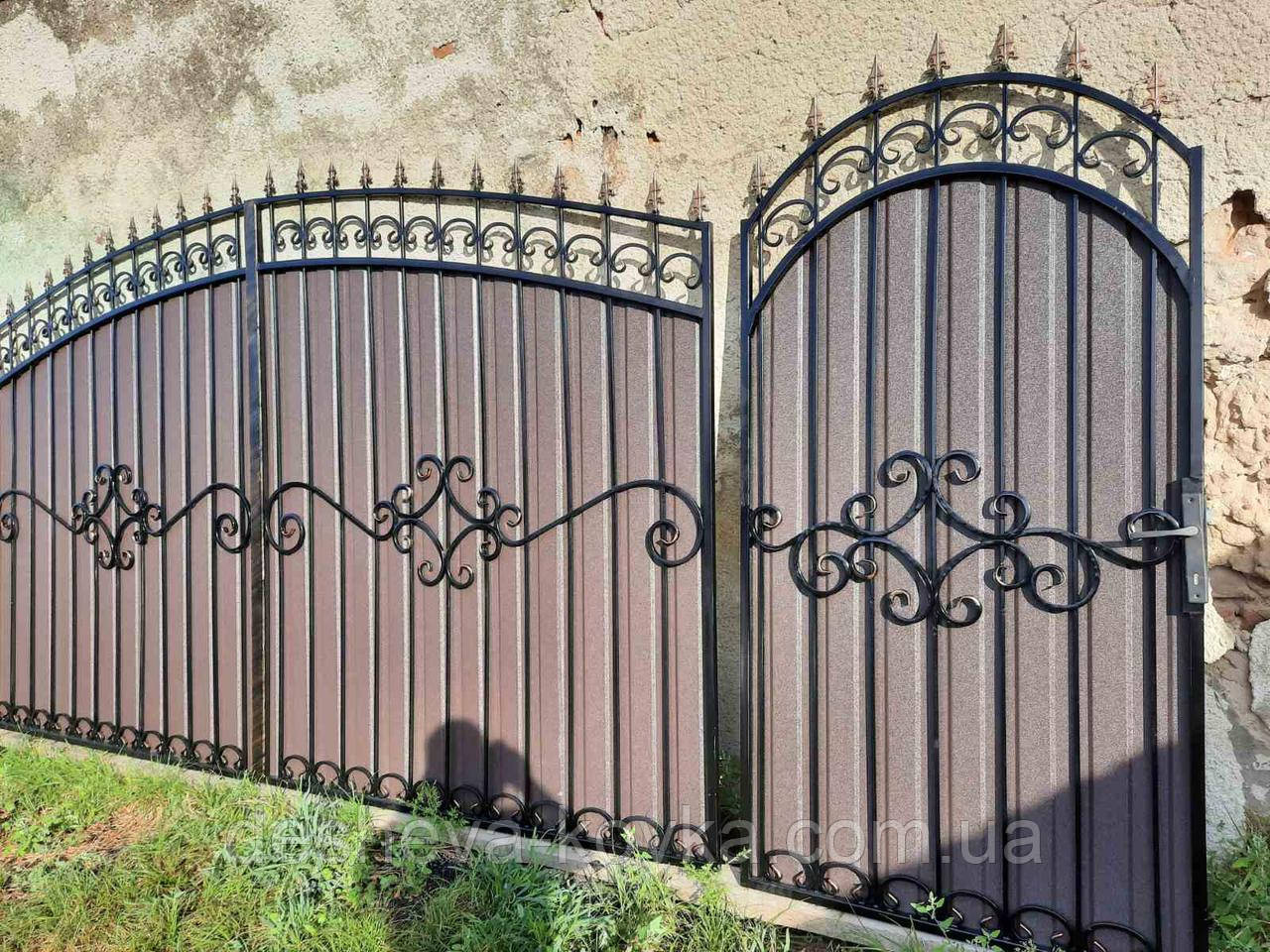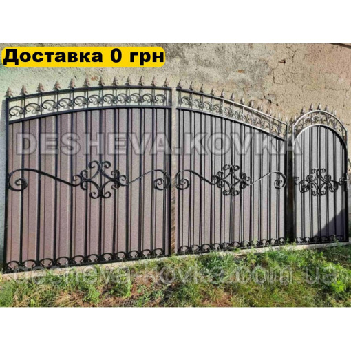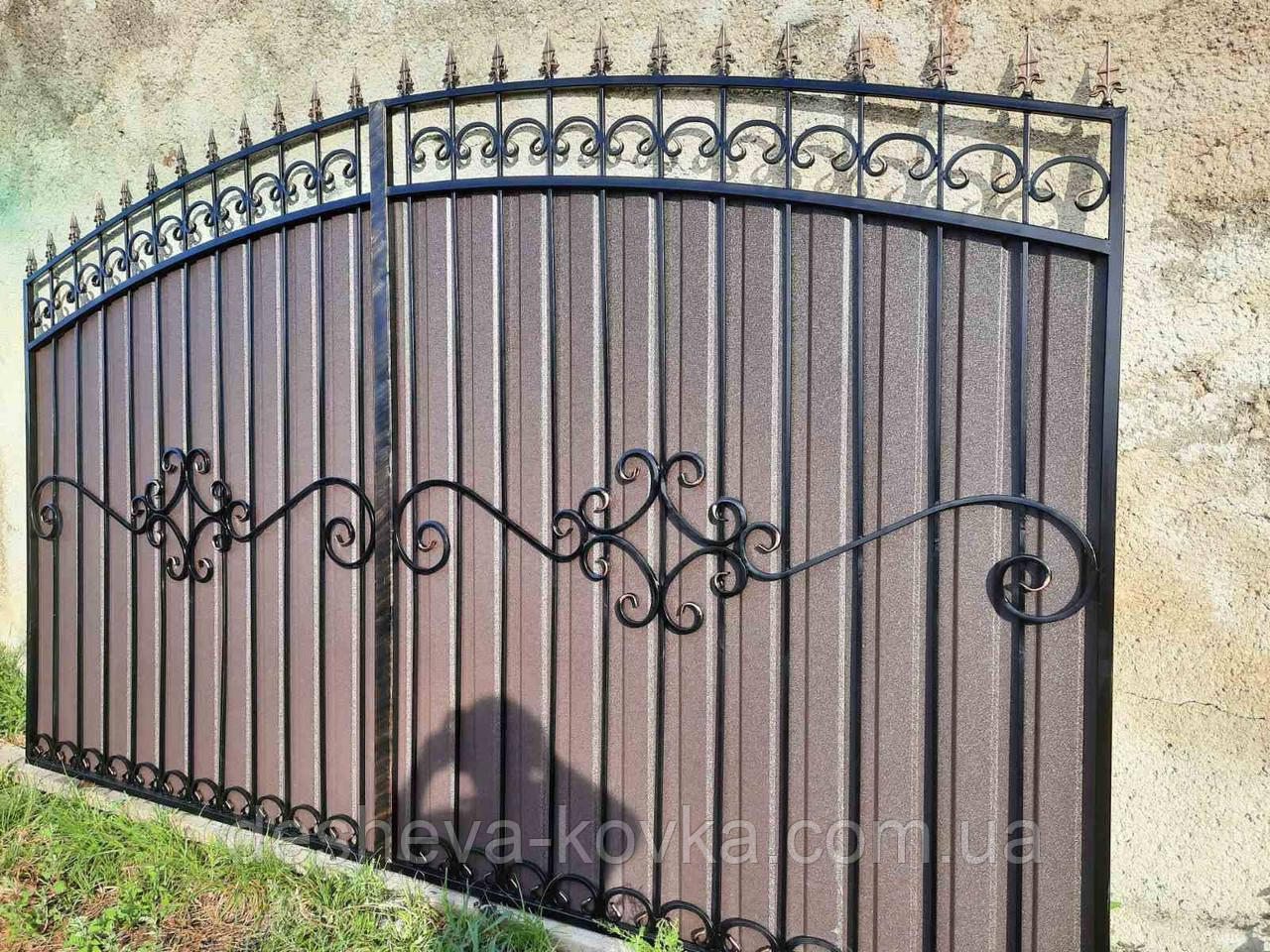 Кованые ворота из профнастилом и коваными элементами Код: А-0143 Мы изготовим ворота индивидуально по вашим размерам за 4 рабочих дня. Наши ворота производятся на современном оборудовании специалистами нашей компании, что гарантирует скорость и качество. Уличные ворота из профнастила отлично подходят для обустройства въезда во двор частного дома. Классические конструкции не зря пользуются спросом на протяжении нескольких веков: они хорошо выполняют свои функции, оставаясь простыми и удобными в использовании. Изделие может иметь любую форму и дизайн: из-за его технических особенностей ограничений в возможностях декорирования практически нет. БЕСПЛАТНАЯ доставка по всей Украине! (Доставка курьером до Вашего дома, в любой город/село Украины.) По желанию заказчика калитка может быть справой или с левой стороны. Стандартные размеры: Ворота: 3.4м х 1.7м по столбикам. Калитка: 0.9м х 1.7м по столбикам. Также мы можем изготовить ворота индивидуально по размерам заказчика. Цвет профнастила по выбору! Наша компания является одним из самых больших производств на рынке Украины. Звоните и мы Вас проконсультируем +380965364101.