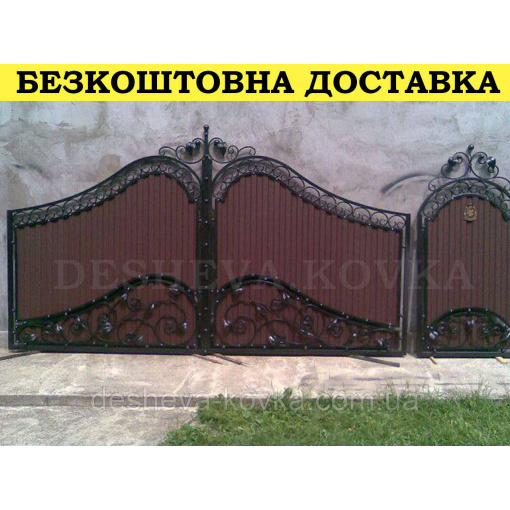 Кованые ворота из профнастилом и коваными элементами Код: А-01270 Мы изготовим ворота индивидуально по вашим размерам за 4 рабочих дня. Наши ворота производятся на современном оборудовании специалистами нашей компании, что гарантирует скорость и качество. Уличные ворота из профнастила отлично подходят для обустройства въезда во двор частного дома. Классические конструкции не зря пользуются спросом на протяжении нескольких веков: они хорошо выполняют свои функции, оставаясь простыми и удобными в использовании. Изделие может иметь любую форму и дизайн: из-за его технических особенностей ограничений в возможностях декорирования практически нет. БЕСПЛАТНАЯ доставка по всей Украине! (Доставка курьером до Вашего дома, в любой город/село Украины.) По желанию заказчика калитка может быть справой или с левой стороны. Стандартные размеры: Ворота: 3.4м х 1.7м по столбикам. Калитка: 0.9м х 1.7м по столбикам. Также мы можем изготовить ворота индивидуально по размерам заказчика. Цвет профнастила по выбору! Наша компания является одним из самых больших производств на рынке Украины. Звоните и мы Вас проконсультируем +380965364101.