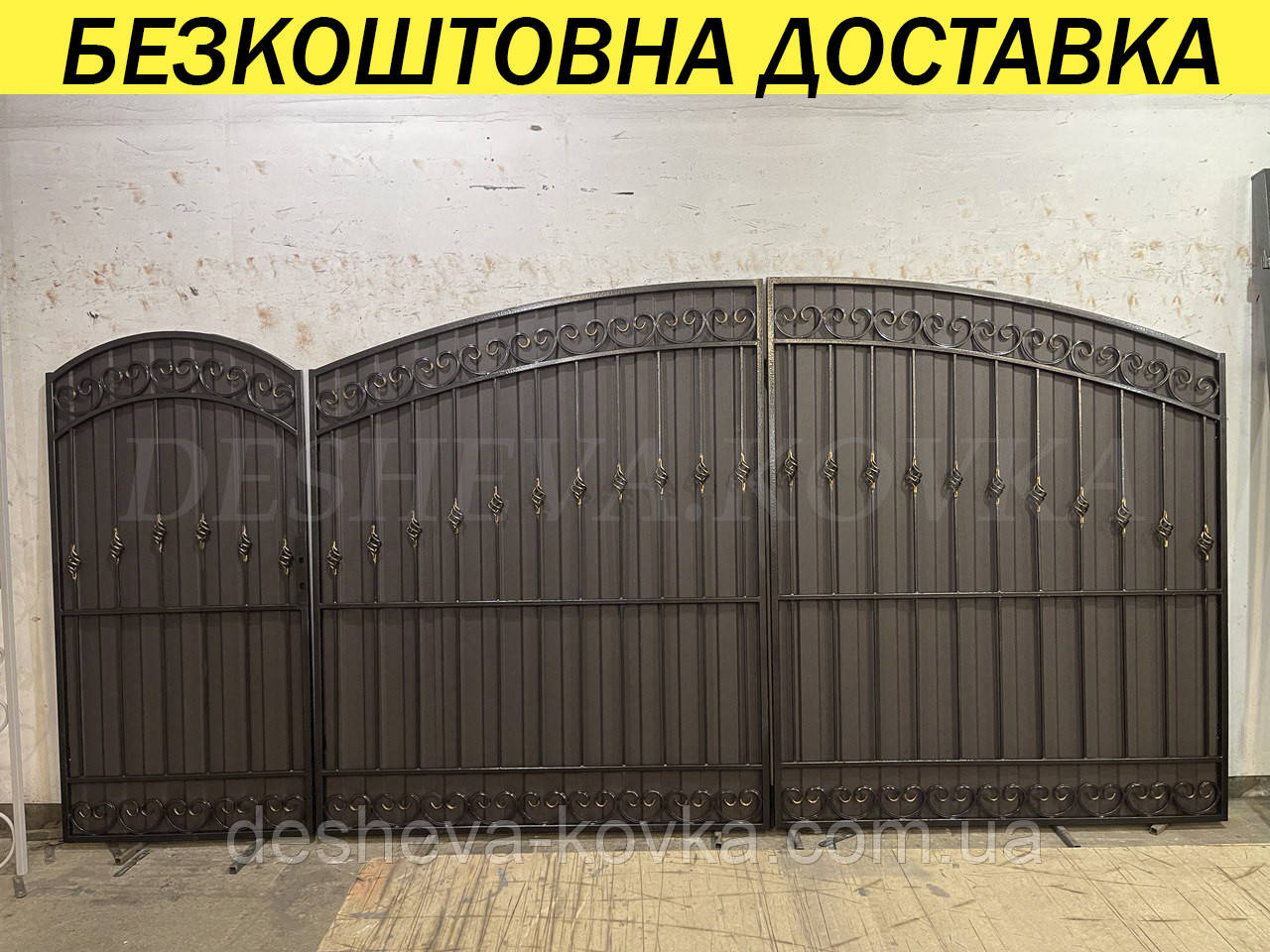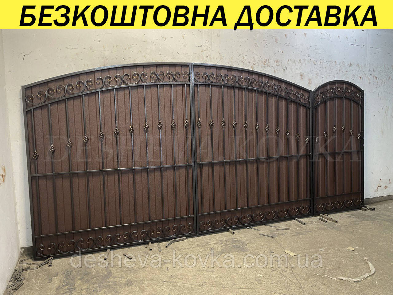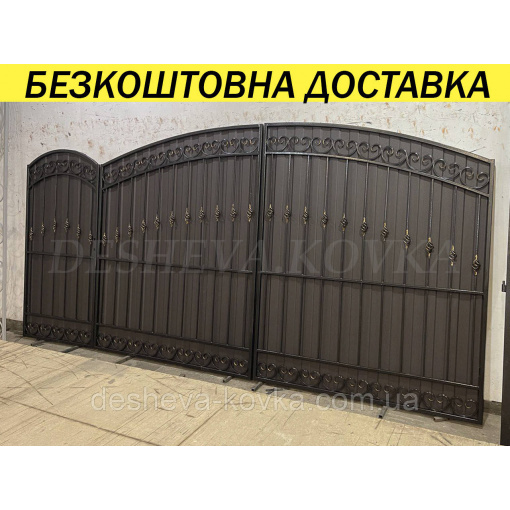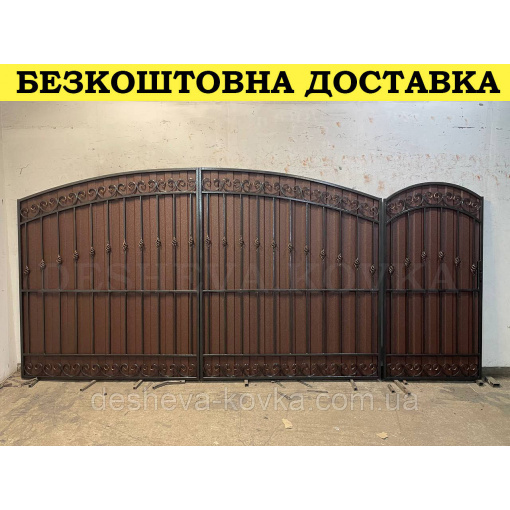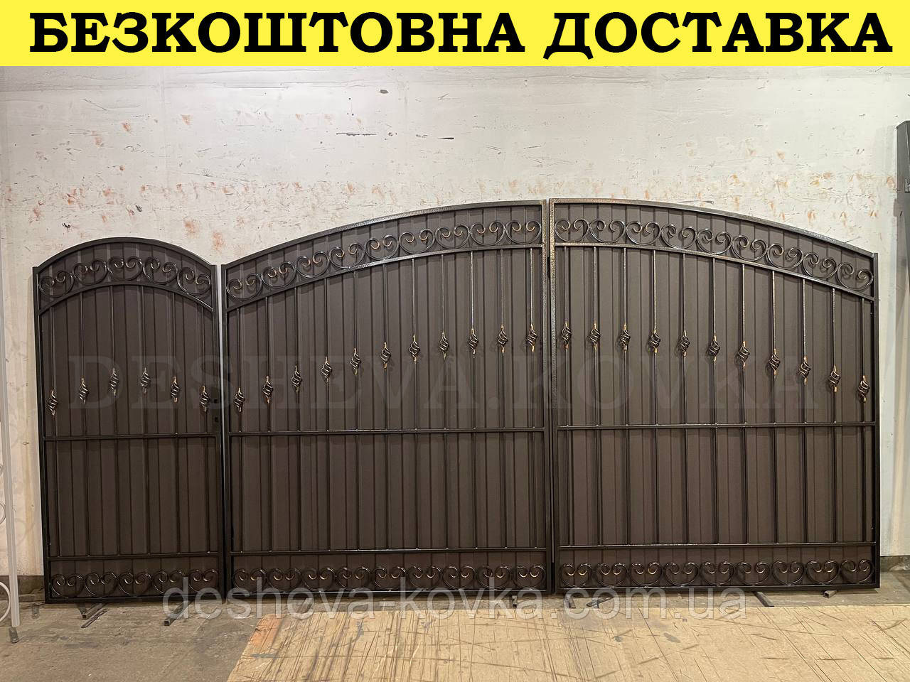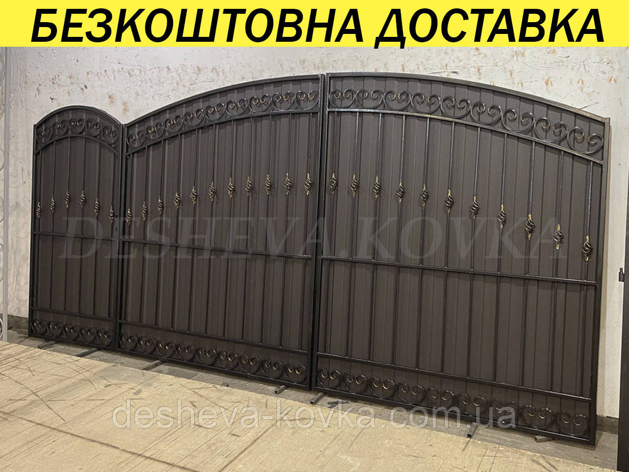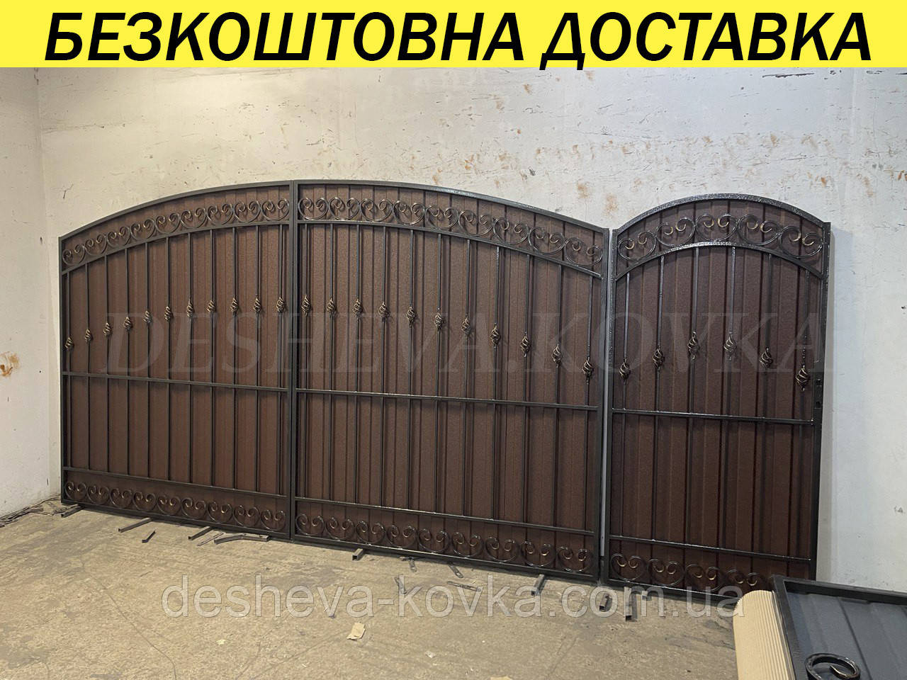Кованые ворота из профнастилом и коваными элементами Код: А-01263 Мы изготовим ворота индивидуально по вашим размерам за 4 рабочих дня. Наши ворота производятся на современном оборудовании специалистами нашей компании, что гарантирует скорость и качество. Уличные ворота из профнастила отлично подходят для обустройства въезда во двор частного дома. Классические конструкции не зря пользуются спросом на протяжении нескольких веков: они хорошо выполняют свои функции, оставаясь простыми и удобными в использовании. Изделие может иметь любую форму и дизайн: из-за его технических особенностей ограничений в возможностях декорирования практически нет. БЕСПЛАТНАЯ доставка по всей Украине! (Доставка курьером до Вашего дома, в любой город/село Украины.) По желанию заказчика калитка может быть справой или с левой стороны. Стандартные размеры: Ворота: 3.4м х 1.7м по столбикам. Калитка: 0.9м х 1.7м по столбикам. Также мы можем изготовить ворота индивидуально по размерам заказчика. Цвет профнастила по выбору! Наша компания является одним из самых больших производств на рынке Украины. Звоните и мы Вас проконсультируем +380965364101.