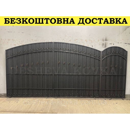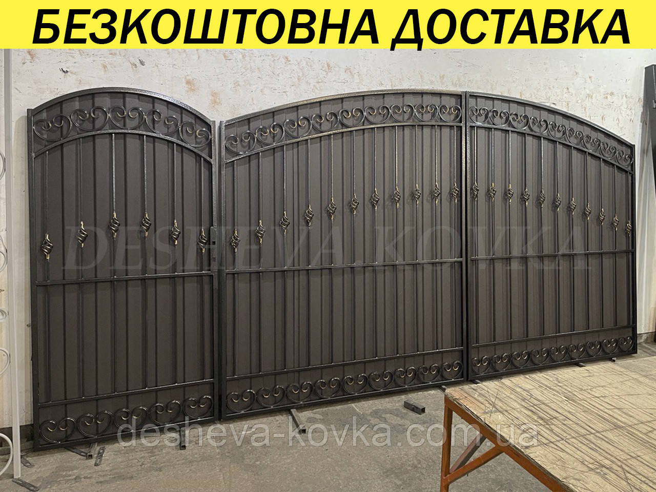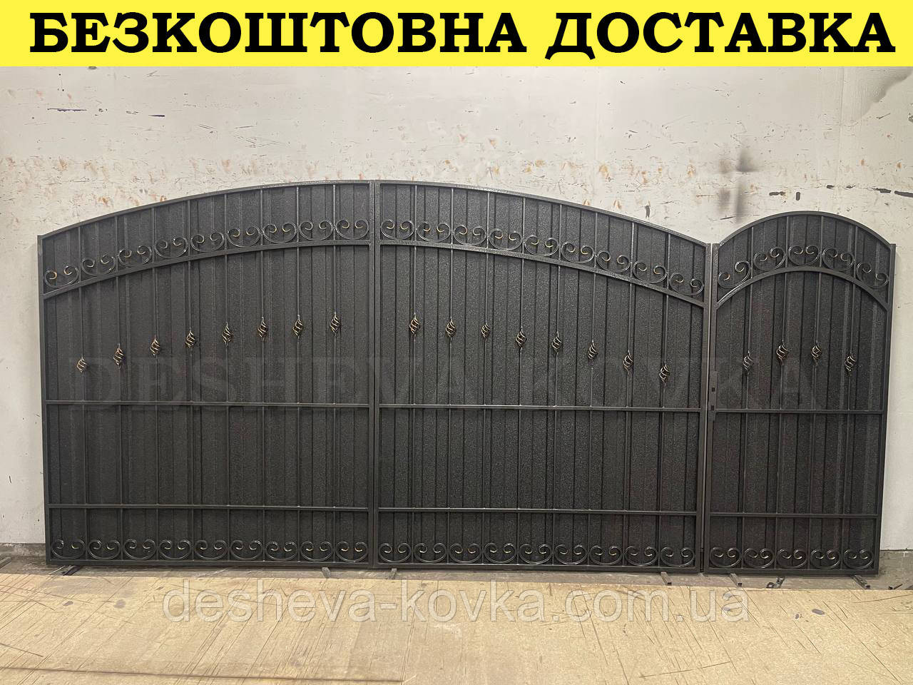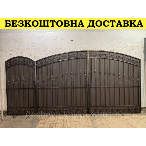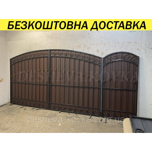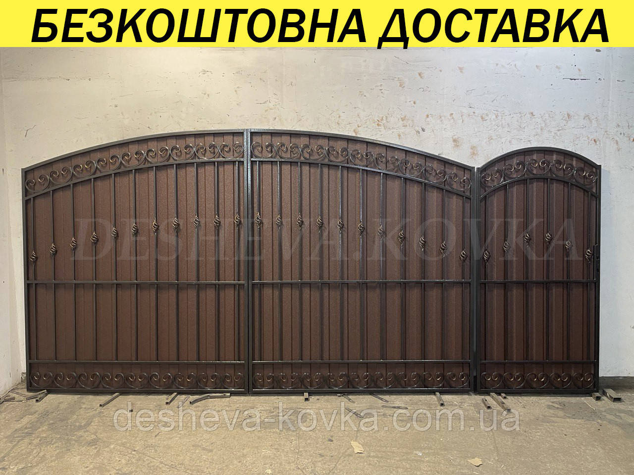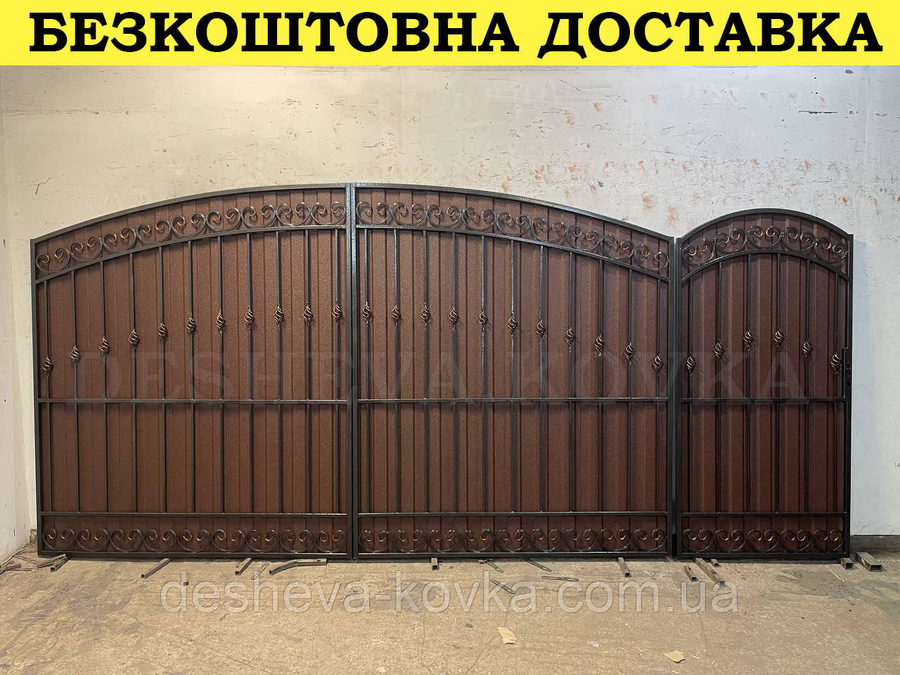 Кованые ворота из профнастилом и коваными элементами Код: А-01263 Мы изготовим ворота индивидуально по вашим размерам за 4 рабочих дня. Наши ворота производятся на современном оборудовании специалистами нашей компании, что гарантирует скорость и качество. Уличные ворота из профнастила отлично подходят для обустройства въезда во двор частного дома. Классические конструкции не зря пользуются спросом на протяжении нескольких веков: они хорошо выполняют свои функции, оставаясь простыми и удобными в использовании. Изделие может иметь любую форму и дизайн: из-за его технических особенностей ограничений в возможностях декорирования практически нет. БЕСПЛАТНАЯ доставка по всей Украине! (Доставка курьером до Вашего дома, в любой город/село Украины.) По желанию заказчика калитка может быть справой или с левой стороны. Стандартные размеры: Ворота: 3.4м х 1.7м по столбикам. Калитка: 0.9м х 1.7м по столбикам. Также мы можем изготовить ворота индивидуально по размерам заказчика. Цвет профнастила по выбору! Наша компания является одним из самых больших производств на рынке Украины. Звоните и мы Вас проконсультируем +380965364101.