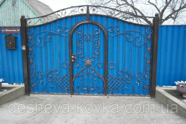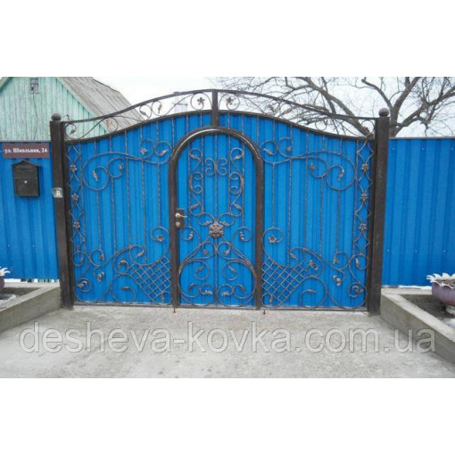 Подробные характеристики Кованые ворота из встроенной калиткой и коваными элементами.