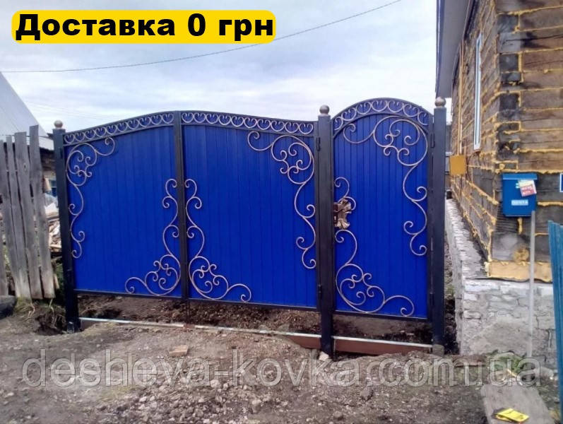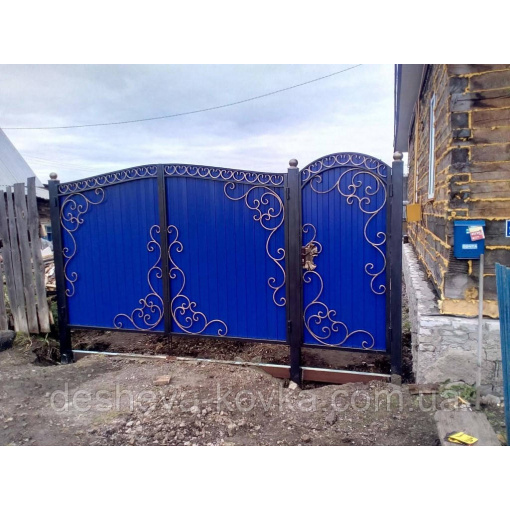 Кованые ворота под заказ Код: А-0138 Мы изготовим ворота индивидуально по вашим размерам за 4 рабочих дня. Наши ворота производятся на современном оборудовании специалистами нашей компании, что гарантирует скорость и качество. Уличные ворота из профнастила отлично подходят для обустройства въезда во двор частного дома. Классические конструкции не зря пользуются спросом на протяжении нескольких веков: они хорошо выполняют свои функции, оставаясь простыми и удобными в использовании. Изделие может иметь любую форму и дизайн: из-за его технических особенностей ограничений в возможностях декорирования практически нет. БЕСПЛАТНАЯ доставка по всей Украине! (Доставка курьером до Вашего дома, в любой город/село Украины.) По желанию заказчика калитка может быть справой или с левой стороны. Стандартные размеры: Ворота: 3.4м х 1.7м по столбикам. Калитка: 0.9м х 1.7м по столбикам. Также мы можем изготовить ворота индивидуально по размерам заказчика. Цвет профнастила по выбору! Наша компания является одним из самых больших производств на рынке Украины. Звоните и мы Вас проконсультируем +380965364101.