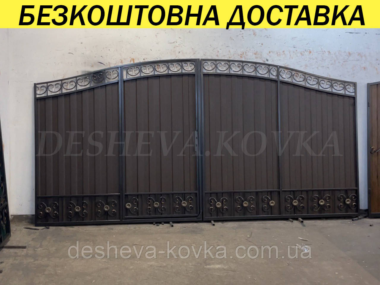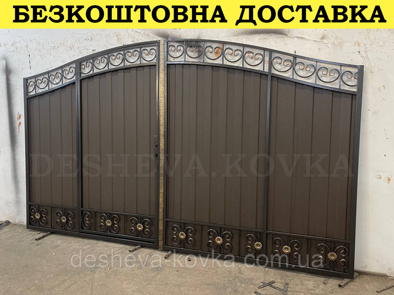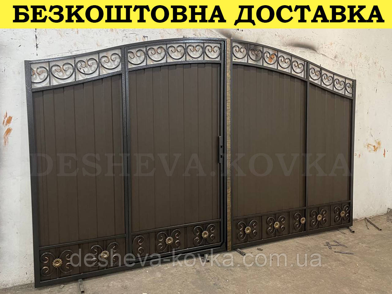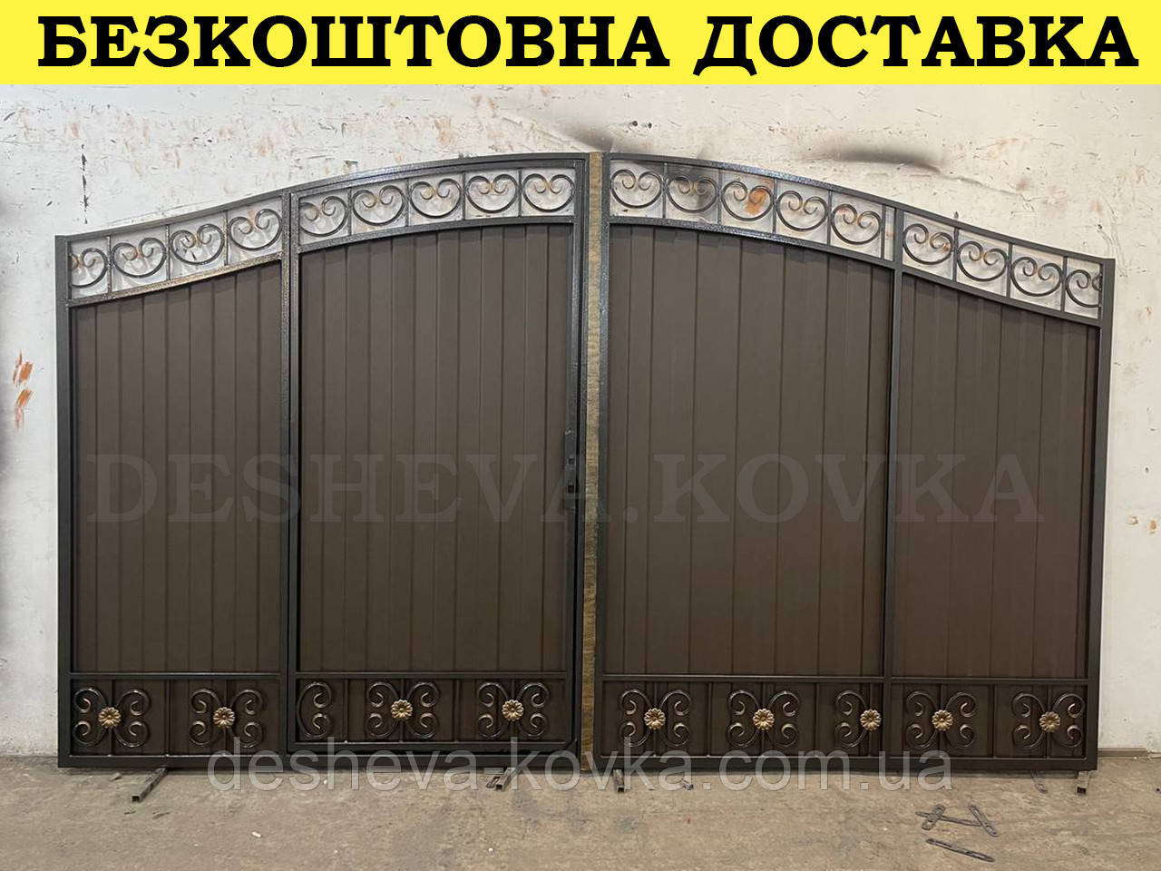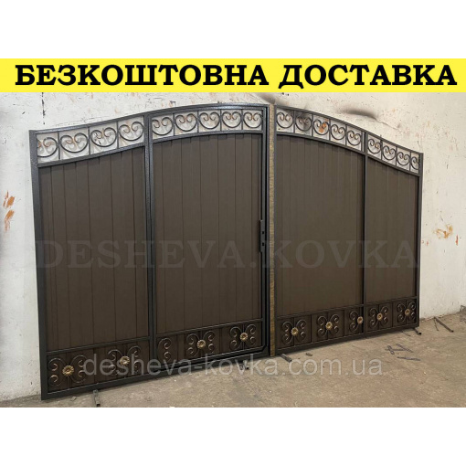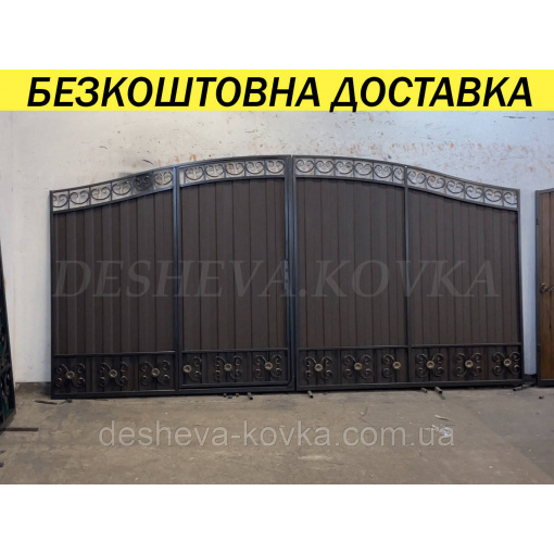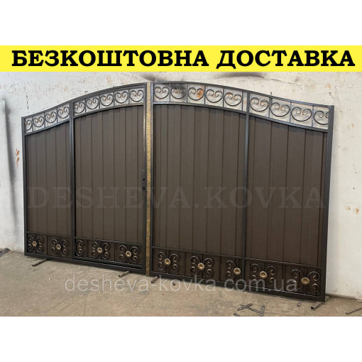 Кованые ворота с калиткой и пиками Код: А-0130(1) Мы изготовим ворота индивидуально по вашим размерам за 4 рабочих дня. Наши ворота производятся на современном оборудовании специалистами нашей компании, что гарантирует скорость и качество. Уличные ворота из профнастила отлично подходят для обустройства въезда во двор частного дома. Классические конструкции не зря пользуются спросом на протяжении нескольких веков: они хорошо выполняют свои функции, оставаясь простыми и удобными в использовании. Изделие может иметь любую форму и дизайн: из-за его технических особенностей ограничений в возможностях декорирования практически нет. БЕСПЛАТНАЯ доставка по всей Украине! (Доставка курьером до Вашего дома, в любой город/село Украины.) По желанию заказчика калитка может быть справой или с левой стороны. Стандартные размеры: Ворота: 3.4м х 1.7м по столбикам. Калитка: 0.9м х 1.7м по столбикам. Также мы можем изготовить ворота индивидуально по размерам заказчика. Цвет профнастила по выбору! Наша компания является одним из самых больших производств на рынке Украины. Для просчета ворот по Вашим размерам звоните +380 (96) 536 41 01