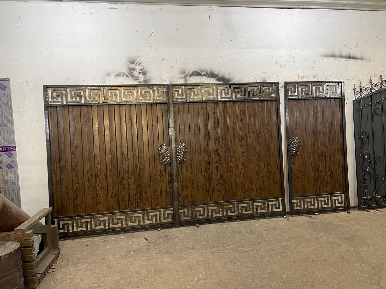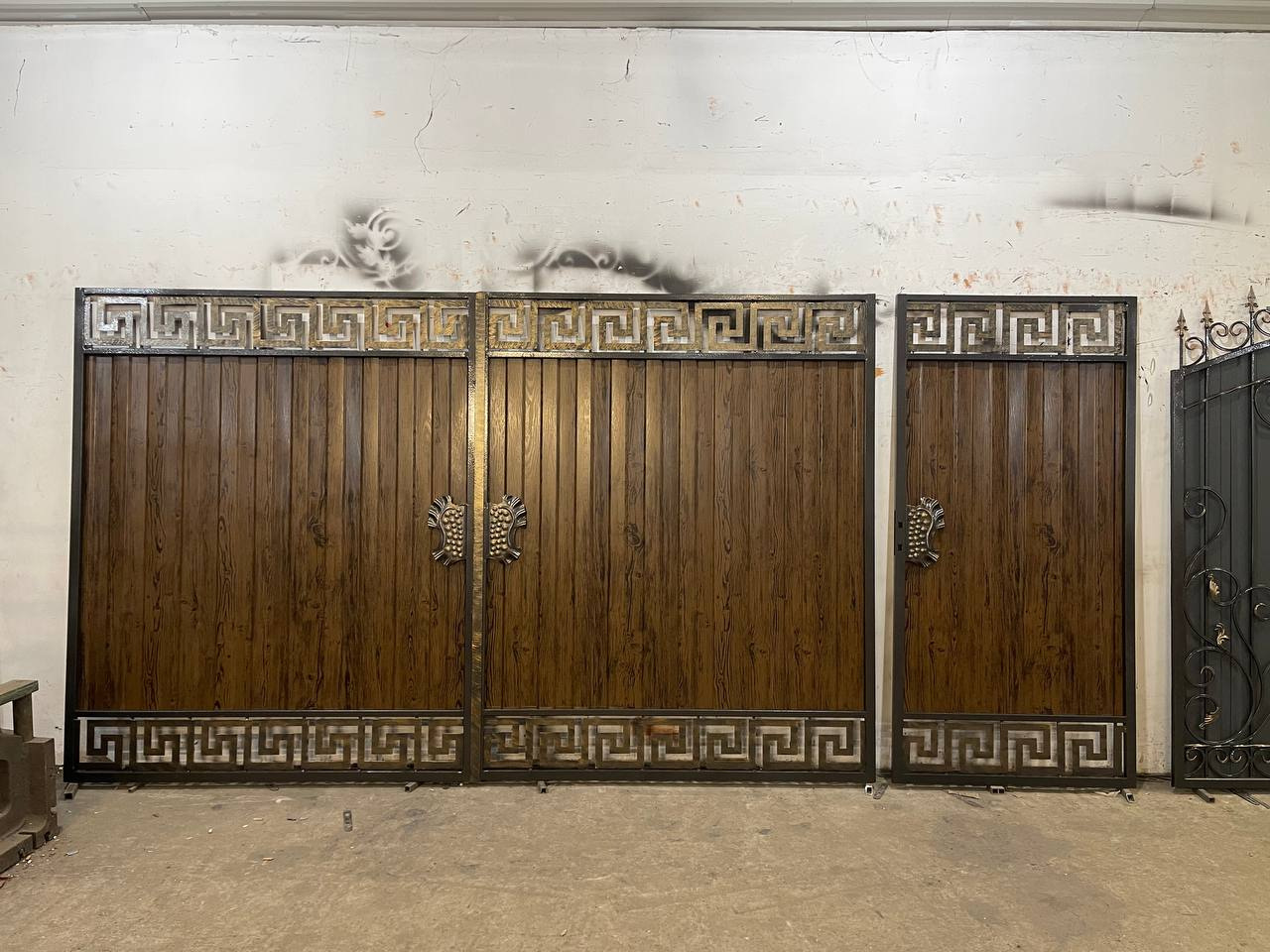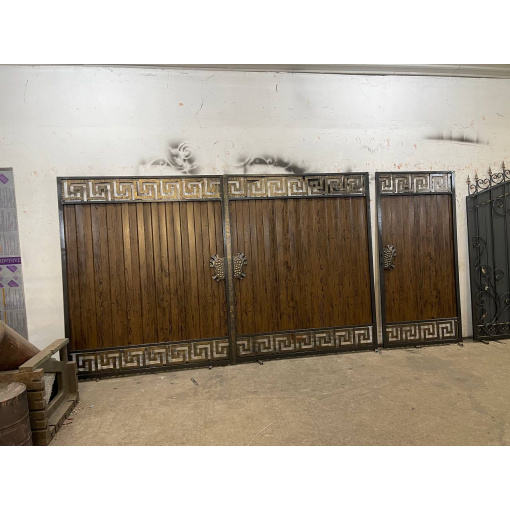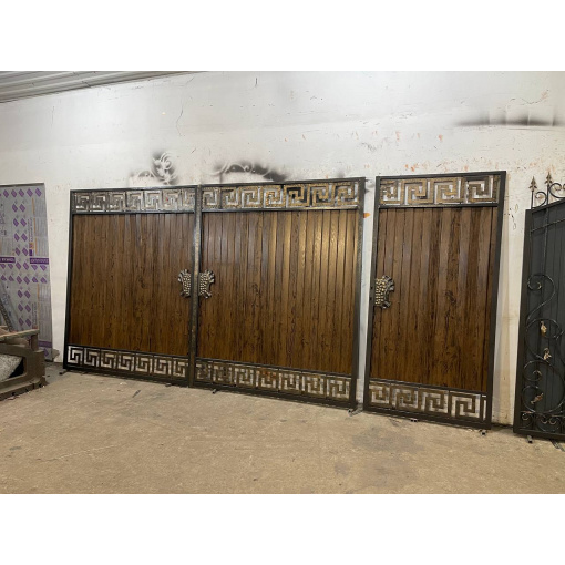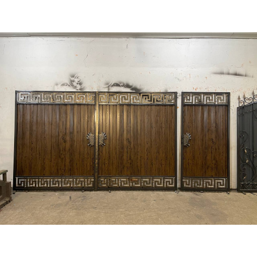 Стильные ворота с профнастилом и греческим орнаментом А-0177