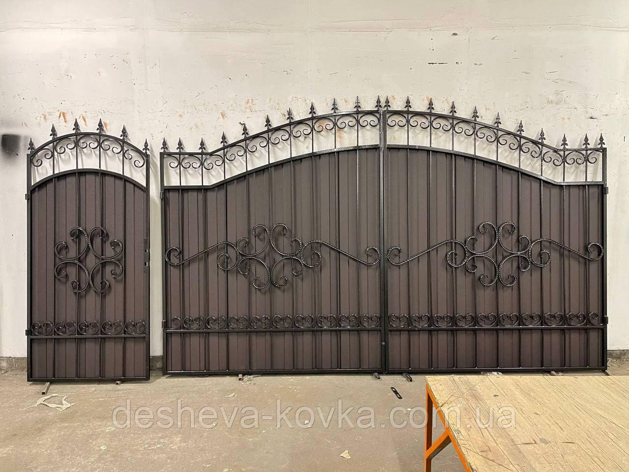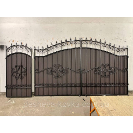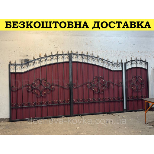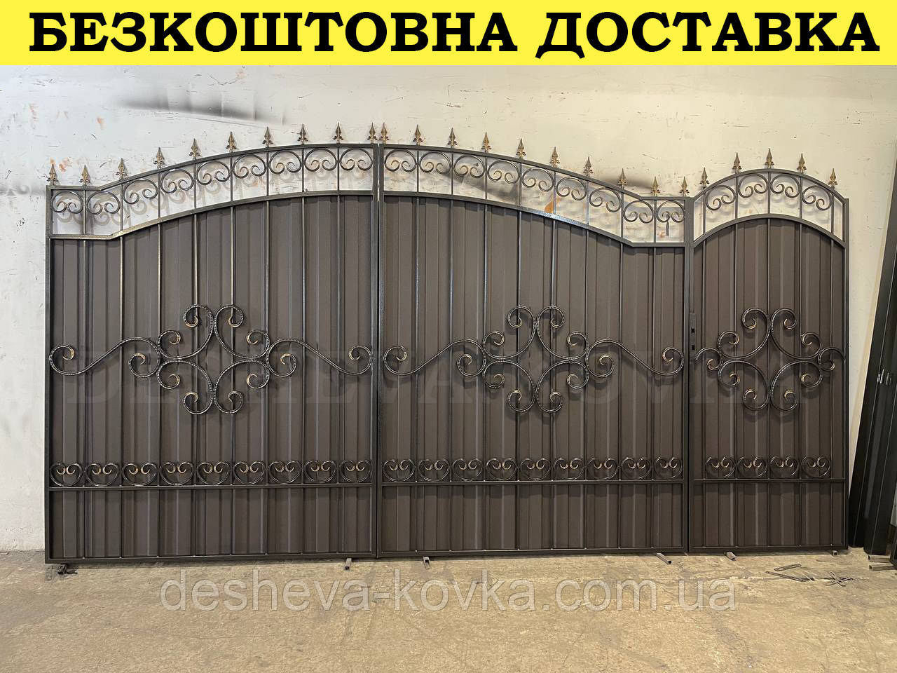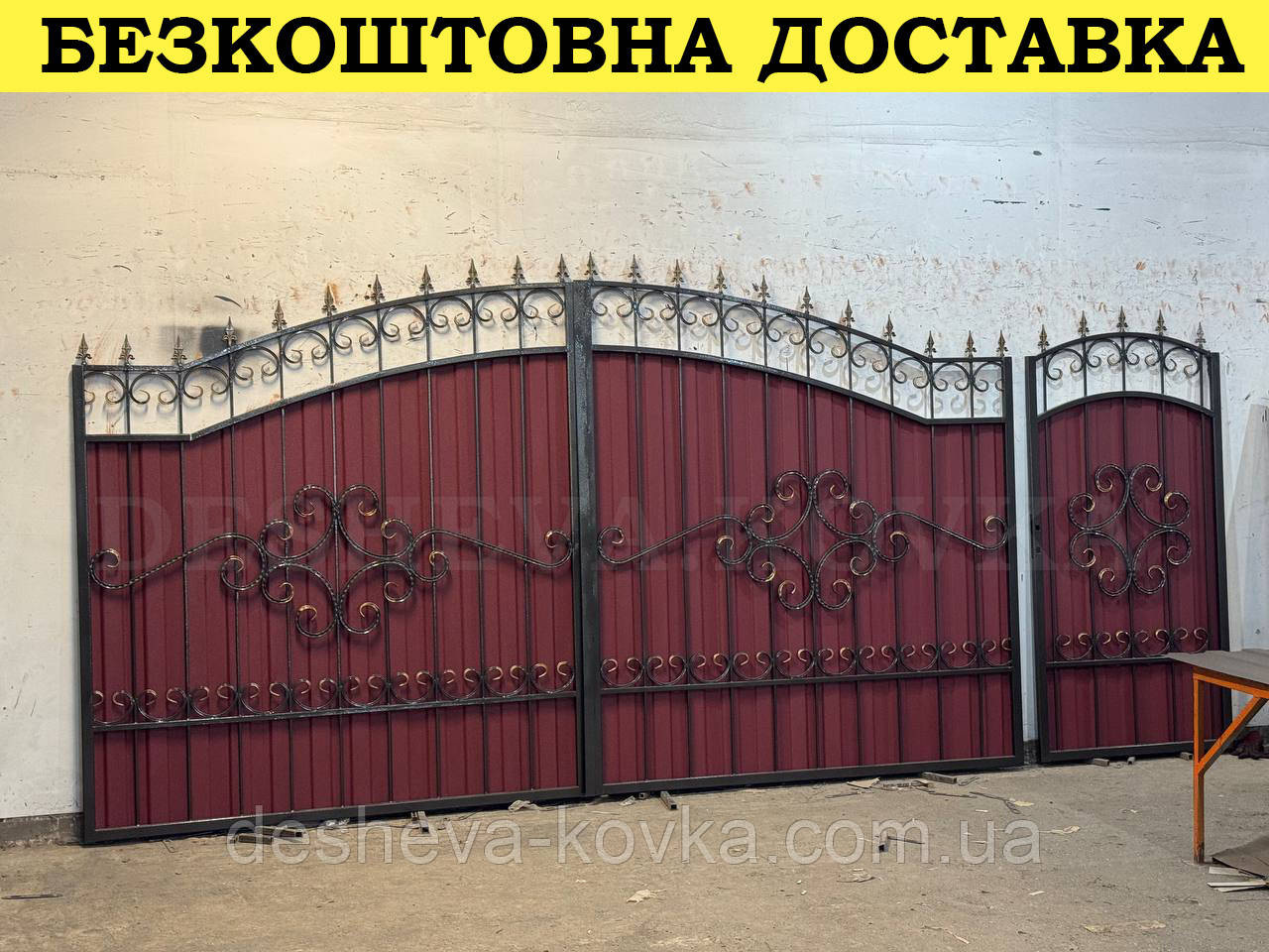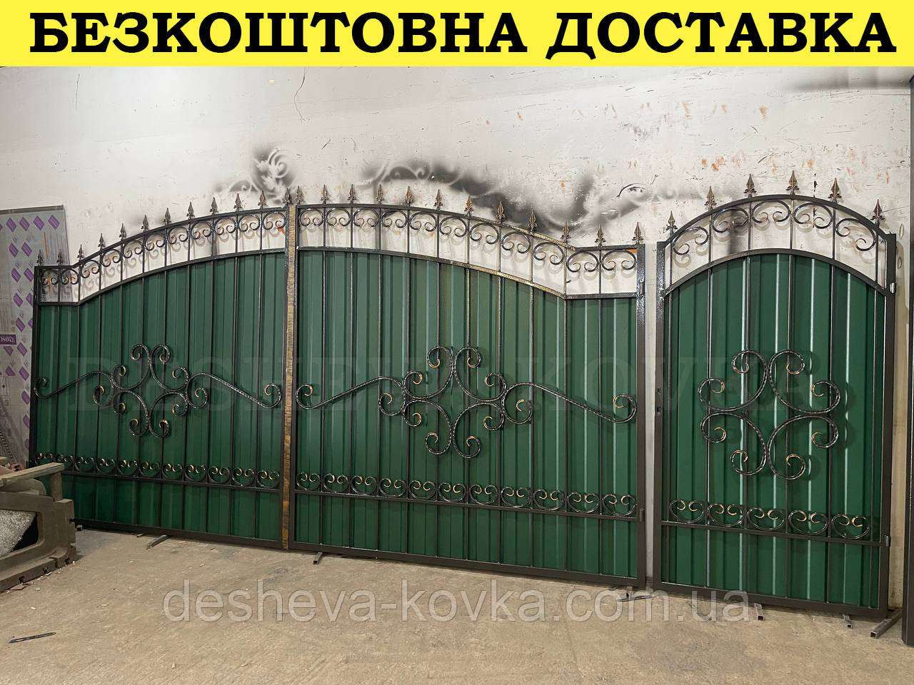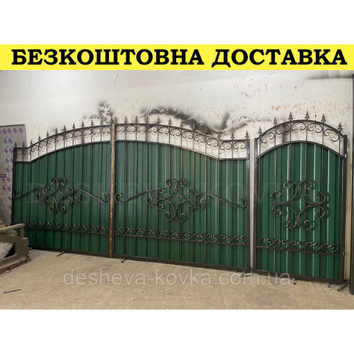 Ворота из профнастила и коваными элементами Код: А-0164 Мы изготовим ворота индивидуально по вашим размерам за 4 рабочих дня. Наши ворота производятся на современном оборудовании специалистами нашей компании, что гарантирует скорость и качество. Уличные ворота из профнастила отлично подходят для обустройства въезда во двор частного дома. Классические конструкции не зря пользуются спросом на протяжении нескольких веков: они хорошо выполняют свои функции, оставаясь простыми и удобными в использовании. Изделие может иметь любую форму и дизайн: из-за его технических особенностей ограничений в возможностях декорирования практически нет. БЕСПЛАТНАЯ доставка по всей Украине! (Доставка курьером до Вашего дома, в любой город/село Украины.) По желанию заказчика калитка может быть справой или с левой стороны. Стандартные размеры: Ворота: 3.4м х 1.7м по столбикам. Калитка: 0.9м х 1.7м по столбикам. Также мы можем изготовить ворота индивидуально по размерам заказчика. Цвет профнастила по выбору! Наша компания является одним из самых больших производств на рынке Украины. Звоните и мы Вас проконсультируем +380965364101.