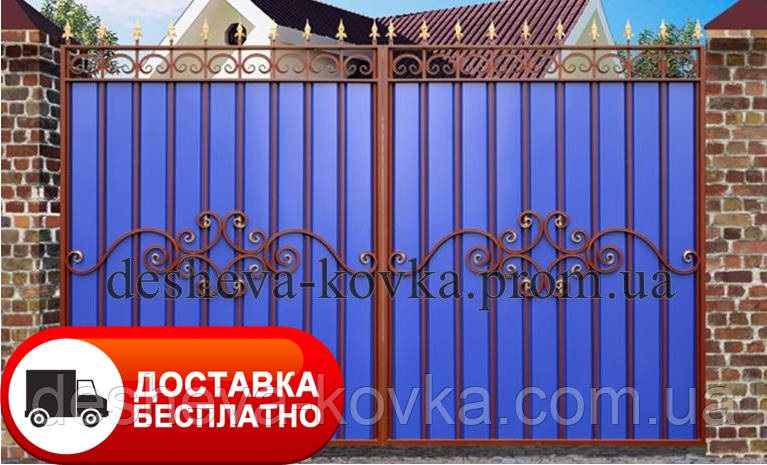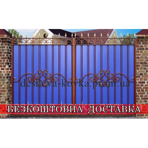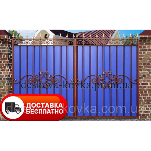 Ворота из профнастилом и коваными элементами Код: А-0132 Мы изготовим ворота индивидуально по вашим размерам за 4 рабочих дня. Наши ворота производятся на современном оборудовании специалистами нашей компании, что гарантирует скорость и качество. Уличные ворота из профнастила отлично подходят для обустройства въезда во двор частного дома. Классические конструкции не зря пользуются спросом на протяжении нескольких веков: они хорошо выполняют свои функции, оставаясь простыми и удобными в использовании. Изделие может иметь любую форму и дизайн: из-за его технических особенностей ограничений в возможностях декорирования практически нет. БЕСПЛАТНАЯ доставка по всей Украине! (Доставка курьером до Вашего дома, в любой город/село Украины.) По желанию заказчика калитка может быть справой или с левой стороны. Стандартные размеры: Ворота: 3.4м х 1.7м по столбикам. Калитка: 0.9м х 1.7м по столбикам. Также мы можем изготовить ворота индивидуально по размерам заказчика. Цвет профнастила по выбору! Наша компания является одним из самых больших производств на рынке Украины. Звоните и мы Вас проконсультируем +380965364101.
