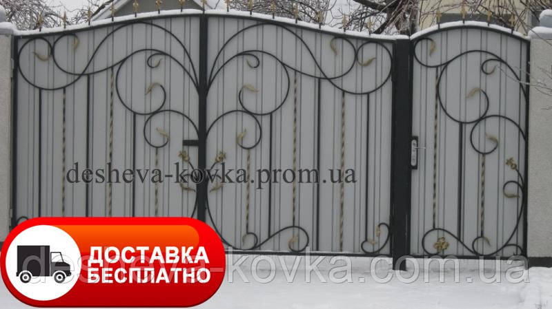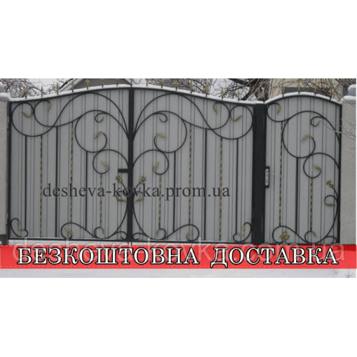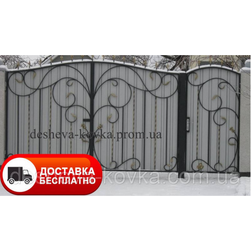 Ворота кованые из профнастила Код: А-01113 Мы изготовим ворота индивидуально по вашим размерам за 4 рабочих дня. Наши ворота производятся на современном оборудовании специалистами нашей компании, что гарантирует скорость и качество. Уличные ворота из профнастила отлично подходят для обустройства въезда во двор частного дома. Классические конструкции не зря пользуются спросом на протяжении нескольких веков: они хорошо выполняют свои функции, оставаясь простыми и удобными в использовании. Изделие может иметь любую форму и дизайн: из-за его технических особенностей ограничений в возможностях декорирования практически нет. БЕСПЛАТНАЯ доставка по всей Украине! (Доставка курьером до Вашего дома, в любой город/село Украины.) По желанию заказчика калитка может быть справой или с левой стороны. Стандартные размеры: Ворота: 3.4м х 1.7м по столбикам. Калитка: 0.9м х 1.7м по столбикам. Также мы можем изготовить ворота индивидуально по размерам заказчика. Цвет профнастила по выбору! Наша компания является одним из самых больших производств на рынке Украины. Звоните и мы Вас проконсультируем +380965364101.