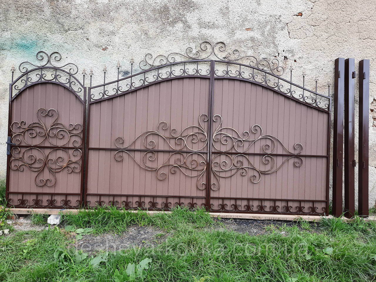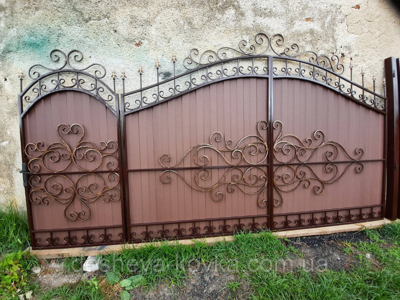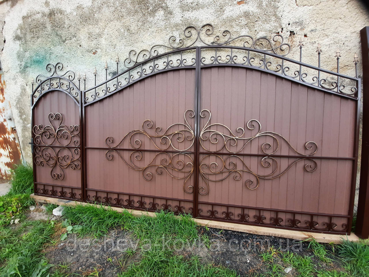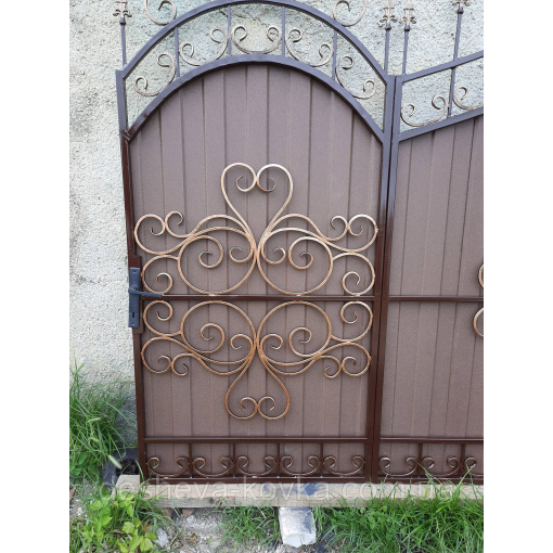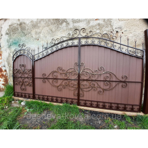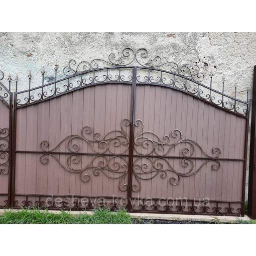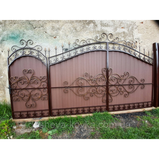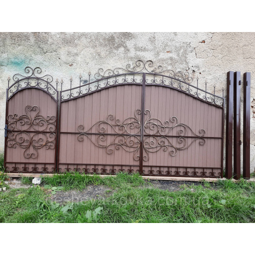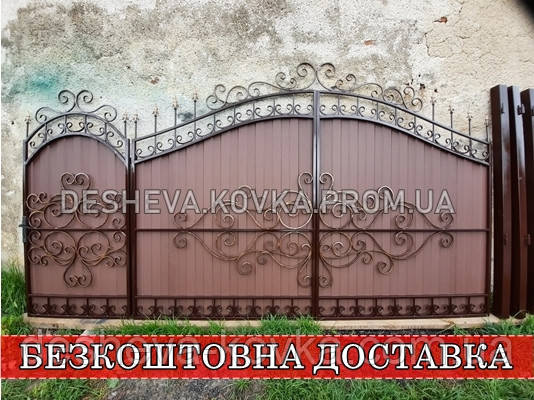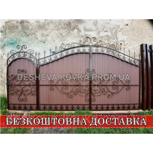 Ворота кованые из профнастила Код: А-0180 Мы изготовим ворота индивидуально по вашим размерам за 4 рабочих дня. Наши ворота производятся на современном оборудовании специалистами нашей компании, что гарантирует скорость и качество. Уличные ворота из профнастила отлично подходят для обустройства въезда во двор частного дома. Классические конструкции не зря пользуются спросом на протяжении нескольких веков: они хорошо выполняют свои функции, оставаясь простыми и удобными в использовании. Изделие может иметь любую форму и дизайн: из-за его технических особенностей ограничений в возможностях декорирования практически нет. БЕСПЛАТНАЯ доставка по всей Украине! (Доставка курьером до Вашего дома, в любой город/село Украины.) По желанию заказчика калитка может быть справой или с левой стороны. Стандартные размеры: Ворота: 3.4м х 1.7м по столбикам. Калитка: 0.9м х 1.7м по столбикам. Также мы можем изготовить ворота индивидуально по размерам заказчика. Цвет профнастила по выбору! Наша компания является одним из самых больших производств на рынке Украины. Звоните и мы Вас проконсультируем +380965364101.
