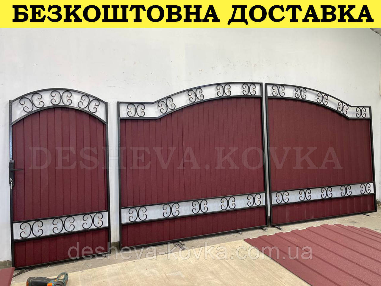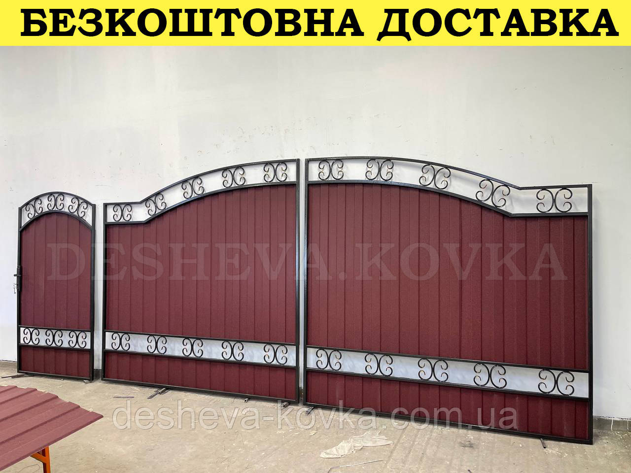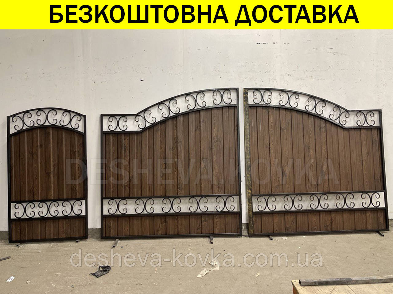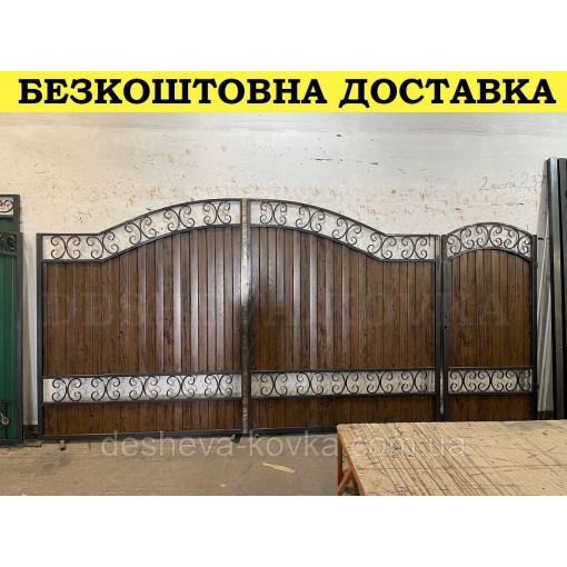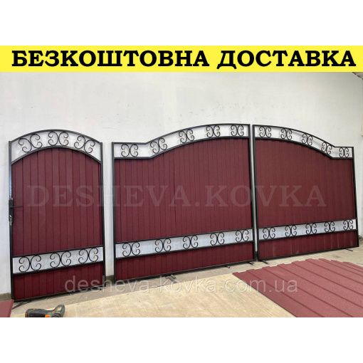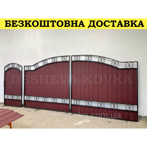 Ворота кованые из профнастилом Код: А-0109 Мы изготовим ворота индивидуально по вашим размерам за 4 рабочих дня. Наши ворота производятся на современном оборудовании специалистами нашей компании, что гарантирует скорость и качество. Уличные ворота из профнастила отлично подходят для обустройства въезда во двор частного дома. Классические конструкции не зря пользуются спросом на протяжении нескольких веков: они хорошо выполняют свои функции, оставаясь простыми и удобными в использовании. Изделие может иметь любую форму и дизайн: из-за его технических особенностей ограничений в возможностях декорирования практически нет. БЕСПЛАТНАЯ доставка по всей Украине! (Доставка курьером до Вашего дома, в любой город/село Украины.) По желанию заказчика калитка может быть справой или с левой стороны. Стандартные размеры: Ворота: 3.4м х 1.7м по столбикам. Калитка: 0.9м х 1.7м по столбикам. Также мы можем изготовить ворота индивидуально по размерам заказчика. Цвет профнастила по выбору! Наша компания является одним из самых больших производств на рынке Украины. Звоните и мы Вас проконсультируем +380965364101.