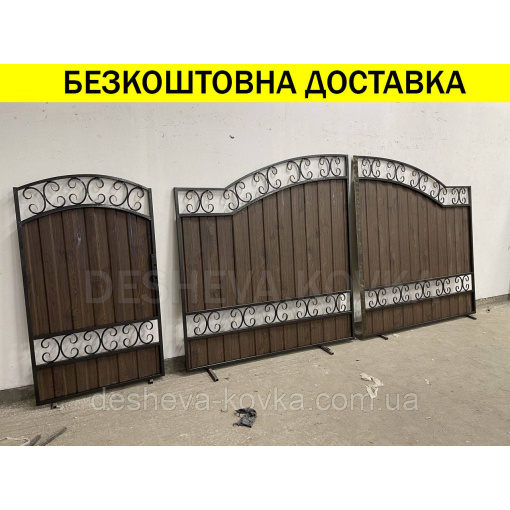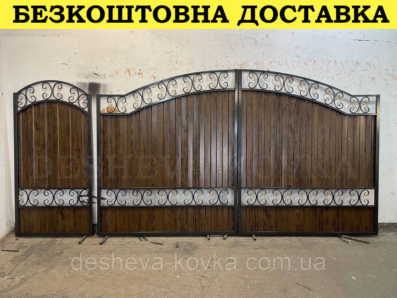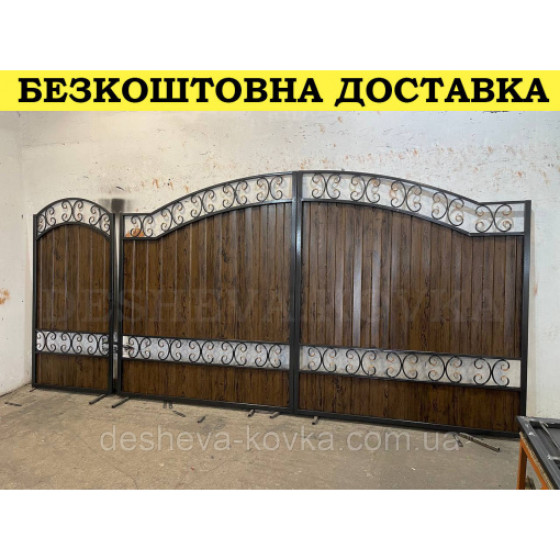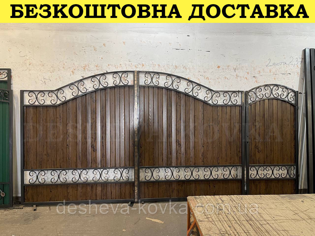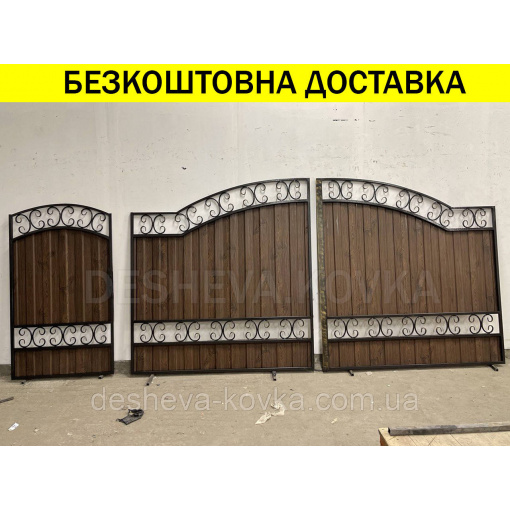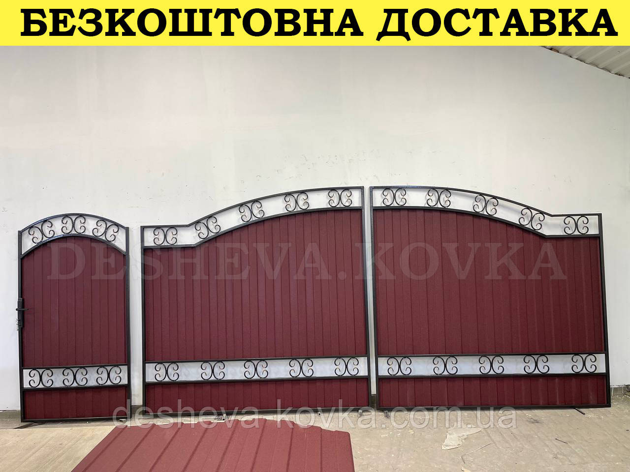 Ворота кованые из профнастилом Код: А-0109 Мы изготовим ворота индивидуально по вашим размерам за 4 рабочих дня. Наши ворота производятся на современном оборудовании специалистами нашей компании, что гарантирует скорость и качество. Уличные ворота из профнастила отлично подходят для обустройства въезда во двор частного дома. Классические конструкции не зря пользуются спросом на протяжении нескольких веков: они хорошо выполняют свои функции, оставаясь простыми и удобными в использовании. Изделие может иметь любую форму и дизайн: из-за его технических особенностей ограничений в возможностях декорирования практически нет. БЕСПЛАТНАЯ доставка по всей Украине! (Доставка курьером до Вашего дома, в любой город/село Украины.) По желанию заказчика калитка может быть справой или с левой стороны. Стандартные размеры: Ворота: 3.4м х 1.7м по столбикам. Калитка: 0.9м х 1.7м по столбикам. Также мы можем изготовить ворота индивидуально по размерам заказчика. Цвет профнастила по выбору! Наша компания является одним из самых больших производств на рынке Украины. Звоните и мы Вас проконсультируем +380965364101.