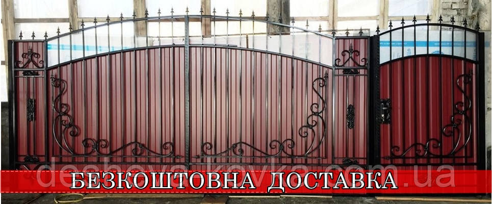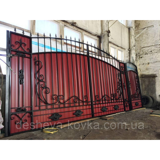 Ворота кованые из профнастилом Код: А-01147 Мы изготовим ворота индивидуально по вашим размерам за 4 рабочих дня. Наши ворота производятся на современном оборудовании специалистами нашей компании, что гарантирует скорость и качество. Уличные ворота из профнастила отлично подходят для обустройства въезда во двор частного дома. Классические конструкции не зря пользуются спросом на протяжении нескольких веков: они хорошо выполняют свои функции, оставаясь простыми и удобными в использовании. Изделие может иметь любую форму и дизайн: из-за его технических особенностей ограничений в возможностях декорирования практически нет. БЕСПЛАТНАЯ доставка по всей Украине! (Доставка курьером до Вашего дома, в любой город/село Украины.) По желанию заказчика калитка может быть справой или с левой стороны. Стандартные размеры: Ворота: 3.4м х 1.7м по столбикам. Калитка: 0.9м х 1.7м по столбикам. Также мы можем изготовить ворота индивидуально по размерам заказчика. Цвет профнастила по выбору! Наша компания является одним из самых больших производств на рынке Украины. Звоните и мы Вас проконсультируем +380965364101.