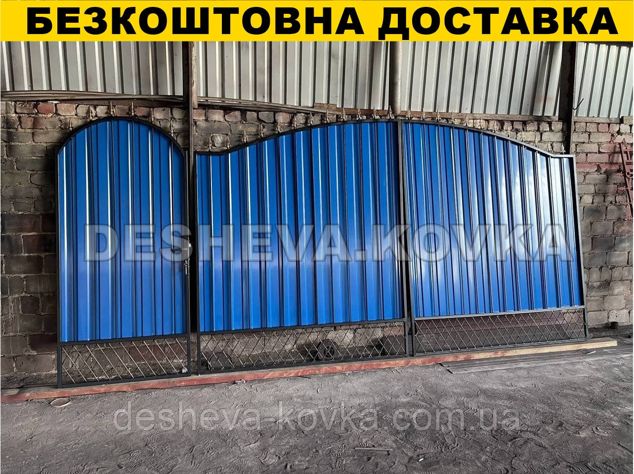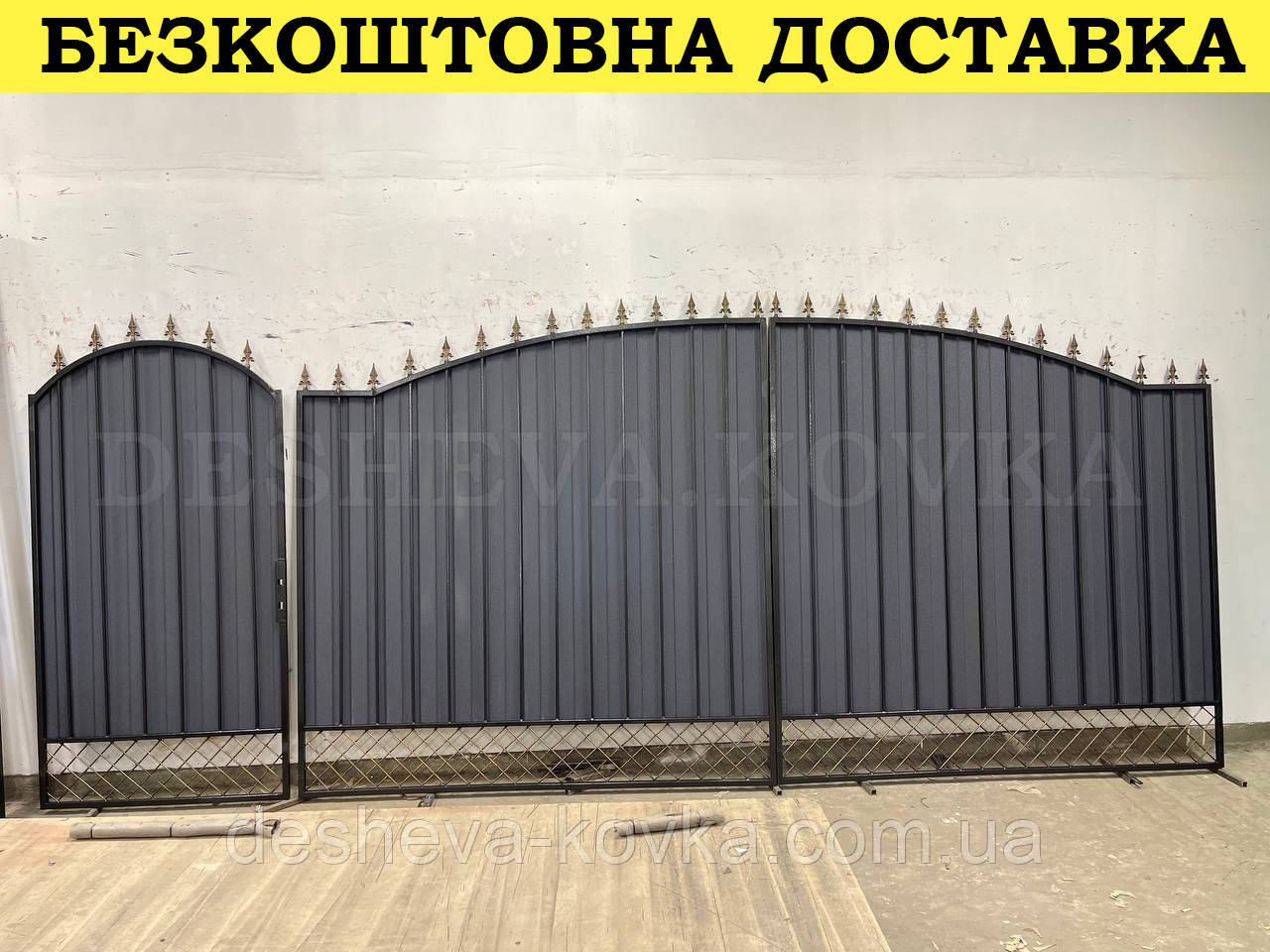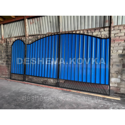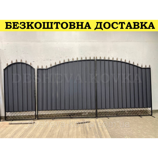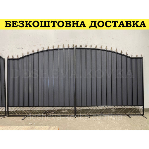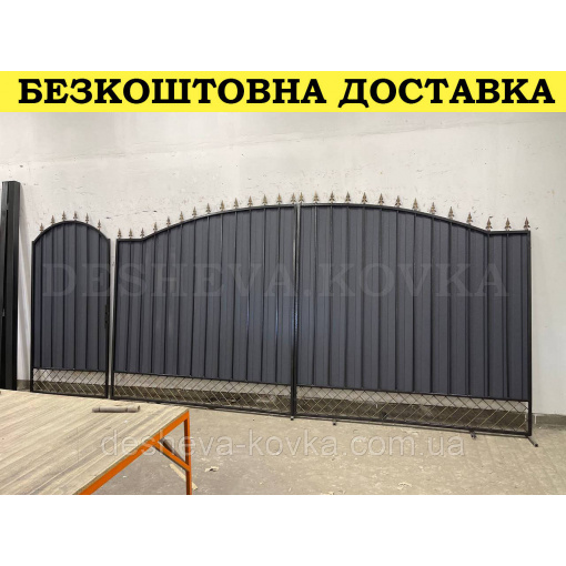 Ворота кованые из профнастилом Код: А-0111 Мы изготовим ворота индивидуально по вашим размерам за 4 рабочих дня. Наши ворота производятся на современном оборудовании специалистами нашей компании, что гарантирует скорость и качество. Уличные ворота из профнастила отлично подходят для обустройства въезда во двор частного дома. Классические конструкции не зря пользуются спросом на протяжении нескольких веков: они хорошо выполняют свои функции, оставаясь простыми и удобными в использовании. Изделие может иметь любую форму и дизайн: из-за его технических особенностей ограничений в возможностях декорирования практически нет. БЕСПЛАТНАЯ доставка по всей Украине! (Доставка курьером до Вашего дома, в любой город/село Украины.) По желанию заказчика калитка может быть справой или с левой стороны. Стандартные размеры: Ворота: 3.4м х 1.7м по столбикам. Калитка: 0.9м х 1.7м по столбикам. Также мы можем изготовить ворота индивидуально по размерам заказчика. Цвет профнастила по выбору! Наша компания является одним из самых больших производств на рынке Украины. Звоните и мы Вас проконсультируем +380965364101.