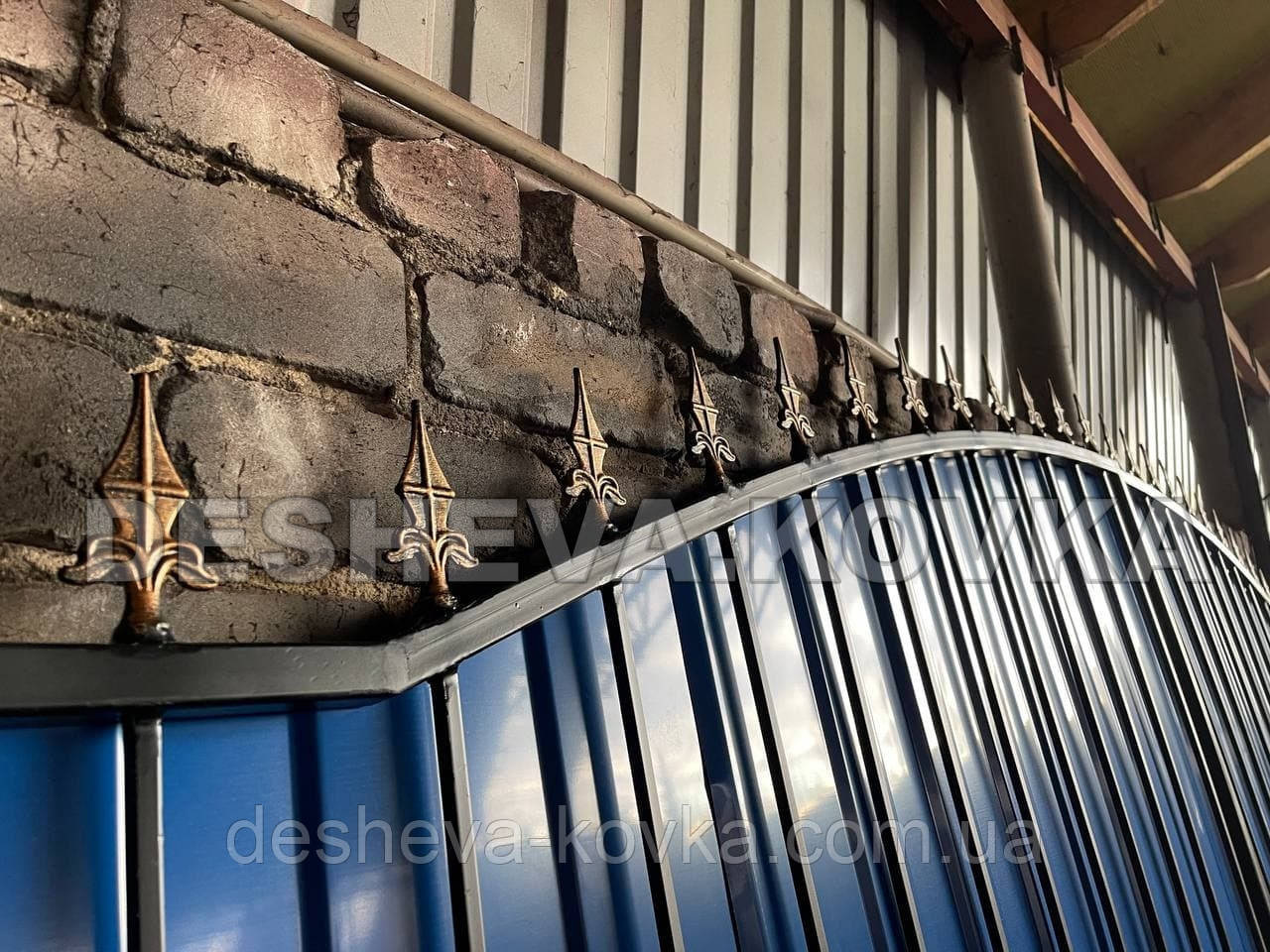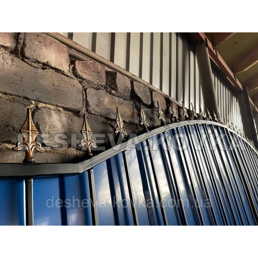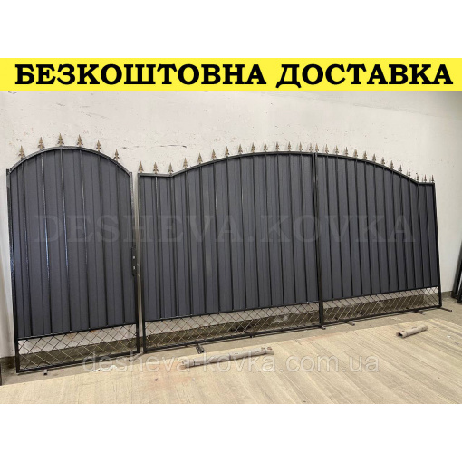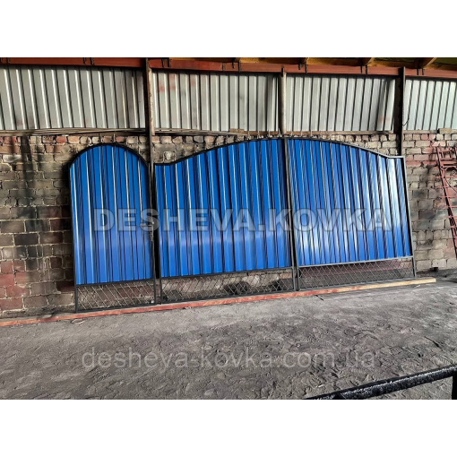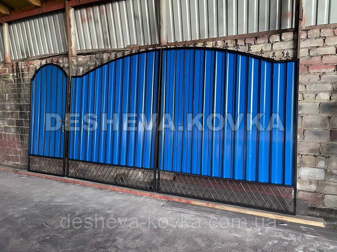 Ворота кованые из профнастилом Код: А-0111 Мы изготовим ворота индивидуально по вашим размерам за 4 рабочих дня. Наши ворота производятся на современном оборудовании специалистами нашей компании, что гарантирует скорость и качество. Уличные ворота из профнастила отлично подходят для обустройства въезда во двор частного дома. Классические конструкции не зря пользуются спросом на протяжении нескольких веков: они хорошо выполняют свои функции, оставаясь простыми и удобными в использовании. Изделие может иметь любую форму и дизайн: из-за его технических особенностей ограничений в возможностях декорирования практически нет. БЕСПЛАТНАЯ доставка по всей Украине! (Доставка курьером до Вашего дома, в любой город/село Украины.) По желанию заказчика калитка может быть справой или с левой стороны. Стандартные размеры: Ворота: 3.4м х 1.7м по столбикам. Калитка: 0.9м х 1.7м по столбикам. Также мы можем изготовить ворота индивидуально по размерам заказчика. Цвет профнастила по выбору! Наша компания является одним из самых больших производств на рынке Украины. Звоните и мы Вас проконсультируем +380965364101.