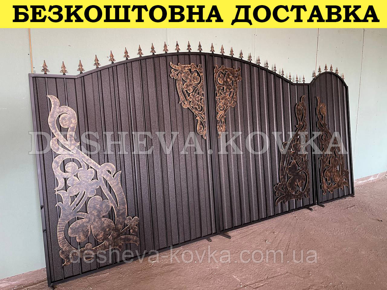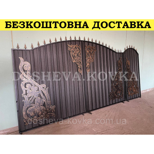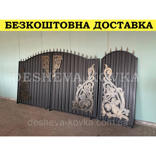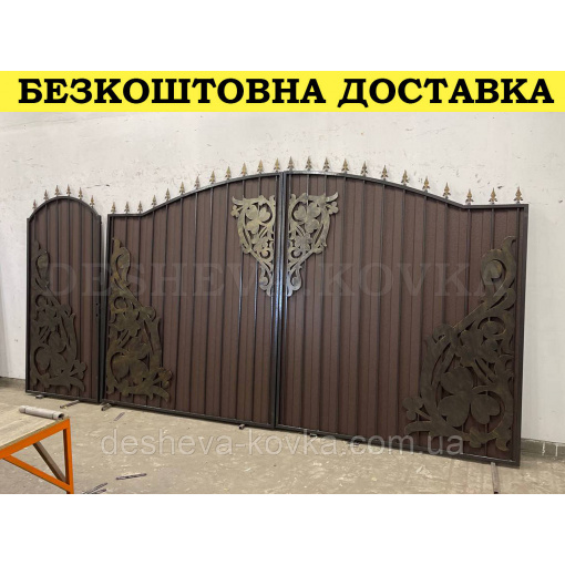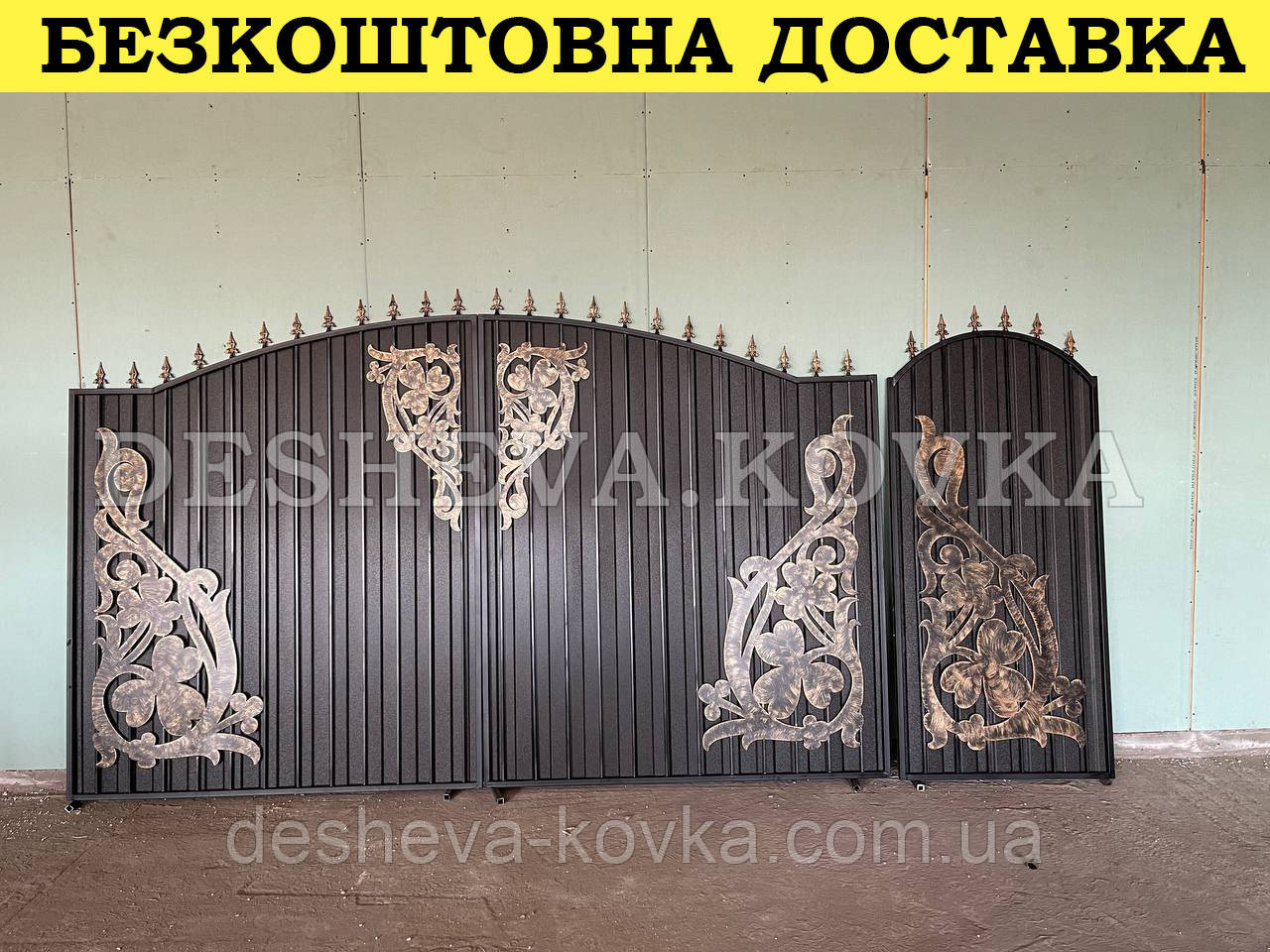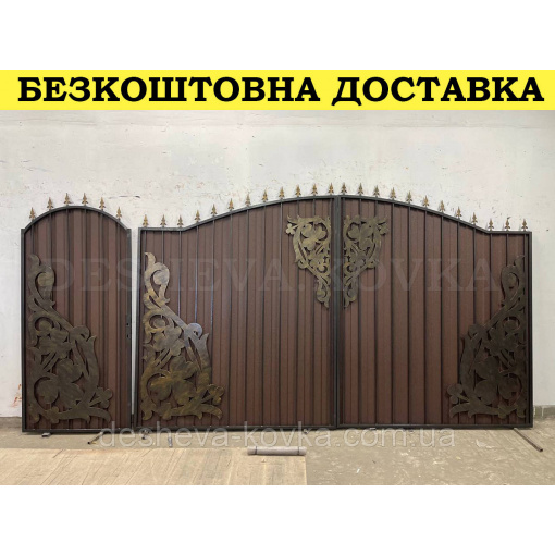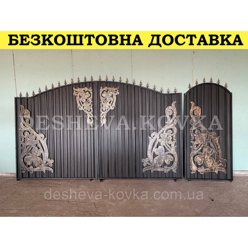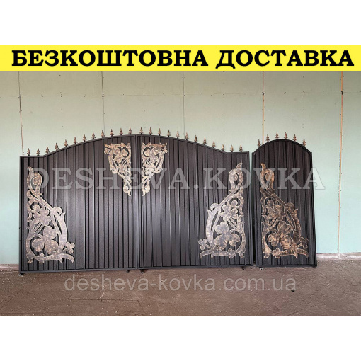 Подробные характеристики Ворота кованые из профнастилом и калиткой Код: А-01219.