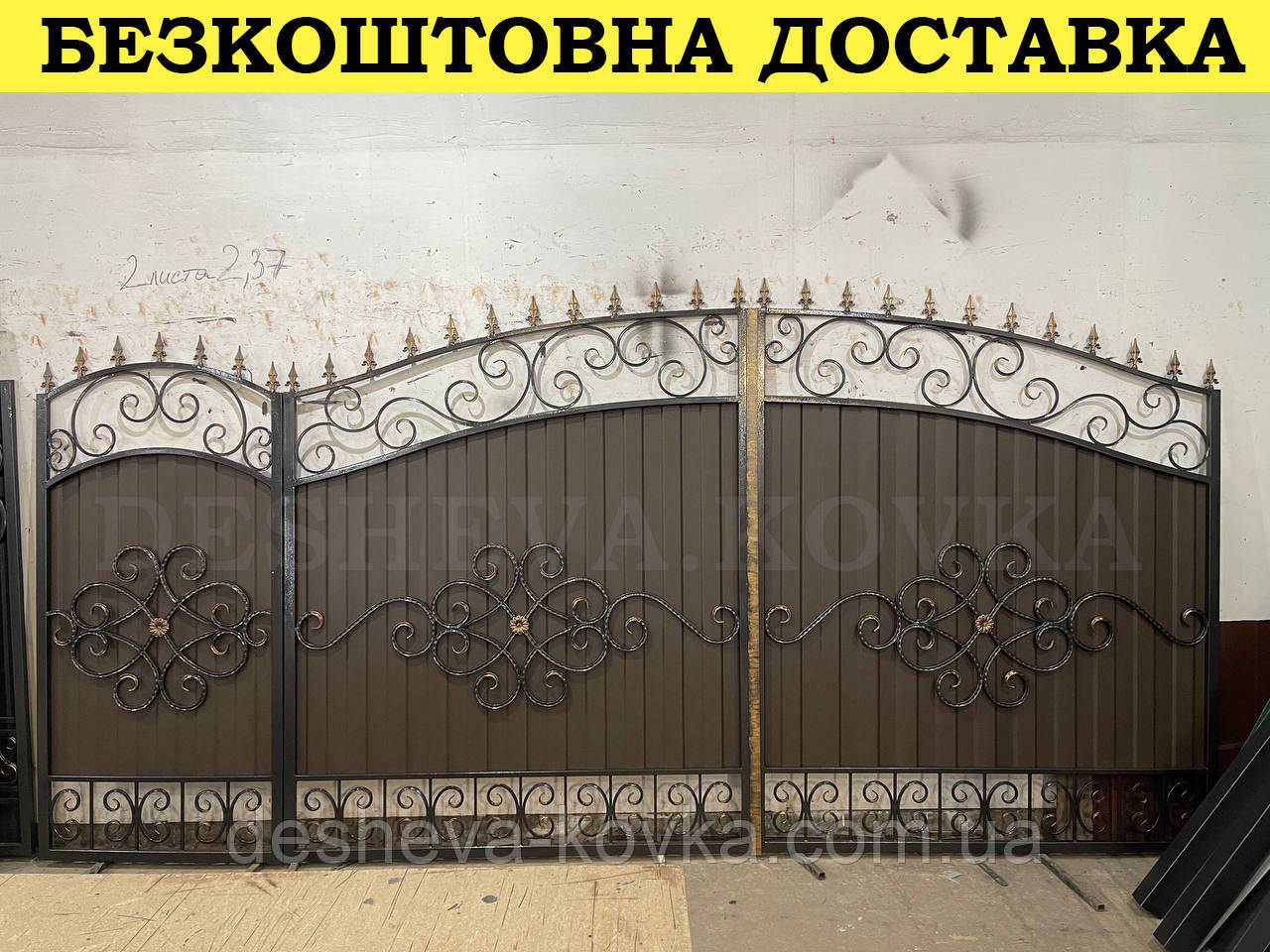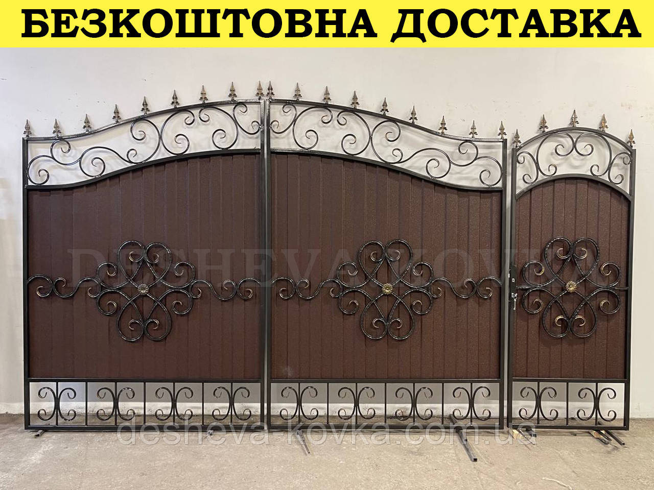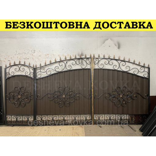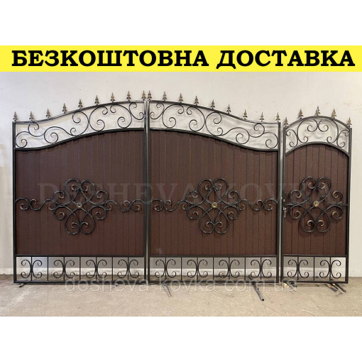 Подробные характеристики Ворота кованые из профнастилом и калиткой Код: А-01248.