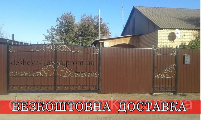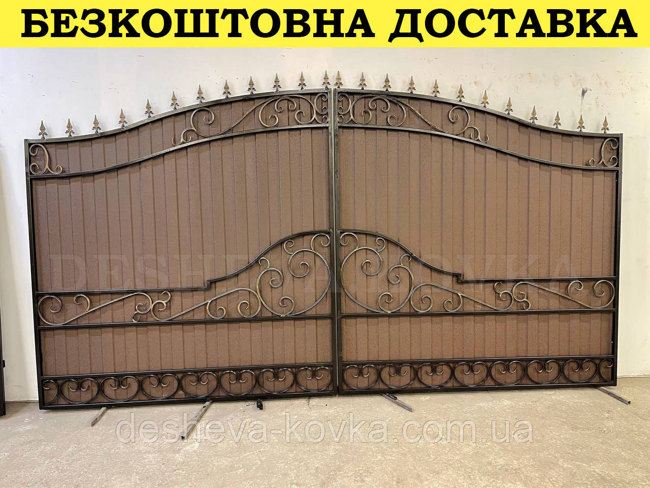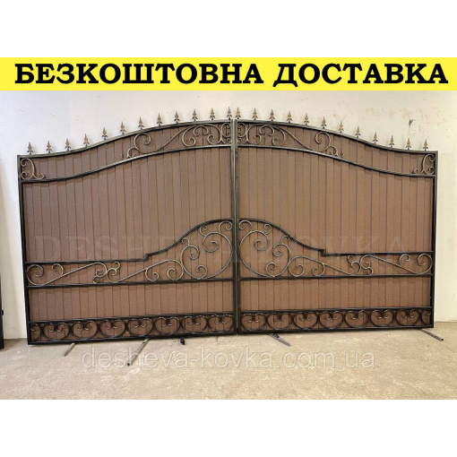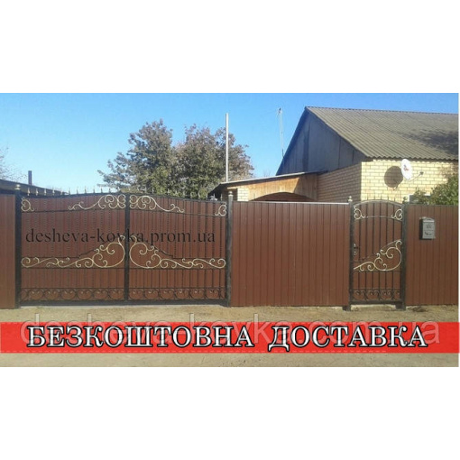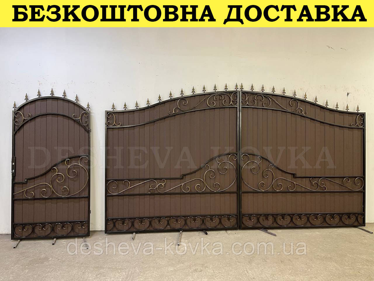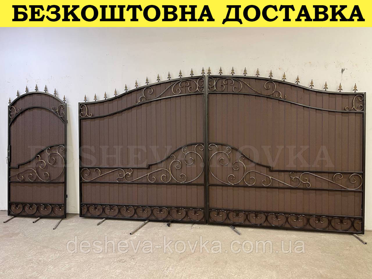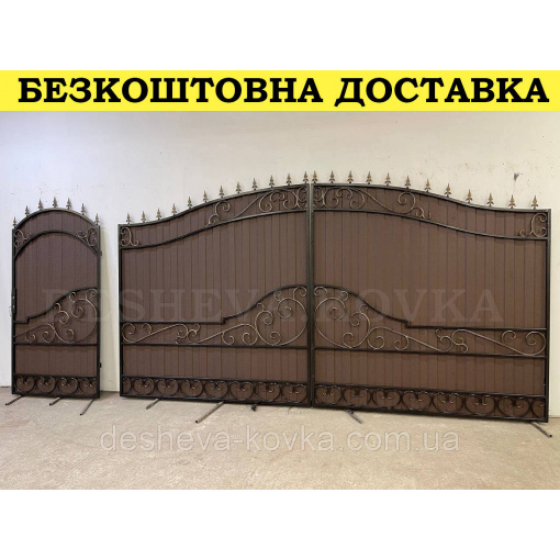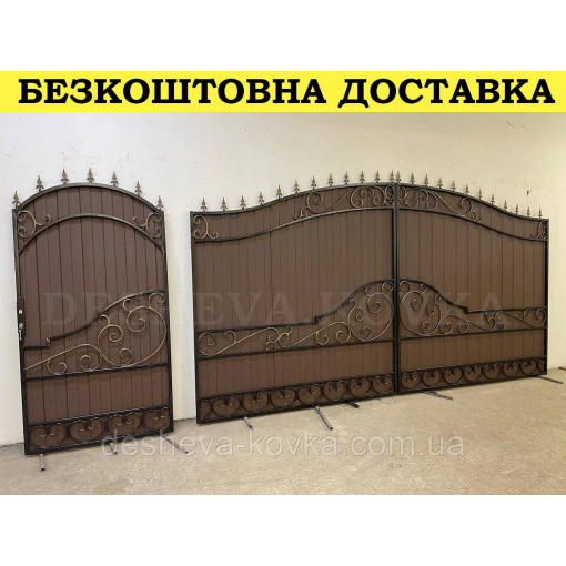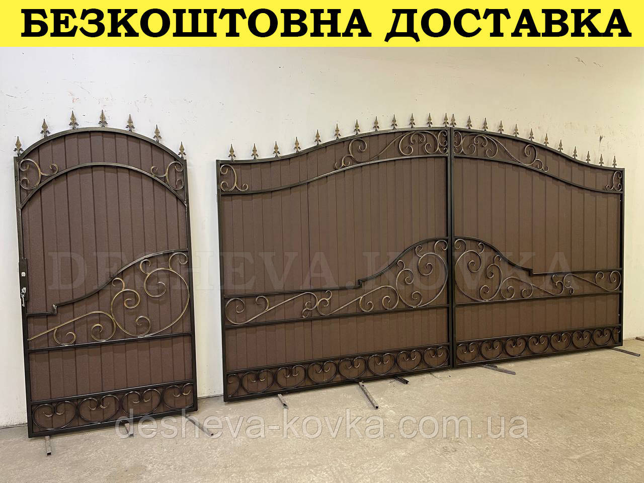 Кованые распашные ворота из калиткой Код: А-0195 Мы изготовим ворота индивидуально по вашим размерам за 4 рабочих дня. Наши ворота производятся на современном оборудовании специалистами нашей компании, что гарантирует скорость и качество. Уличные ворота из профнастила отлично подходят для обустройства въезда во двор частного дома. Классические конструкции не зря пользуются спросом на протяжении нескольких веков: они хорошо выполняют свои функции, оставаясь простыми и удобными в использовании. Изделие может иметь любую форму и дизайн: из-за его технических особенностей ограничений в возможностях декорирования практически нет. БЕСПЛАТНАЯ доставка по всей Украине! (Доставка курьером до Вашего дома, в любой город/село Украины.) По желанию заказчика калитка может быть справой или с левой стороны. Стандартные размеры: Ворота: 3.4м х 1.7м по столбикам. Калитка: 0.9м х 1.7м по столбикам. Также мы можем изготовить ворота индивидуально по размерам заказчика. Цвет профнастила по выбору! Наша компания является одним из самых больших производств на рынке Украины. Звоните и мы Вас проконсультируем +380965364101.