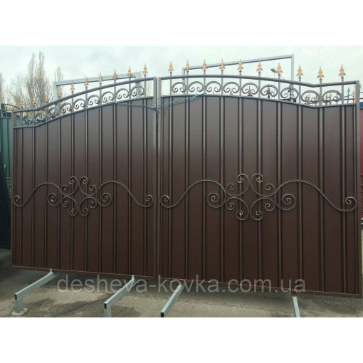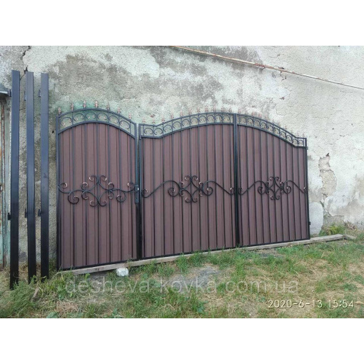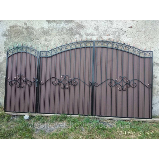 Детальні характеристики Ковані розпашні ворота з хвірткою та профнастилом..