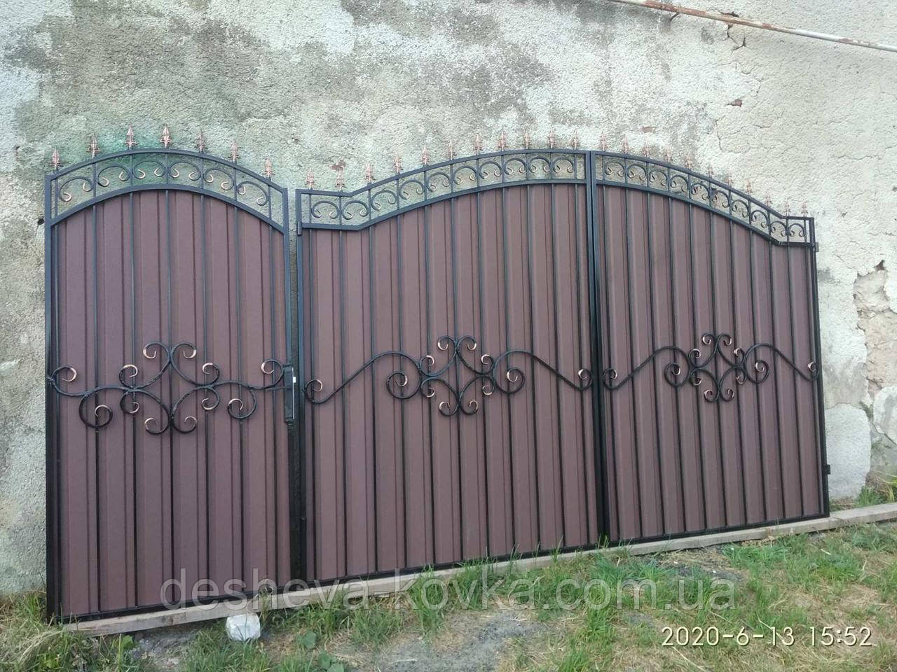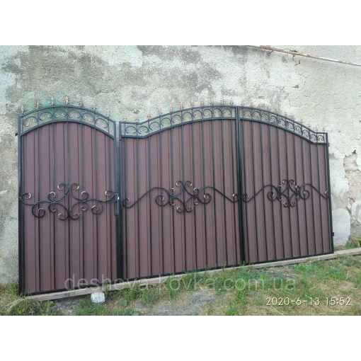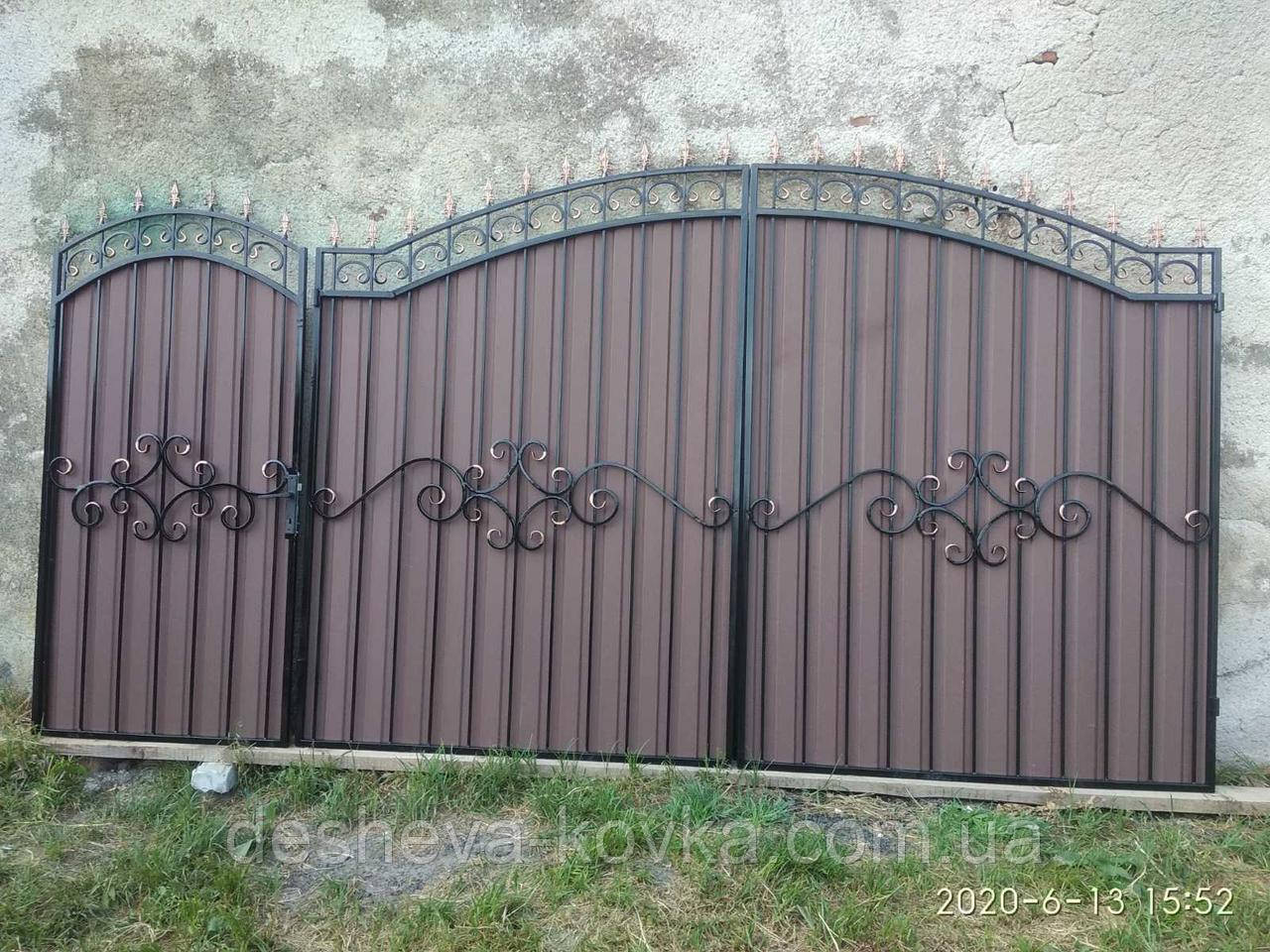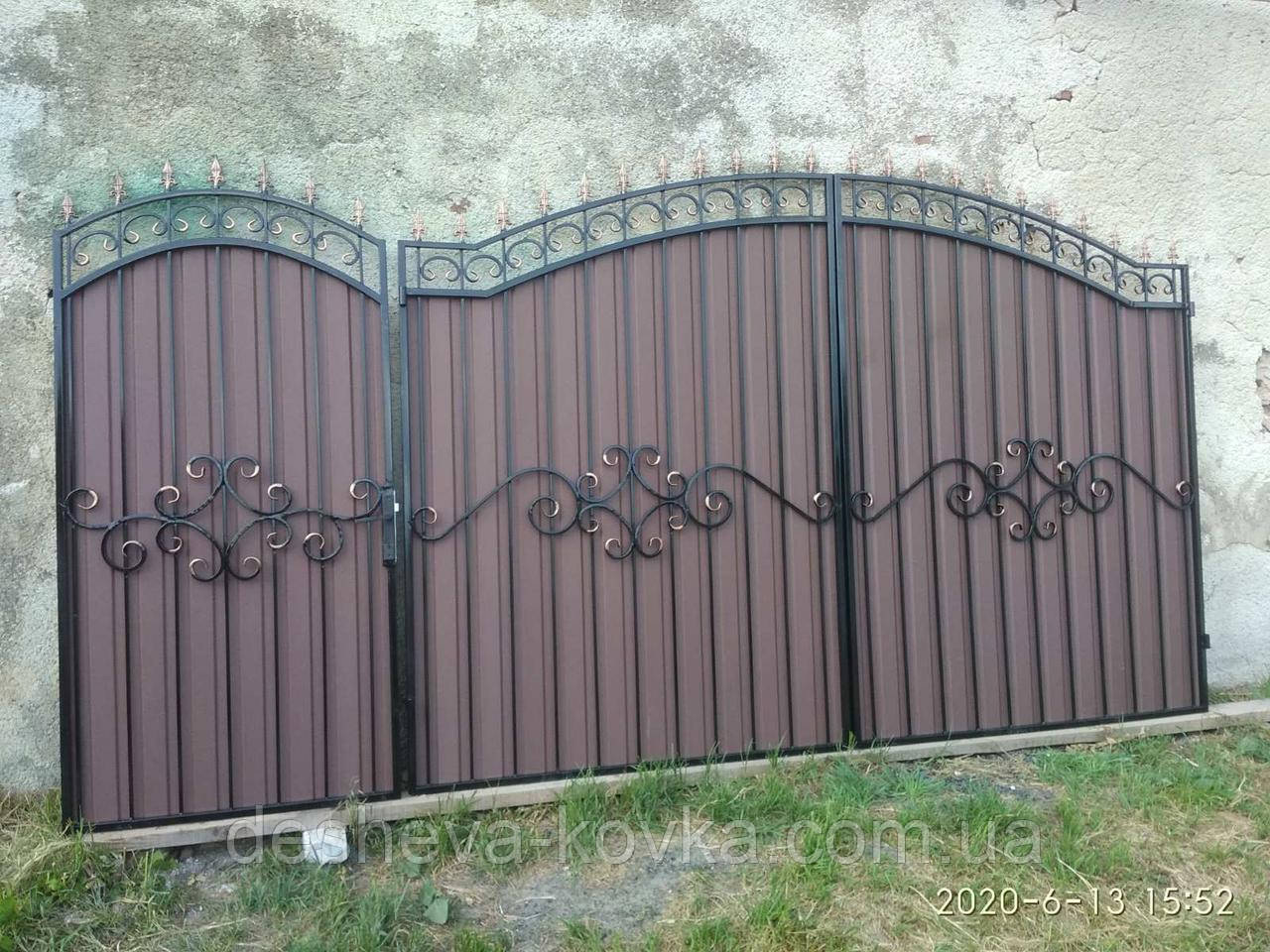 Ковані розпашні ворота з хвірткою та профнастилом.