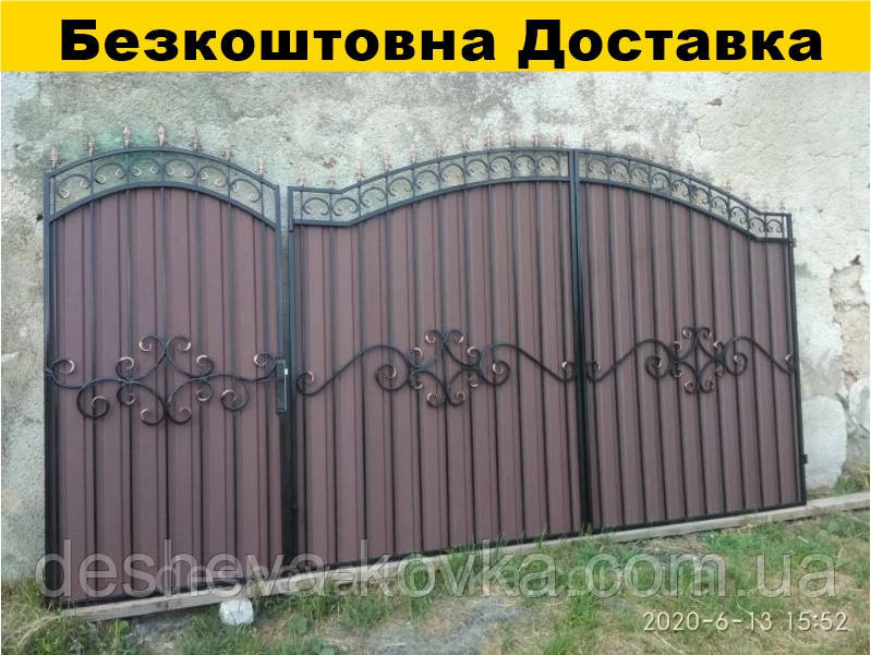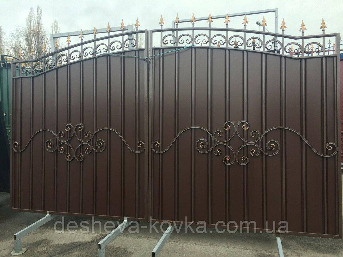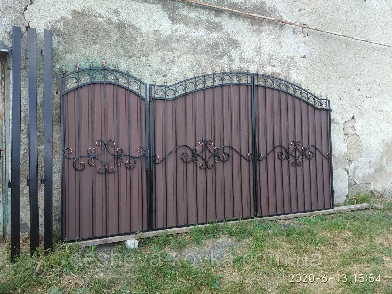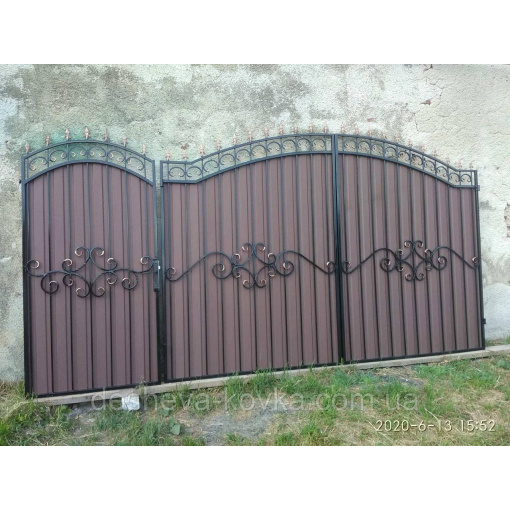 Ковані розпашні ворота з хвірткою та профнастилом.