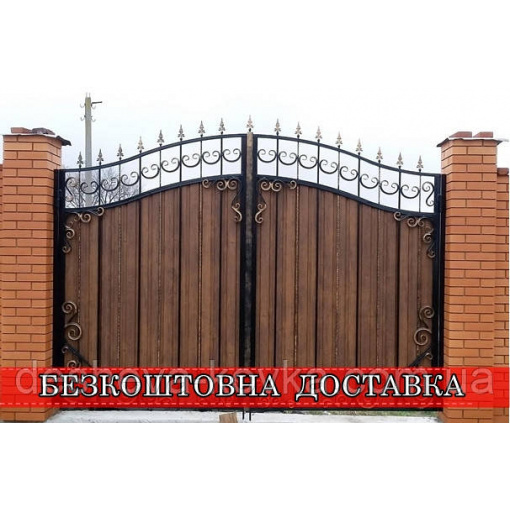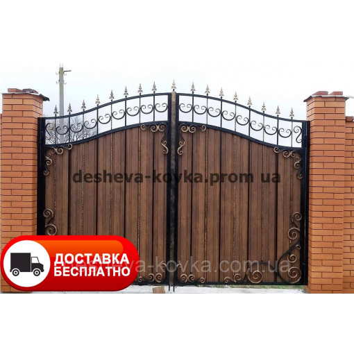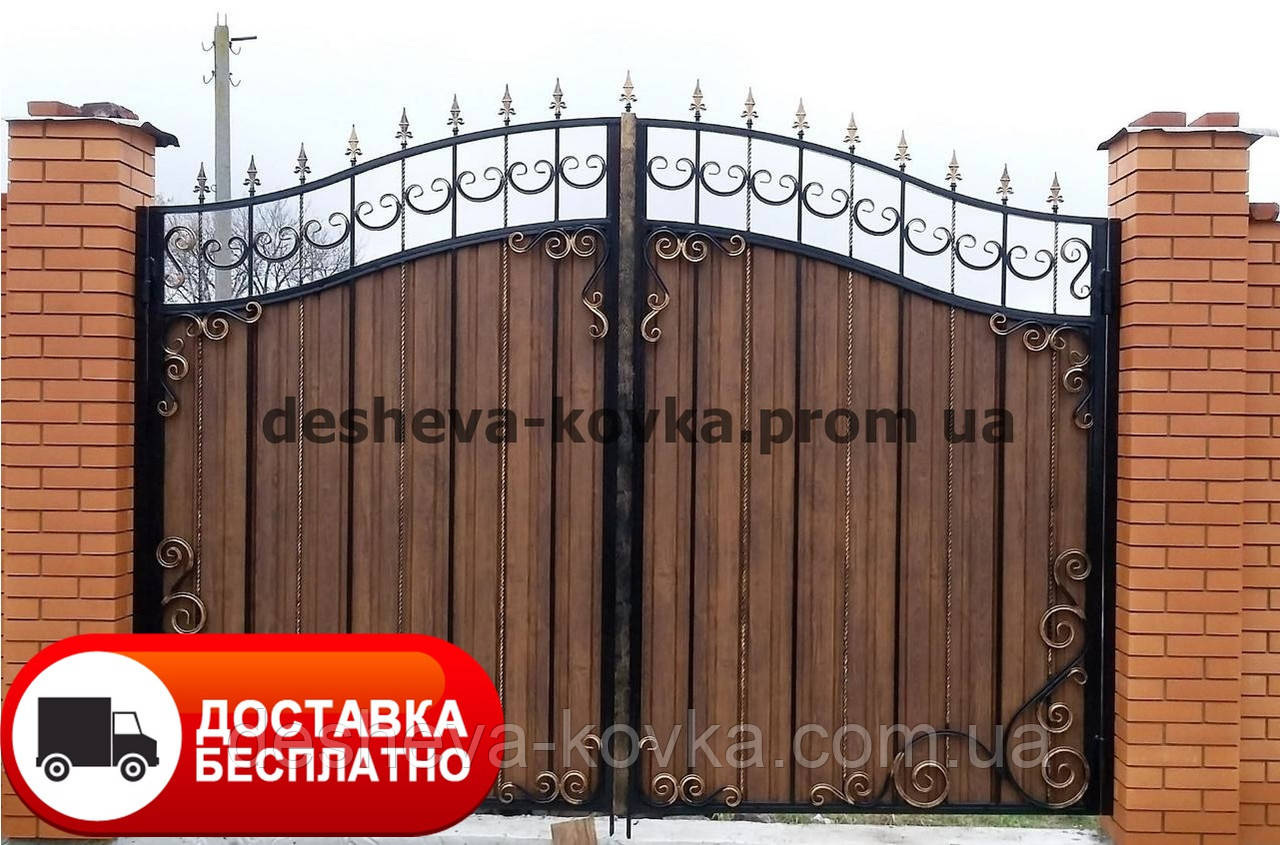 Детальні характеристики Кованые распашные ворота из профнастила и калиткой.