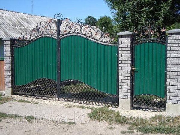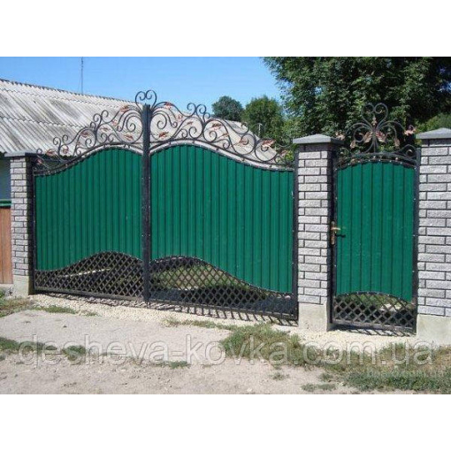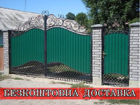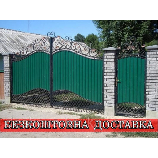 Кованые ворота из профнастила и калиткой Код: А-01159 Мы изготовим ворота индивидуально по вашим размерам за 4 рабочих дня. Наши ворота производятся на современном оборудовании специалистами нашей компании, что гарантирует скорость и качество. Уличные ворота из профнастила отлично подходят для обустройства въезда во двор частного дома. Классические конструкции не зря пользуются спросом на протяжении нескольких веков: они хорошо выполняют свои функции, оставаясь простыми и удобными в использовании. Изделие может иметь любую форму и дизайн: из-за его технических особенностей ограничений в возможностях декорирования практически нет. БЕСПЛАТНАЯ доставка по всей Украине! (Доставка курьером до Вашего дома, в любой город/село Украины.) По желанию заказчика калитка может быть справой или с левой стороны. Стандартные размеры: Ворота: 3.4м х 1.7м по столбикам. Калитка: 0.9м х 1.7м по столбикам. Также мы можем изготовить ворота индивидуально по размерам заказчика. Цвет профнастила по выбору! Наша компания является одним из самых больших производств на рынке Украины. Звоните и мы Вас проконсультируем +380965364101.