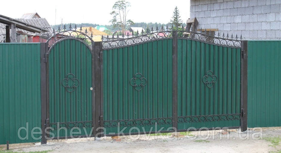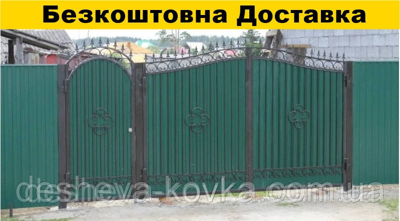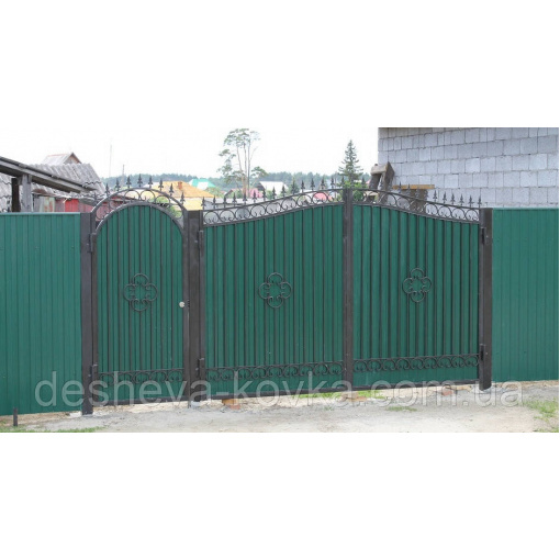 Кованые ворота из профнастила и коваными элементами Код: А-0123 Мы изготовим ворота индивидуально по вашим размерам за 4 рабочих дня. Наши ворота производятся на современном оборудовании специалистами нашей компании, что гарантирует скорость и качество. Уличные ворота из профнастила отлично подходят для обустройства въезда во двор частного дома. Классические конструкции не зря пользуются спросом на протяжении нескольких веков: они хорошо выполняют свои функции, оставаясь простыми и удобными в использовании. Изделие может иметь любую форму и дизайн: из-за его технических особенностей ограничений в возможностях декорирования практически нет. БЕСПЛАТНАЯ доставка по всей Украине! (Доставка курьером до Вашего дома, в любой город/село Украины.) По желанию заказчика калитка может быть справой или с левой стороны. Стандартные размеры: Ворота: 3.4м х 1.7м по столбикам. Калитка: 0.9м х 1.7м по столбикам. Также мы можем изготовить ворота индивидуально по размерам заказчика. Цвет профнастила по выбору! Наша компания является одним из самых больших производств на рынке Украины. Звоните и мы Вас проконсультируем +380965364101.