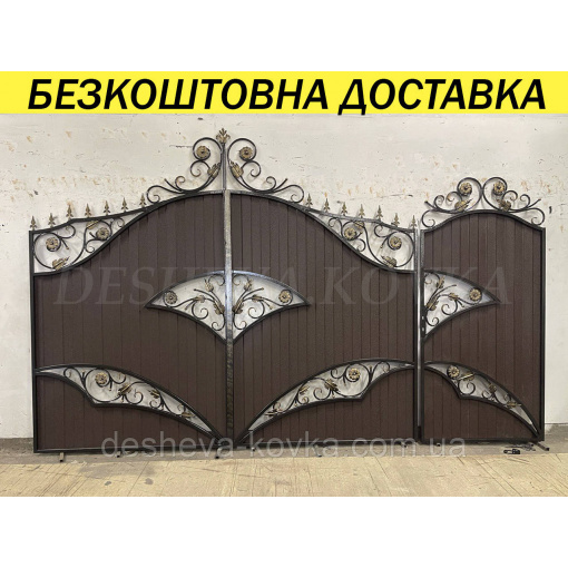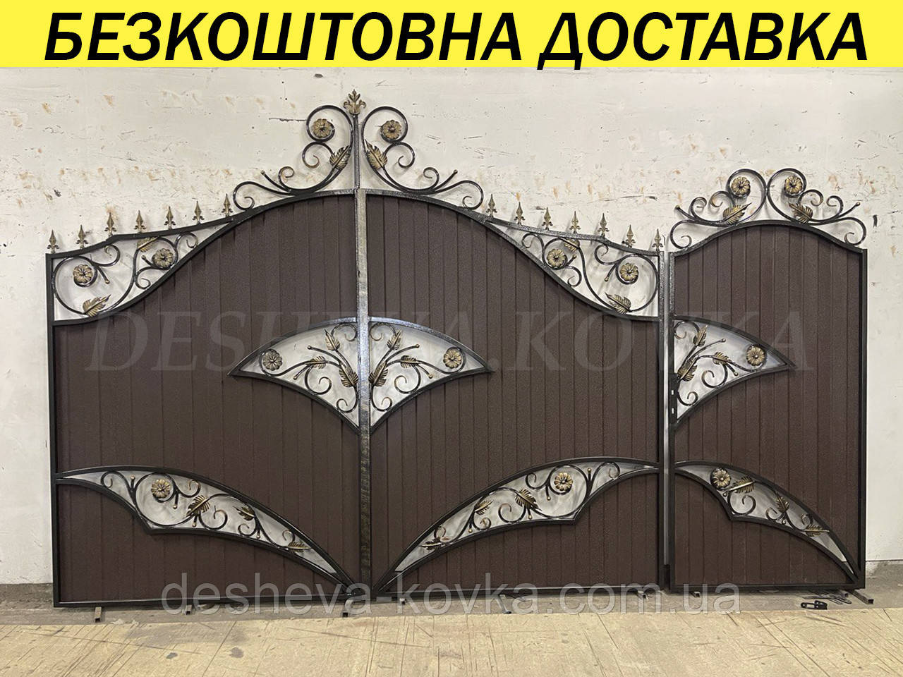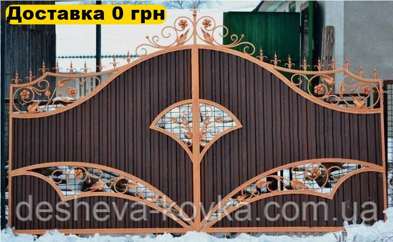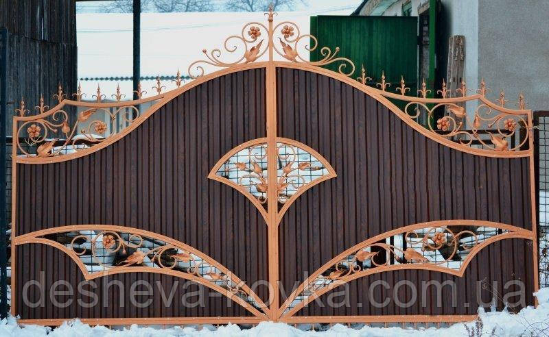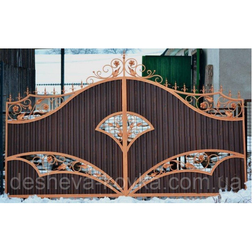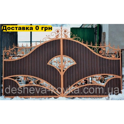 Кованые ворота из профнастила из коваными элементами Код: А-01126 Мы изготовим ворота индивидуально по вашим размерам за 4 рабочих дня. Наши ворота производятся на современном оборудовании специалистами нашей компании, что гарантирует скорость и качество. Уличные ворота из профнастила отлично подходят для обустройства въезда во двор частного дома. Классические конструкции не зря пользуются спросом на протяжении нескольких веков: они хорошо выполняют свои функции, оставаясь простыми и удобными в использовании. Изделие может иметь любую форму и дизайн: из-за его технических особенностей ограничений в возможностях декорирования практически нет. БЕСПЛАТНАЯ доставка по всей Украине! (Доставка курьером до Вашего дома, в любой город/село Украины.) По желанию заказчика калитка может быть справой или с левой стороны. Стандартные размеры: Ворота: 3.4м х 1.7м по столбикам. Калитка: 0.9м х 1.7м по столбикам. Также мы можем изготовить ворота индивидуально по размерам заказчика. Цвет профнастила по выбору! Наша компания является одним из самых больших производств на рынке Украины. Звоните и мы Вас проконсультируем +380965364101.
