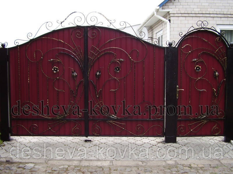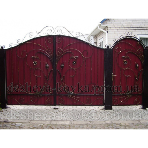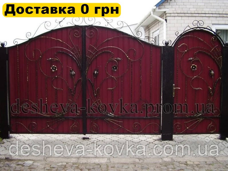Кованые ворота из профнастилом и коваными элементами Код: А-01166 Мы изготовим ворота индивидуально по вашим размерам за 4 рабочих дня. Наши ворота производятся на современном оборудовании специалистами нашей компании, что гарантирует скорость и качество. Уличные ворота из профнастила отлично подходят для обустройства въезда во двор частного дома. Классические конструкции не зря пользуются спросом на протяжении нескольких веков: они хорошо выполняют свои функции, оставаясь простыми и удобными в использовании. Изделие может иметь любую форму и дизайн: из-за его технических особенностей ограничений в возможностях декорирования практически нет. БЕСПЛАТНАЯ доставка по всей Украине! (Доставка курьером до Вашего дома, в любой город/село Украины.) По желанию заказчика калитка может быть справой или с левой стороны. Стандартные размеры: Ворота: 3.4м х 1.7м по столбикам. Калитка: 0.9м х 1.7м по столбикам. Также мы можем изготовить ворота индивидуально по размерам заказчика. Цвет профнастила по выбору! Наша компания является одним из самых больших производств на рынке Украины. Звоните и мы Вас проконсультируем +380965364101.