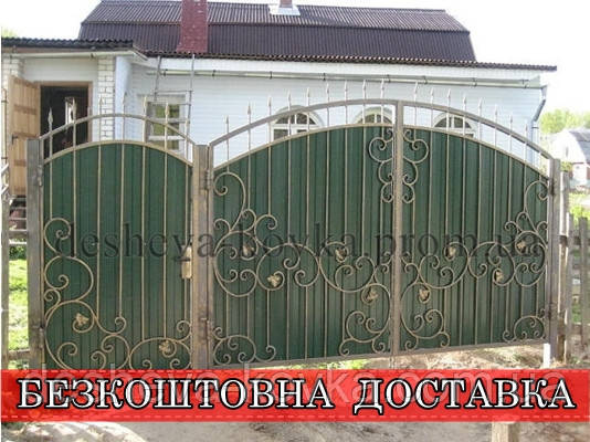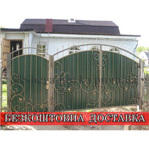 Детальні характеристики Кованые ворота из профнастилом и коваными элементами.
