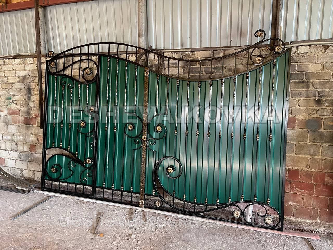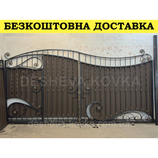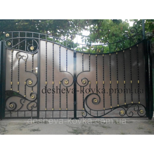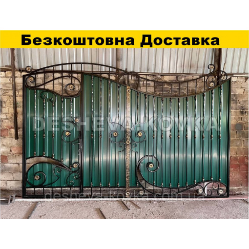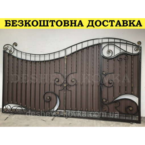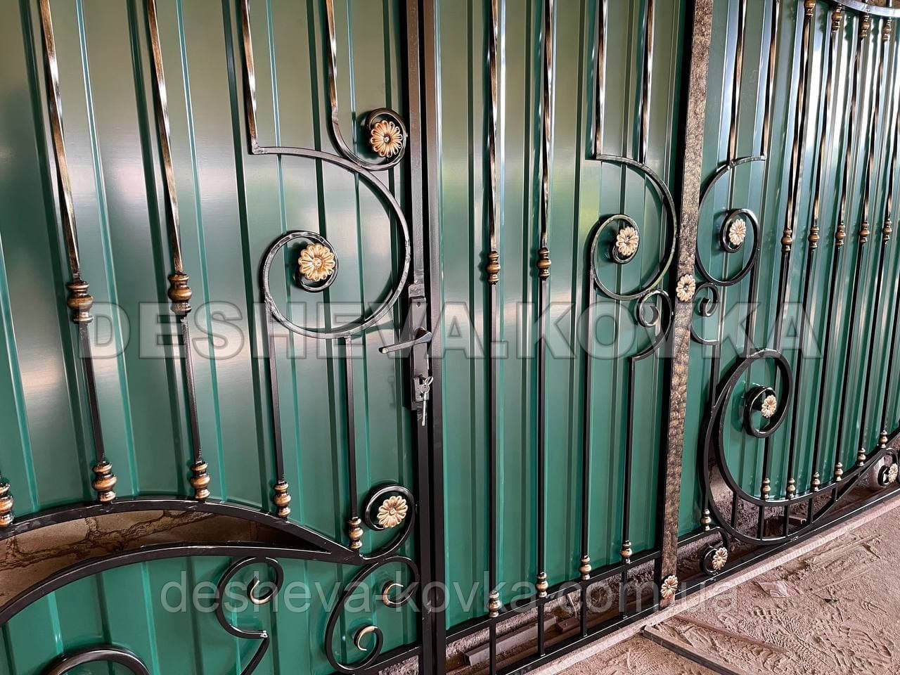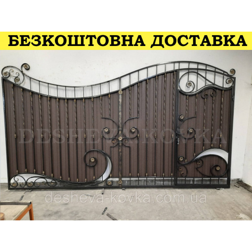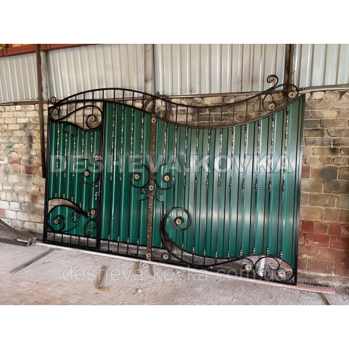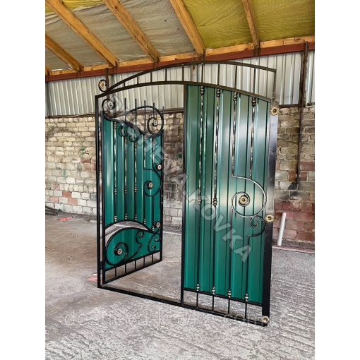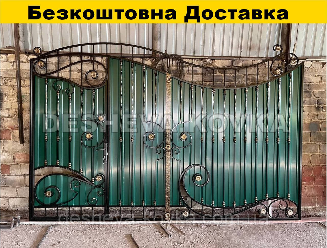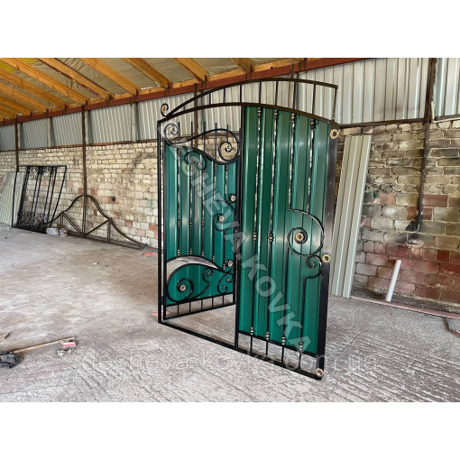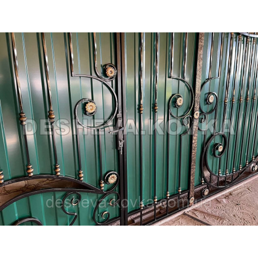 Детальні характеристики Кованые ворота из встроенной калиткой и профнастилом.