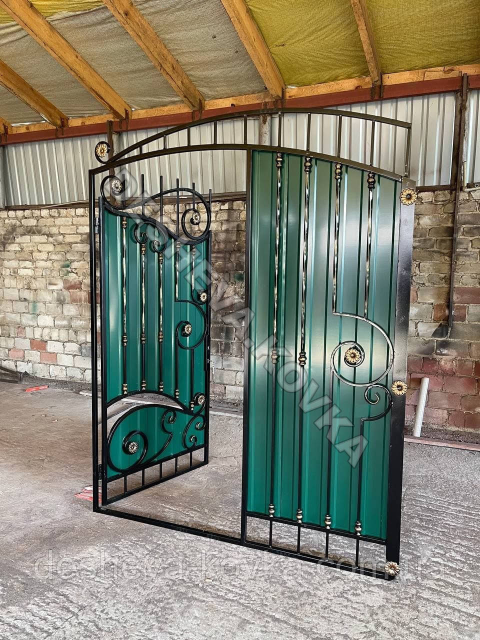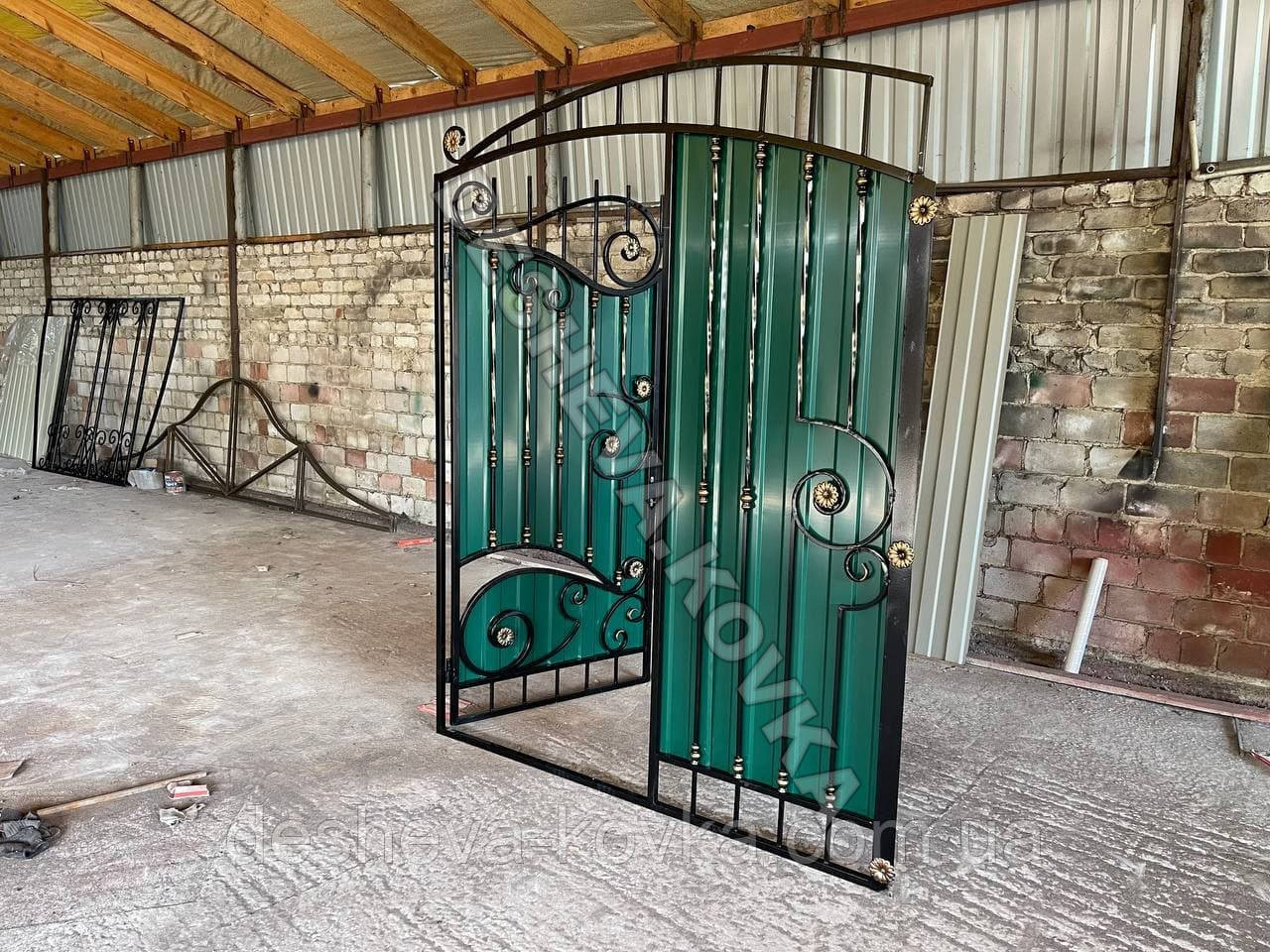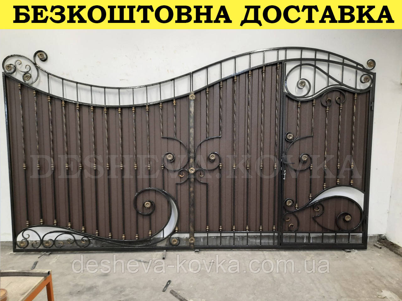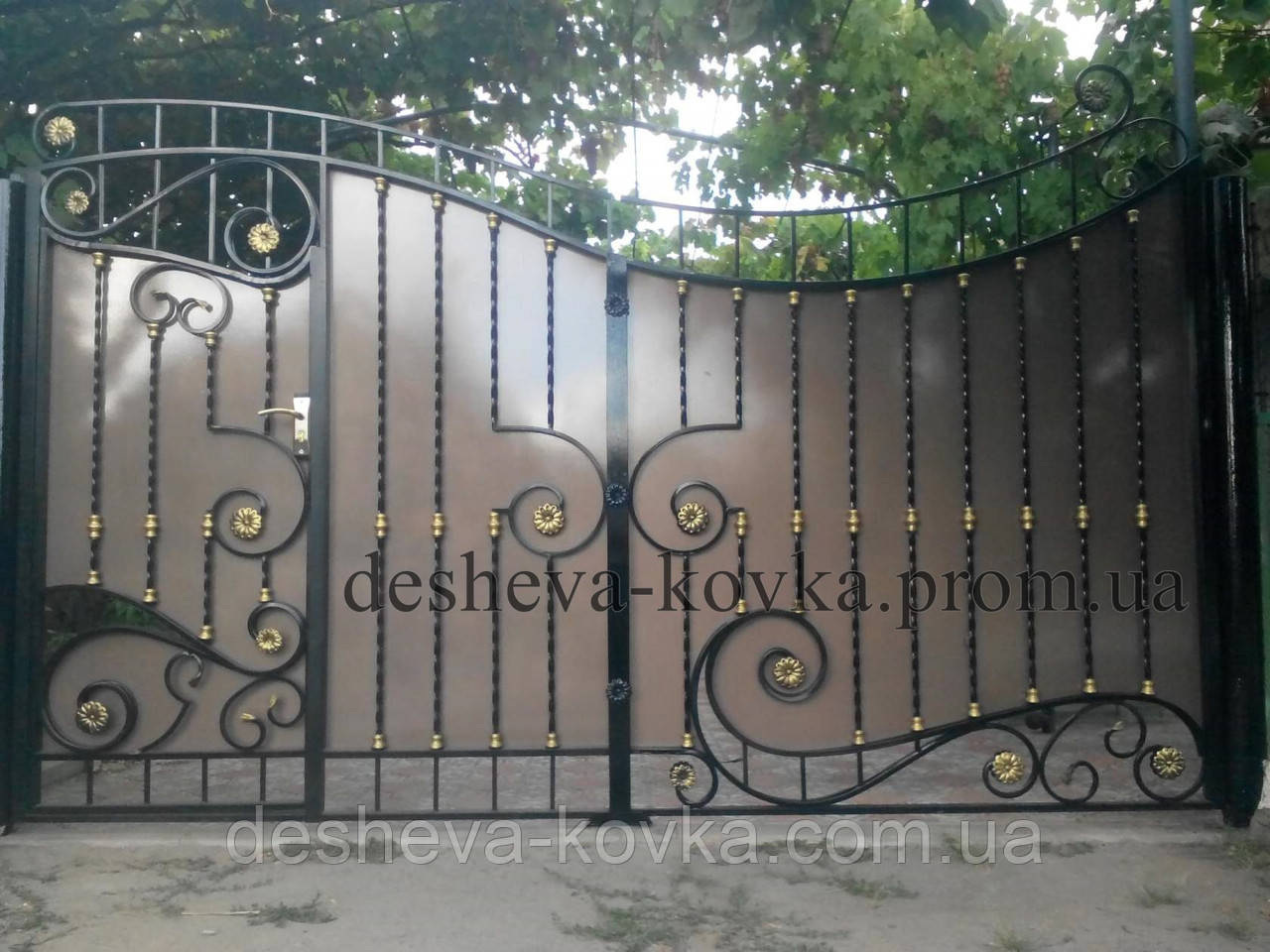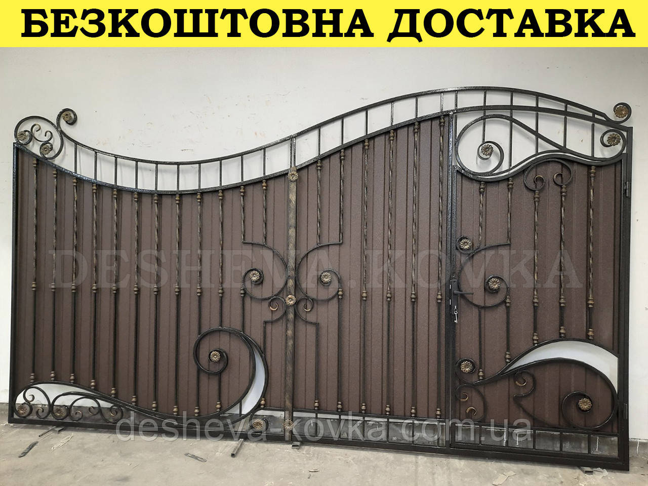 Детальні характеристики Кованые ворота из встроенной калиткой и профнастилом.