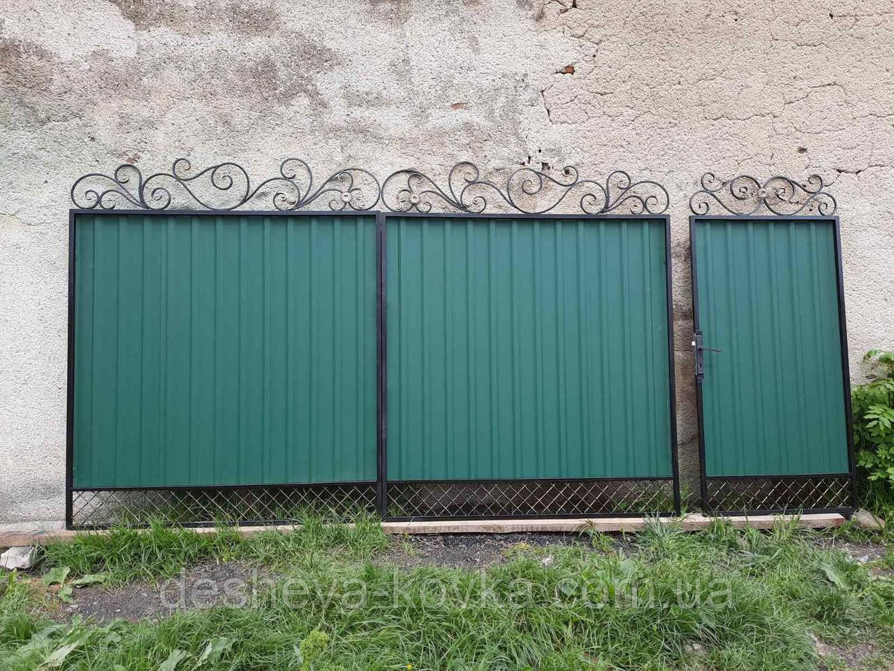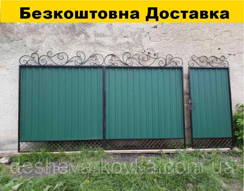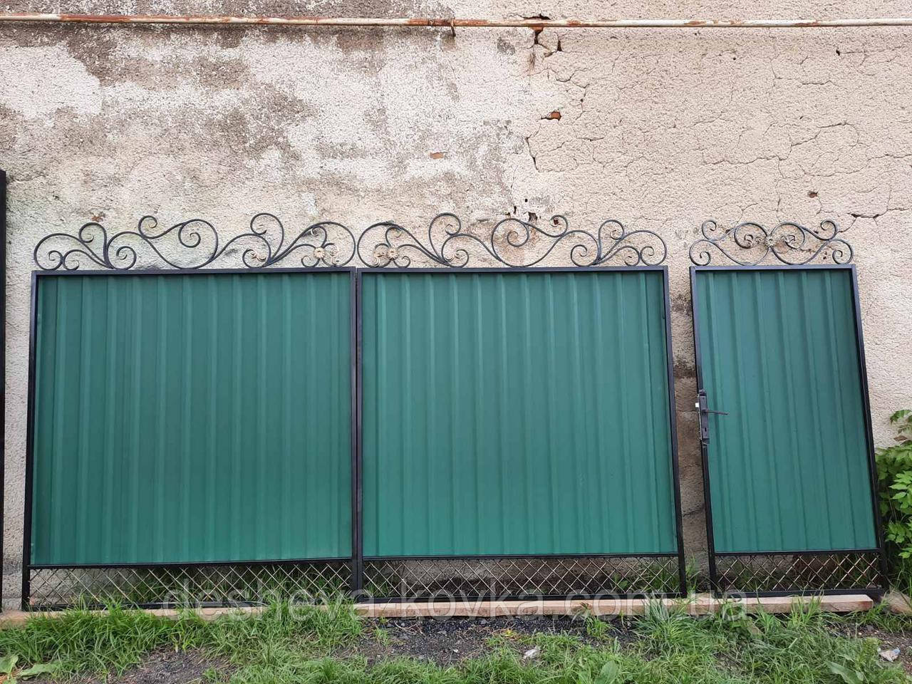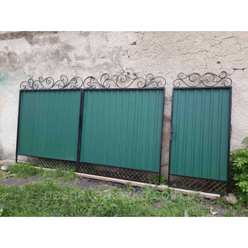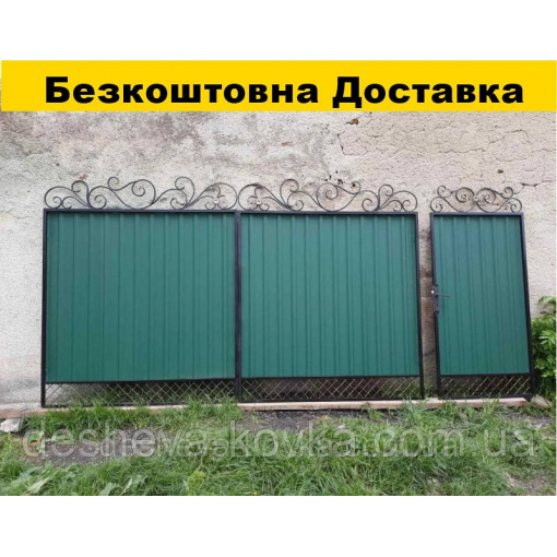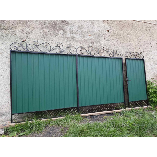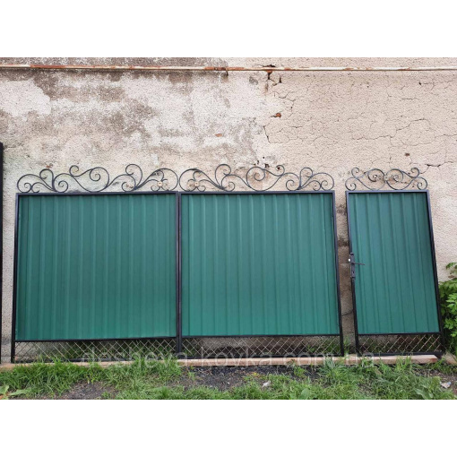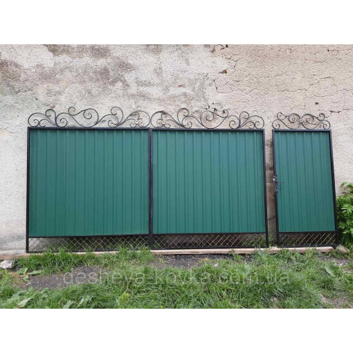 Детальні характеристики Ковані ворота із зеленим профнастилом та елементами кування.