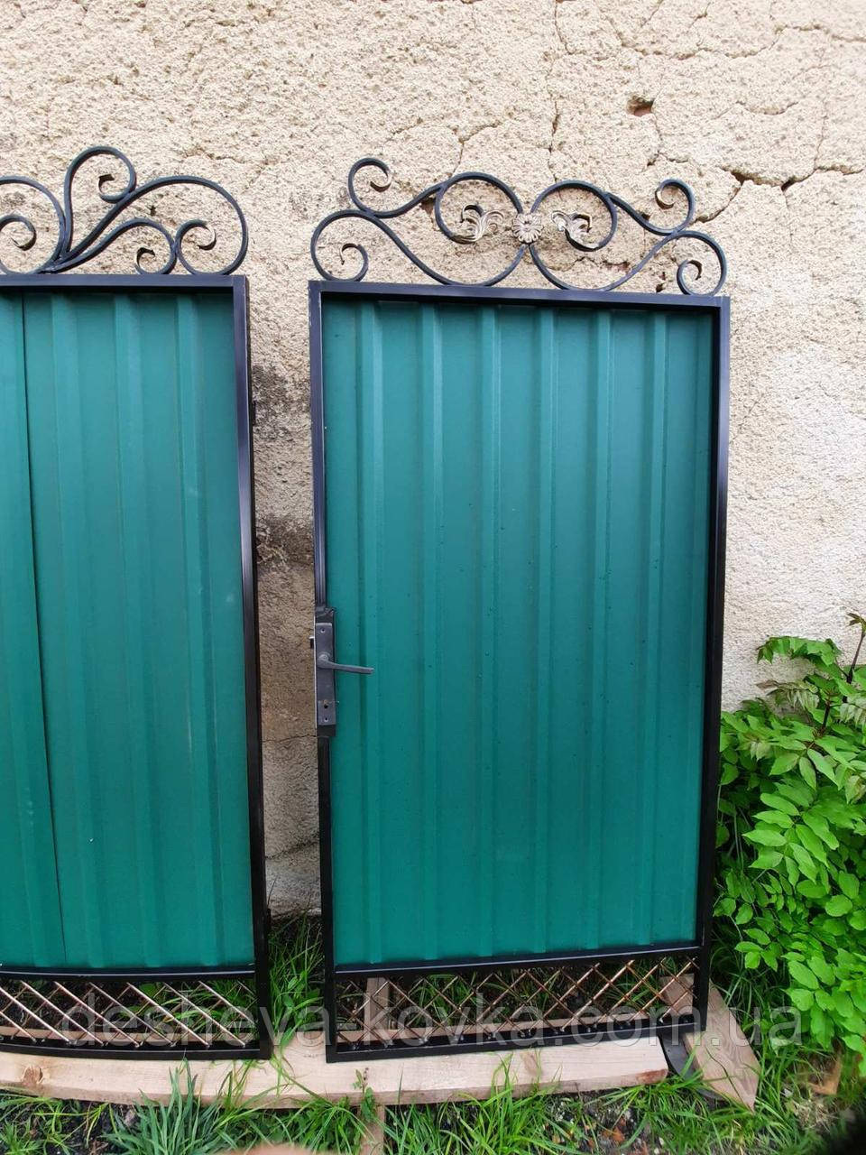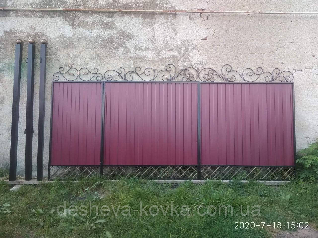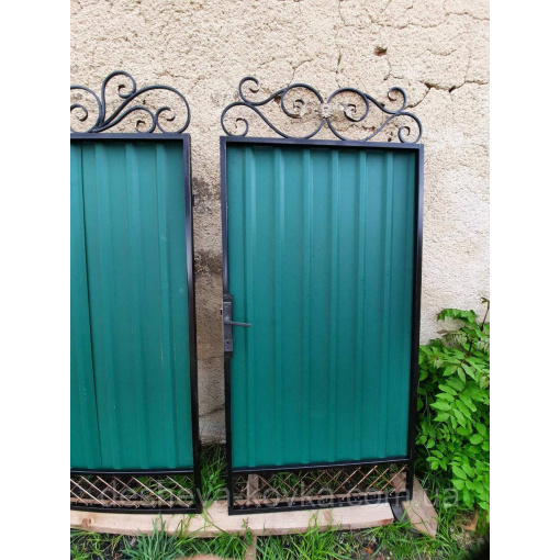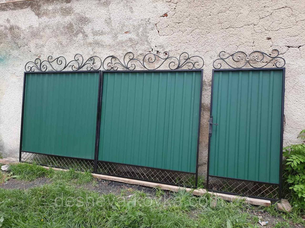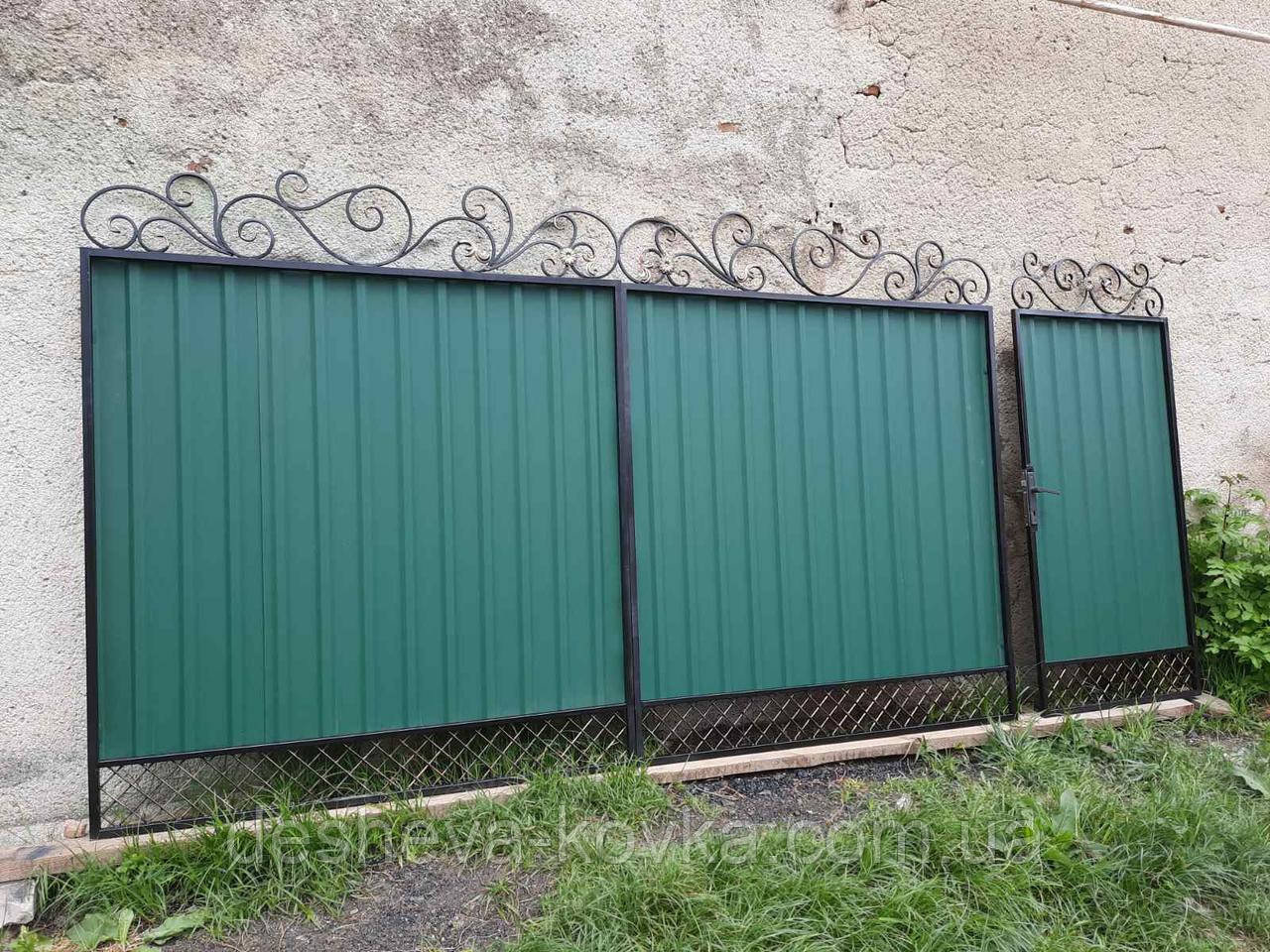 Детальні характеристики Ковані ворота із зеленим профнастилом та елементами кування.