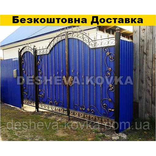 Ворота из элементами ковки из калиткой Код: А-01191 Мы изготовим ворота индивидуально по вашим размерам за 4 рабочих дня. Наши ворота производятся на современном оборудовании специалистами нашей компании, что гарантирует скорость и качество. Уличные ворота из профнастила отлично подходят для обустройства въезда во двор частного дома. Классические конструкции не зря пользуются спросом на протяжении нескольких веков: они хорошо выполняют свои функции, оставаясь простыми и удобными в использовании. Изделие может иметь любую форму и дизайн: из-за его технических особенностей ограничений в возможностях декорирования практически нет. БЕСПЛАТНАЯ доставка по всей Украине! (Доставка курьером до Вашего дома, в любой город/село Украины.) По желанию заказчика калитка может быть справой или с левой стороны. Стандартные размеры: Ворота: 3.4м х 1.7м по столбикам. Калитка: 0.9м х 1.7м по столбикам. Также мы можем изготовить ворота индивидуально по размерам заказчика. Цвет профнастила по выбору! Наша компания является одним из самых больших производств на рынке Украины. Звоните и мы Вас проконсультируем +380965364101.