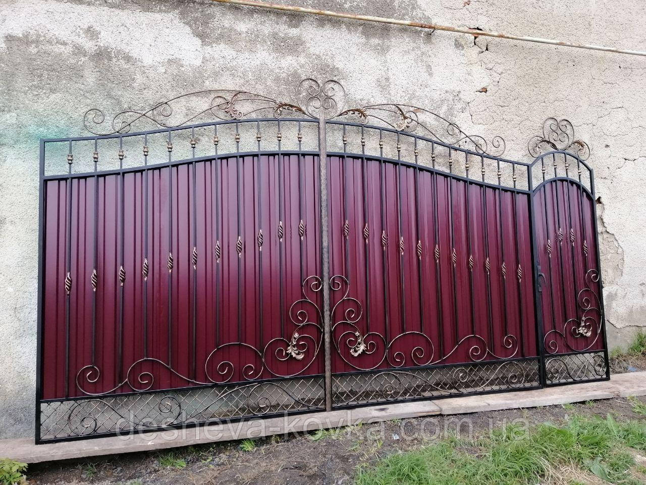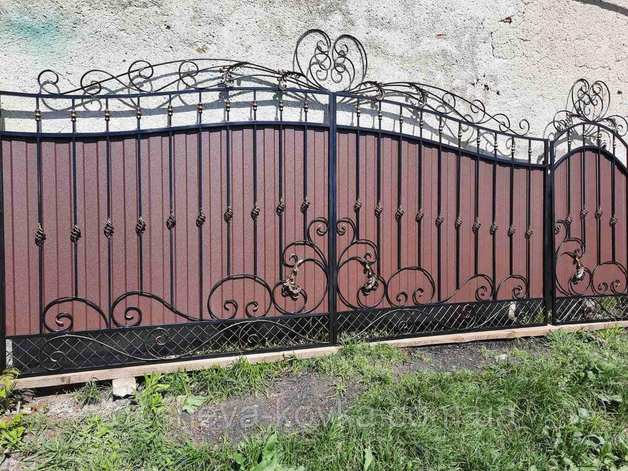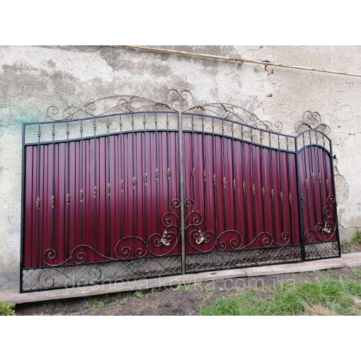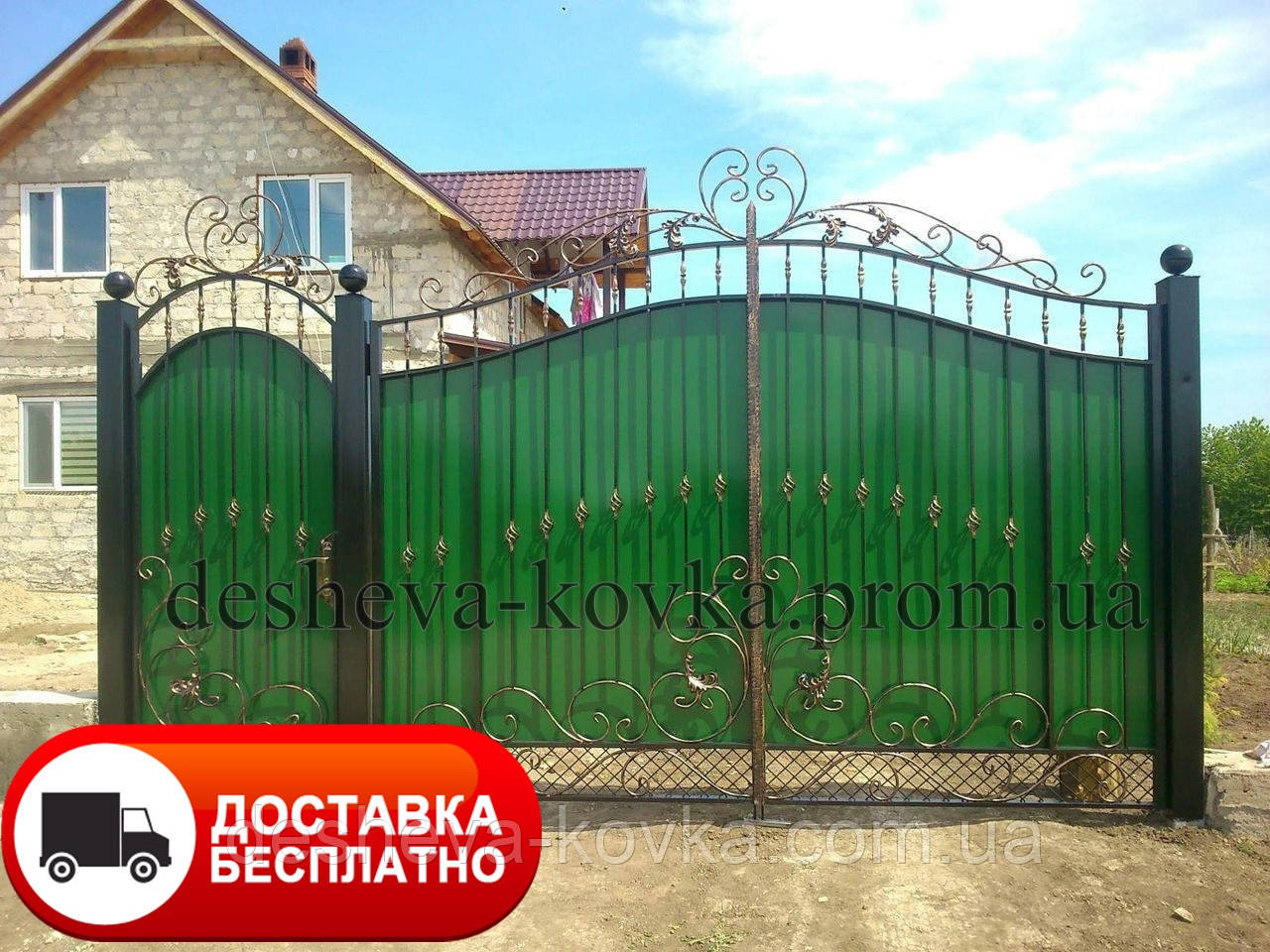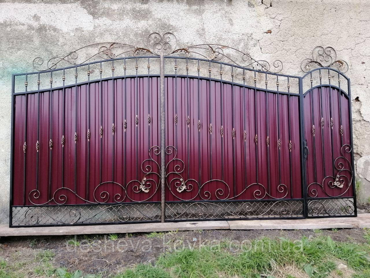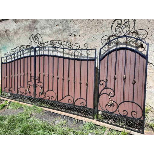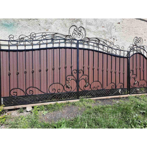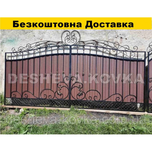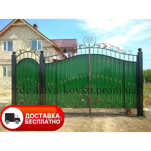 Ворота кованые из профнастилом Код: А-0159 Мы изготовим ворота индивидуально по вашим размерам за 4 рабочих дня. Наши ворота производятся на современном оборудовании специалистами нашей компании, что гарантирует скорость и качество. Уличные ворота из профнастила отлично подходят для обустройства въезда во двор частного дома. Классические конструкции не зря пользуются спросом на протяжении нескольких веков: они хорошо выполняют свои функции, оставаясь простыми и удобными в использовании. Изделие может иметь любую форму и дизайн: из-за его технических особенностей ограничений в возможностях декорирования практически нет. БЕСПЛАТНАЯ доставка по всей Украине! (Доставка курьером до Вашего дома, в любой город/село Украины.) По желанию заказчика калитка может быть справой или с левой стороны. Стандартные размеры: Ворота: 3.4м х 1.7м по столбикам. Калитка: 0.9м х 1.7м по столбикам. Также мы можем изготовить ворота индивидуально по размерам заказчика. Цвет профнастила по выбору! Наша компания является одним из самых больших производств на рынке Украины. Звоните и мы Вас проконсультируем +380965364101.