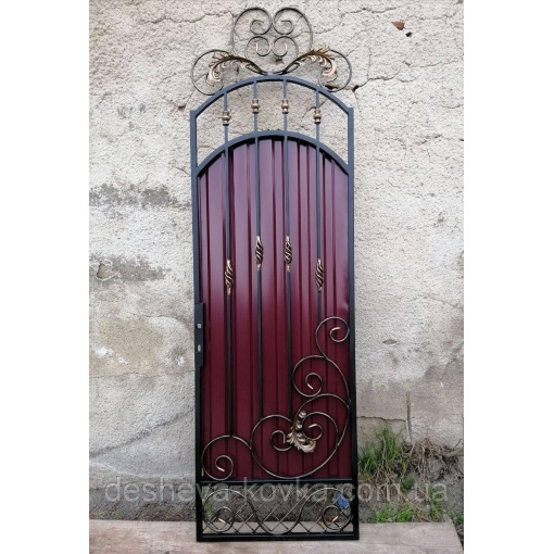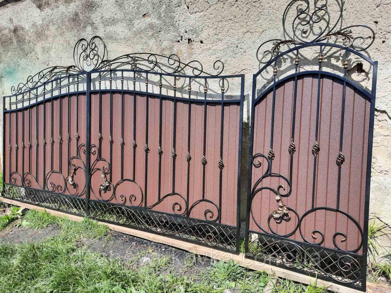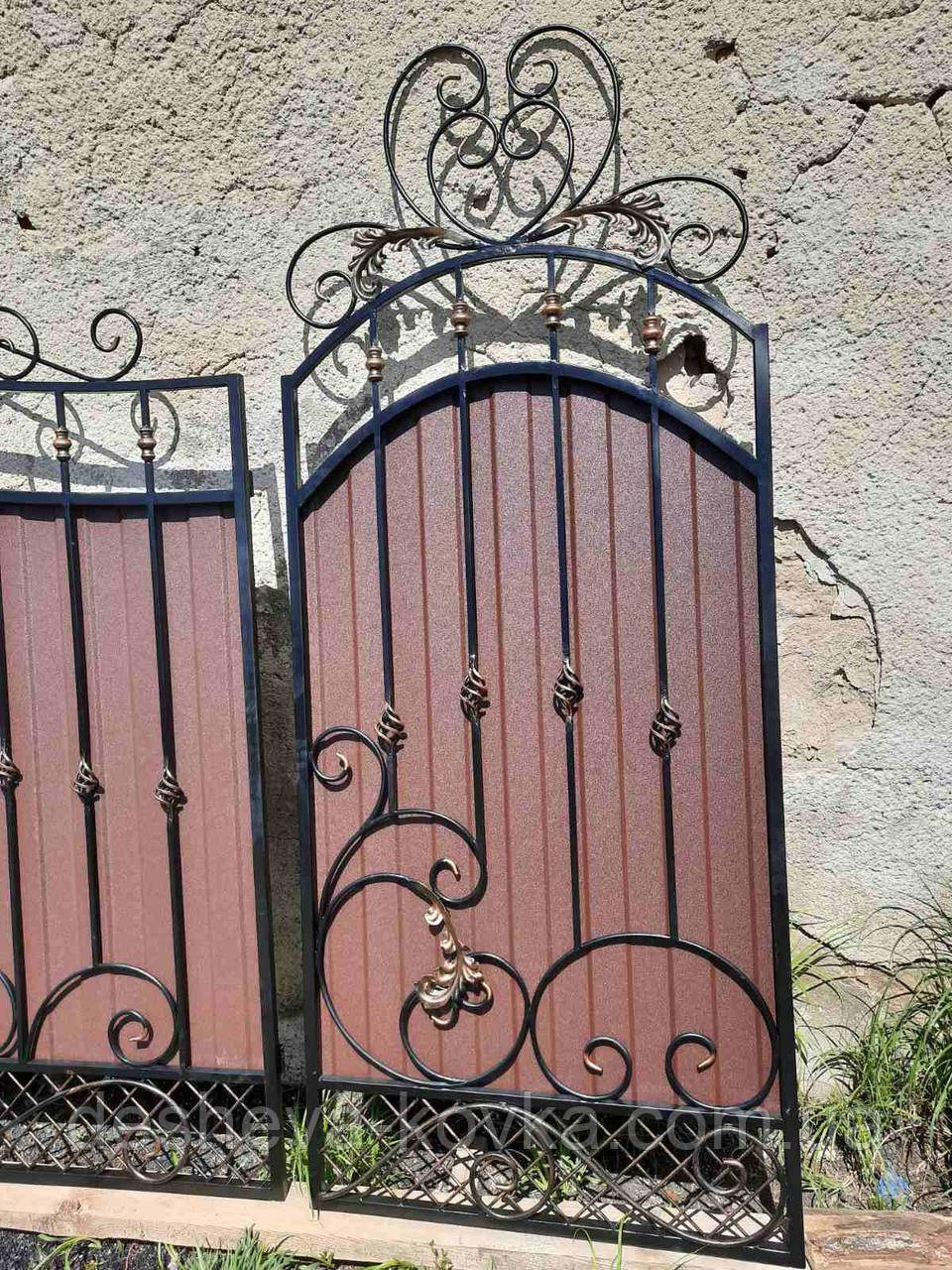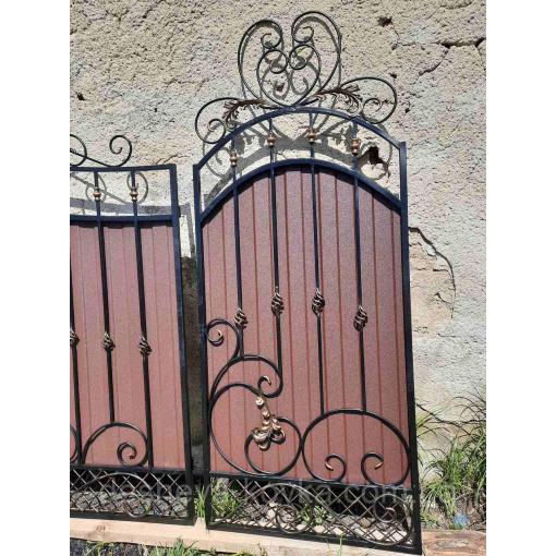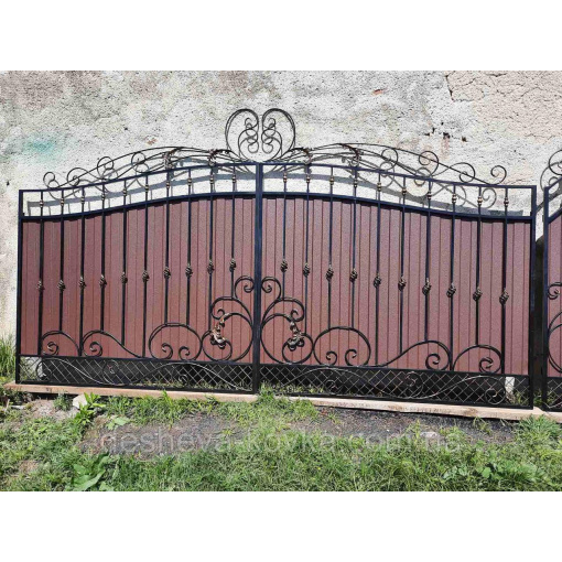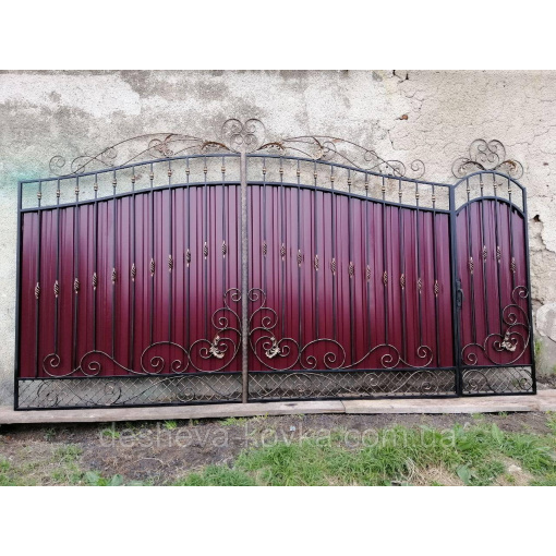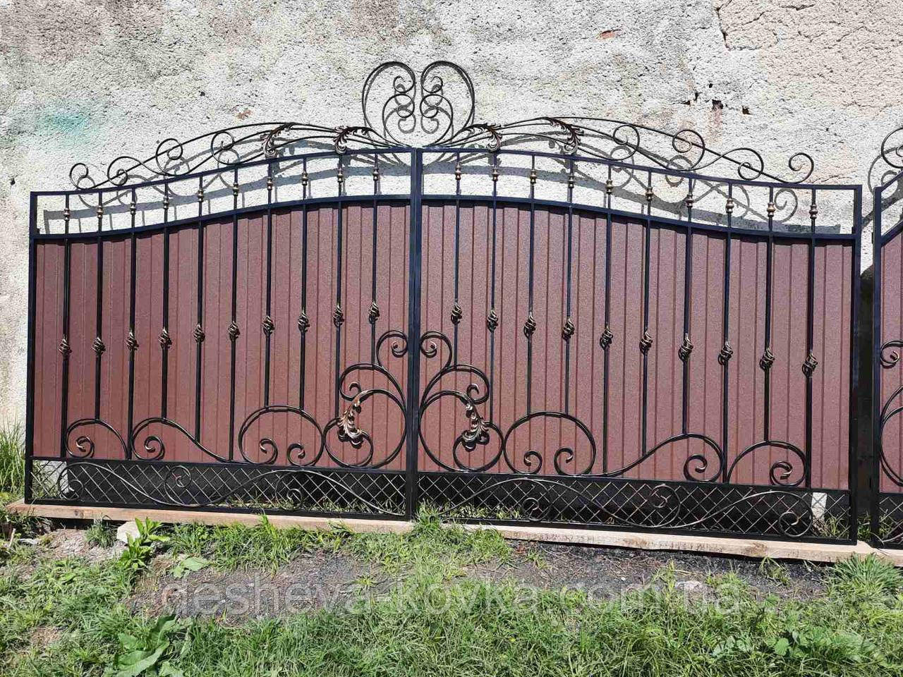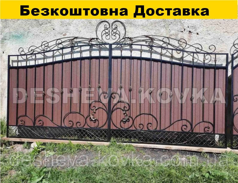Ворота кованые из профнастилом Код: А-0159 Мы изготовим ворота индивидуально по вашим размерам за 4 рабочих дня. Наши ворота производятся на современном оборудовании специалистами нашей компании, что гарантирует скорость и качество. Уличные ворота из профнастила отлично подходят для обустройства въезда во двор частного дома. Классические конструкции не зря пользуются спросом на протяжении нескольких веков: они хорошо выполняют свои функции, оставаясь простыми и удобными в использовании. Изделие может иметь любую форму и дизайн: из-за его технических особенностей ограничений в возможностях декорирования практически нет. БЕСПЛАТНАЯ доставка по всей Украине! (Доставка курьером до Вашего дома, в любой город/село Украины.) По желанию заказчика калитка может быть справой или с левой стороны. Стандартные размеры: Ворота: 3.4м х 1.7м по столбикам. Калитка: 0.9м х 1.7м по столбикам. Также мы можем изготовить ворота индивидуально по размерам заказчика. Цвет профнастила по выбору! Наша компания является одним из самых больших производств на рынке Украины. Звоните и мы Вас проконсультируем +380965364101.