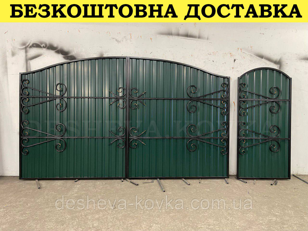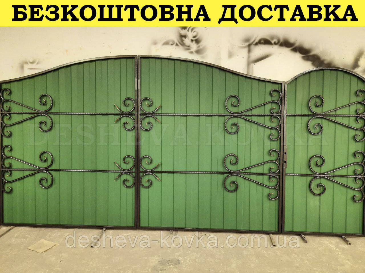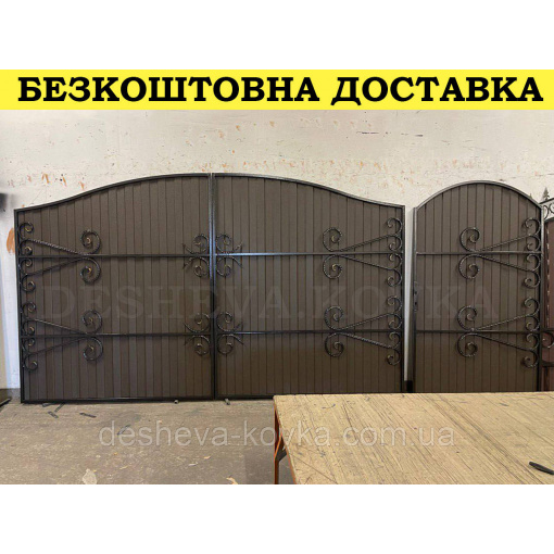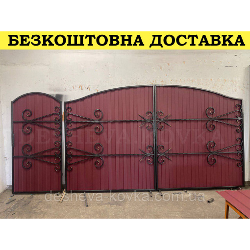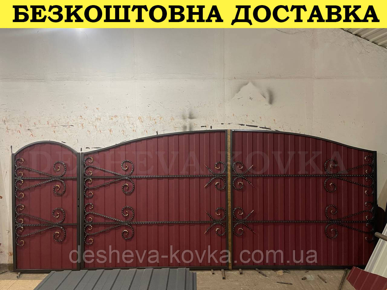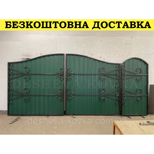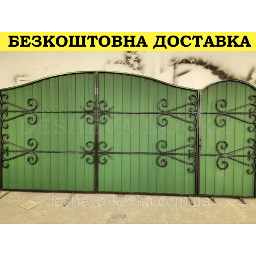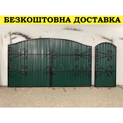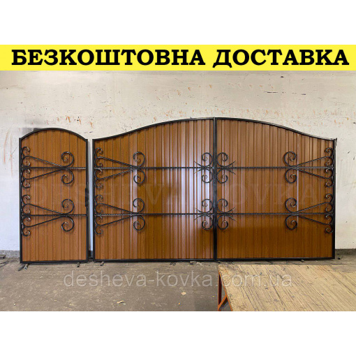 Ворота с ковкой и калиткой Код: А-0101 Мы изготовим ворота индивидуально по вашим размерам за 4 рабочих дня. Наши ворота производятся на современном оборудовании специалистами нашей компании, что гарантирует скорость и качество. Уличные ворота из профнастила отлично подходят для обустройства въезда во двор частного дома. Классические конструкции не зря пользуются спросом на протяжении нескольких веков: они хорошо выполняют свои функции, оставаясь простыми и удобными в использовании. Изделие может иметь любую форму и дизайн: из-за его технических особенностей ограничений в возможностях декорирования практически нет. БЕСПЛАТНАЯ доставка по всей Украине! (Доставка курьером до Вашего дома, в любой город/село Украины.) По желанию заказчика калитка может быть справой или с левой стороны. Стандартные размеры: Ворота: 3.4м х 1.7м по столбикам. Калитка: 0.9м х 1.7м по столбикам. Также мы можем изготовить ворота индивидуально по размерам заказчика. Цвет профнастила по выбору! Наша компания является одним из самых больших производств на рынке Украины. Звоните и мы Вас проконсультируем +380965364101.
