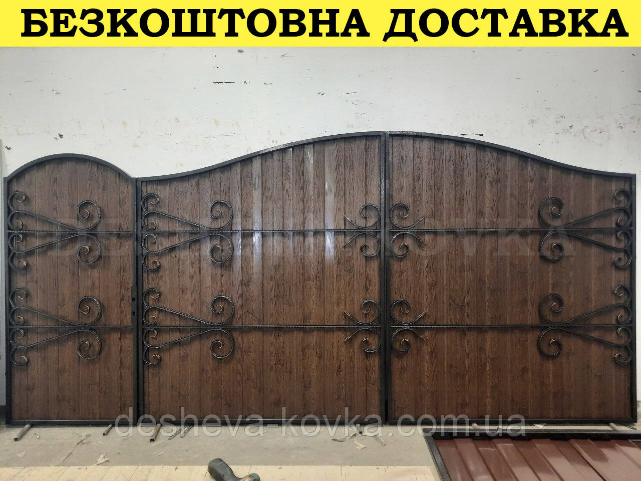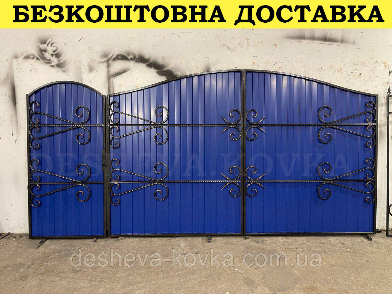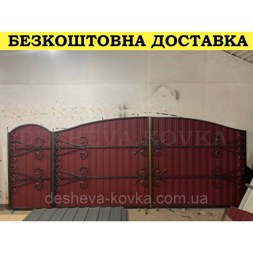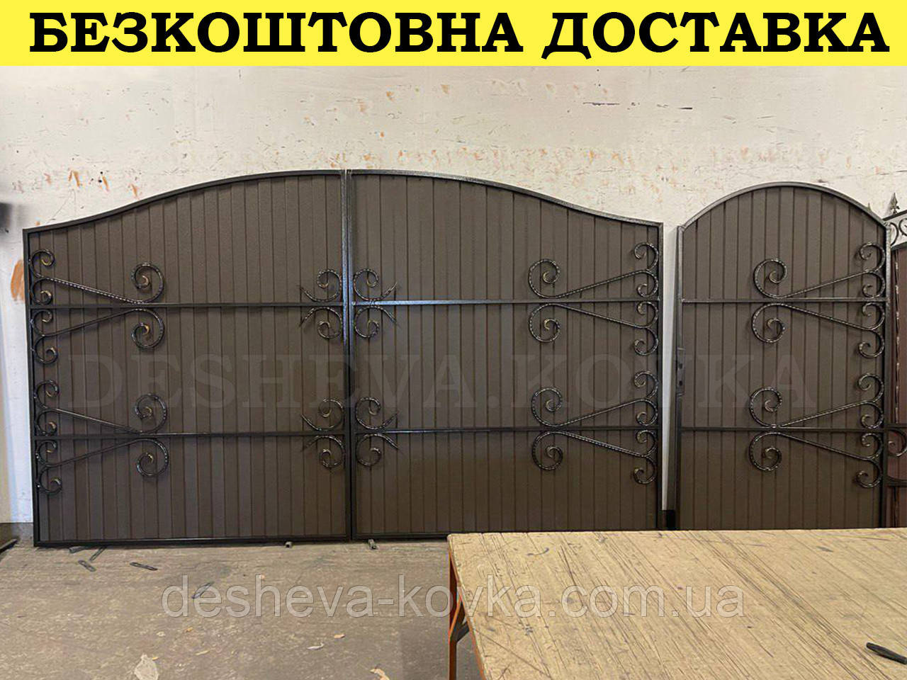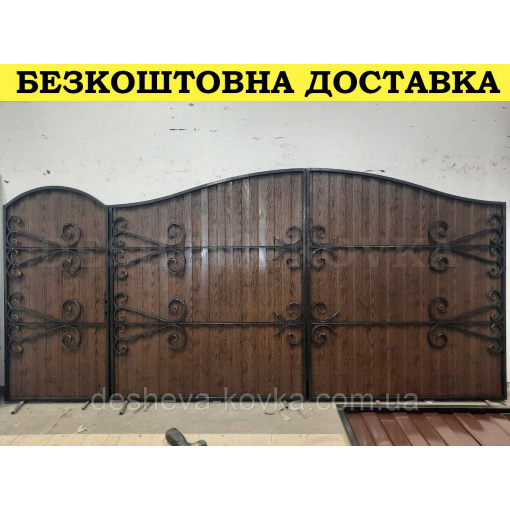 Ворота с ковкой и калиткой Код: А-0101 Мы изготовим ворота индивидуально по вашим размерам за 4 рабочих дня. Наши ворота производятся на современном оборудовании специалистами нашей компании, что гарантирует скорость и качество. Уличные ворота из профнастила отлично подходят для обустройства въезда во двор частного дома. Классические конструкции не зря пользуются спросом на протяжении нескольких веков: они хорошо выполняют свои функции, оставаясь простыми и удобными в использовании. Изделие может иметь любую форму и дизайн: из-за его технических особенностей ограничений в возможностях декорирования практически нет. БЕСПЛАТНАЯ доставка по всей Украине! (Доставка курьером до Вашего дома, в любой город/село Украины.) По желанию заказчика калитка может быть справой или с левой стороны. Стандартные размеры: Ворота: 3.4м х 1.7м по столбикам. Калитка: 0.9м х 1.7м по столбикам. Также мы можем изготовить ворота индивидуально по размерам заказчика. Цвет профнастила по выбору! Наша компания является одним из самых больших производств на рынке Украины. Звоните и мы Вас проконсультируем +380965364101.