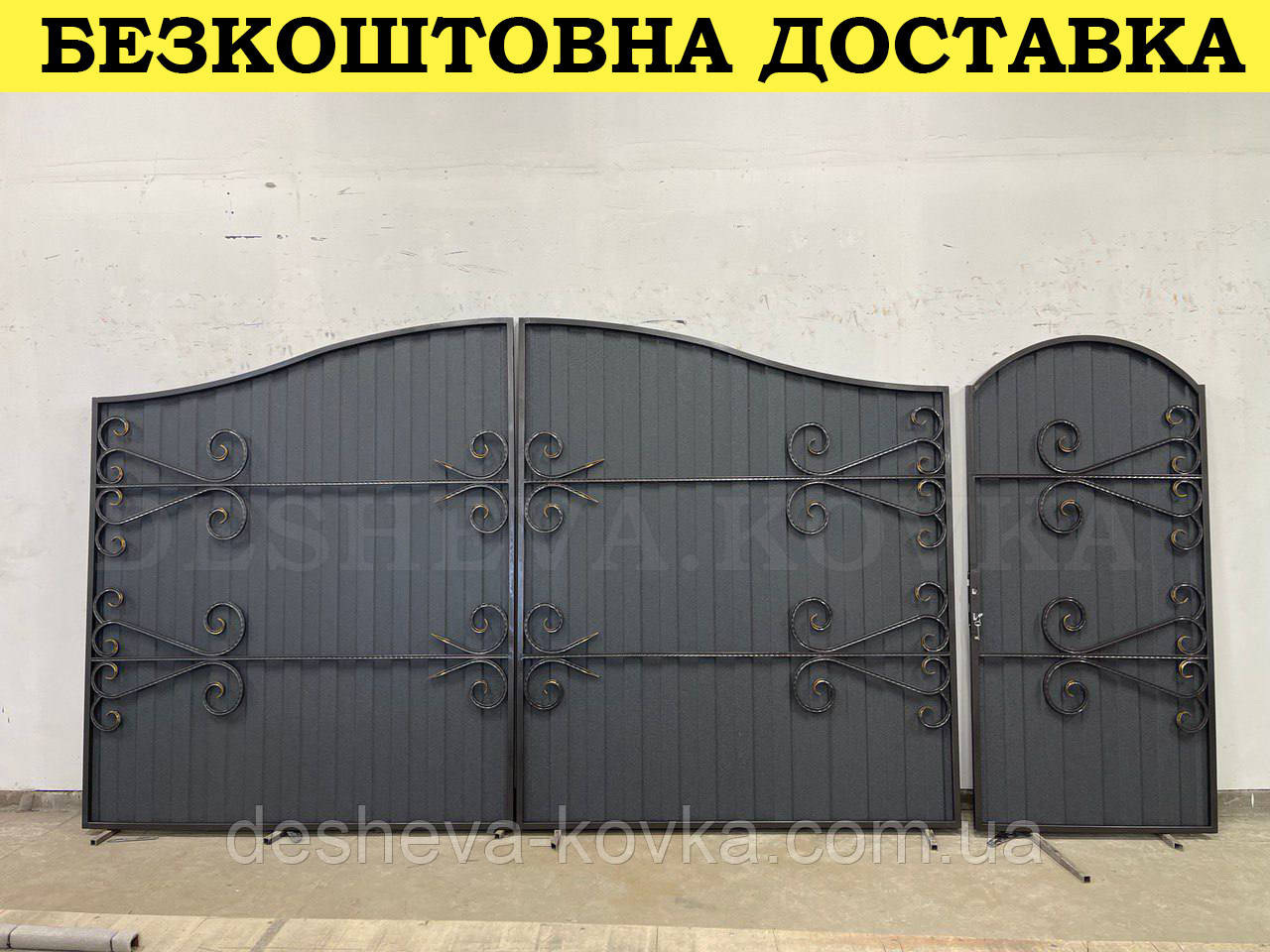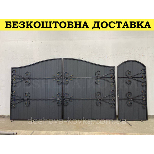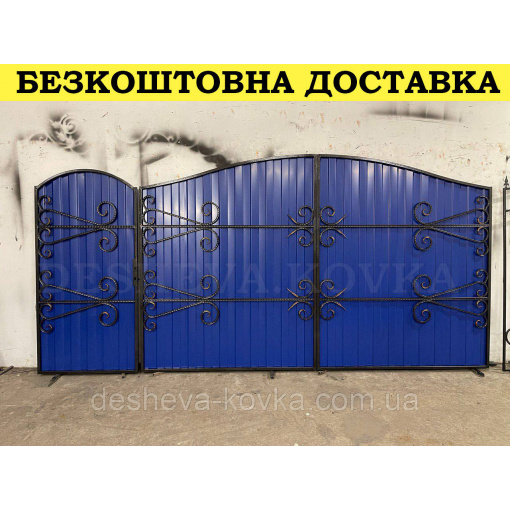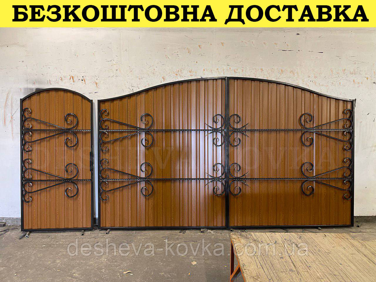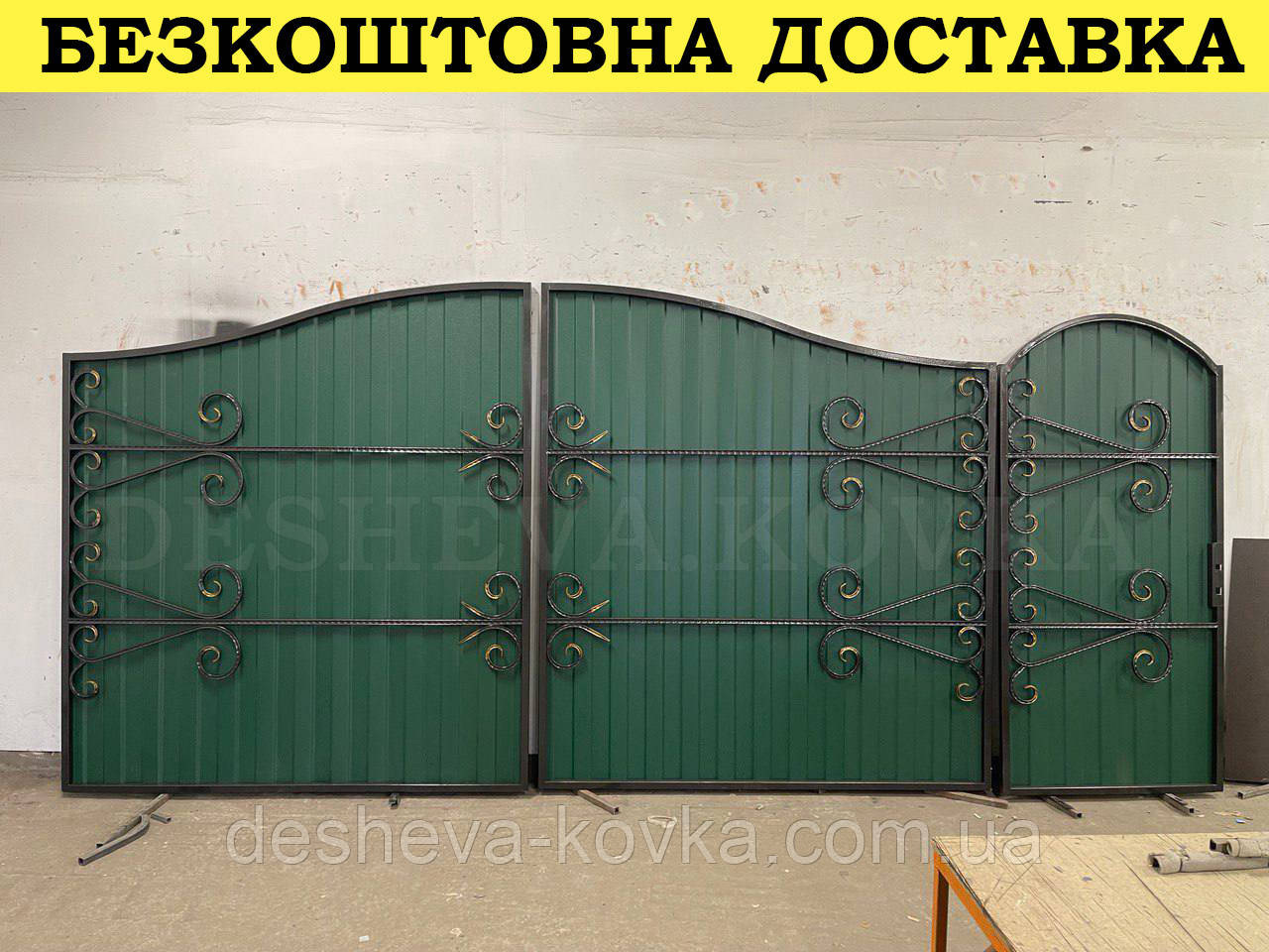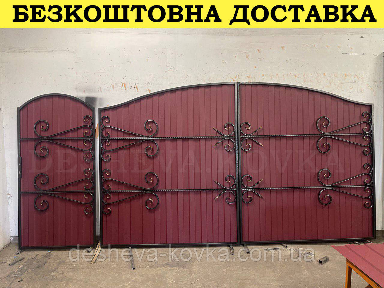 Ворота с ковкой и калиткой Код: А-0101 Мы изготовим ворота индивидуально по вашим размерам за 4 рабочих дня. Наши ворота производятся на современном оборудовании специалистами нашей компании, что гарантирует скорость и качество. Уличные ворота из профнастила отлично подходят для обустройства въезда во двор частного дома. Классические конструкции не зря пользуются спросом на протяжении нескольких веков: они хорошо выполняют свои функции, оставаясь простыми и удобными в использовании. Изделие может иметь любую форму и дизайн: из-за его технических особенностей ограничений в возможностях декорирования практически нет. БЕСПЛАТНАЯ доставка по всей Украине! (Доставка курьером до Вашего дома, в любой город/село Украины.) По желанию заказчика калитка может быть справой или с левой стороны. Стандартные размеры: Ворота: 3.4м х 1.7м по столбикам. Калитка: 0.9м х 1.7м по столбикам. Также мы можем изготовить ворота индивидуально по размерам заказчика. Цвет профнастила по выбору! Наша компания является одним из самых больших производств на рынке Украины. Звоните и мы Вас проконсультируем +380965364101.